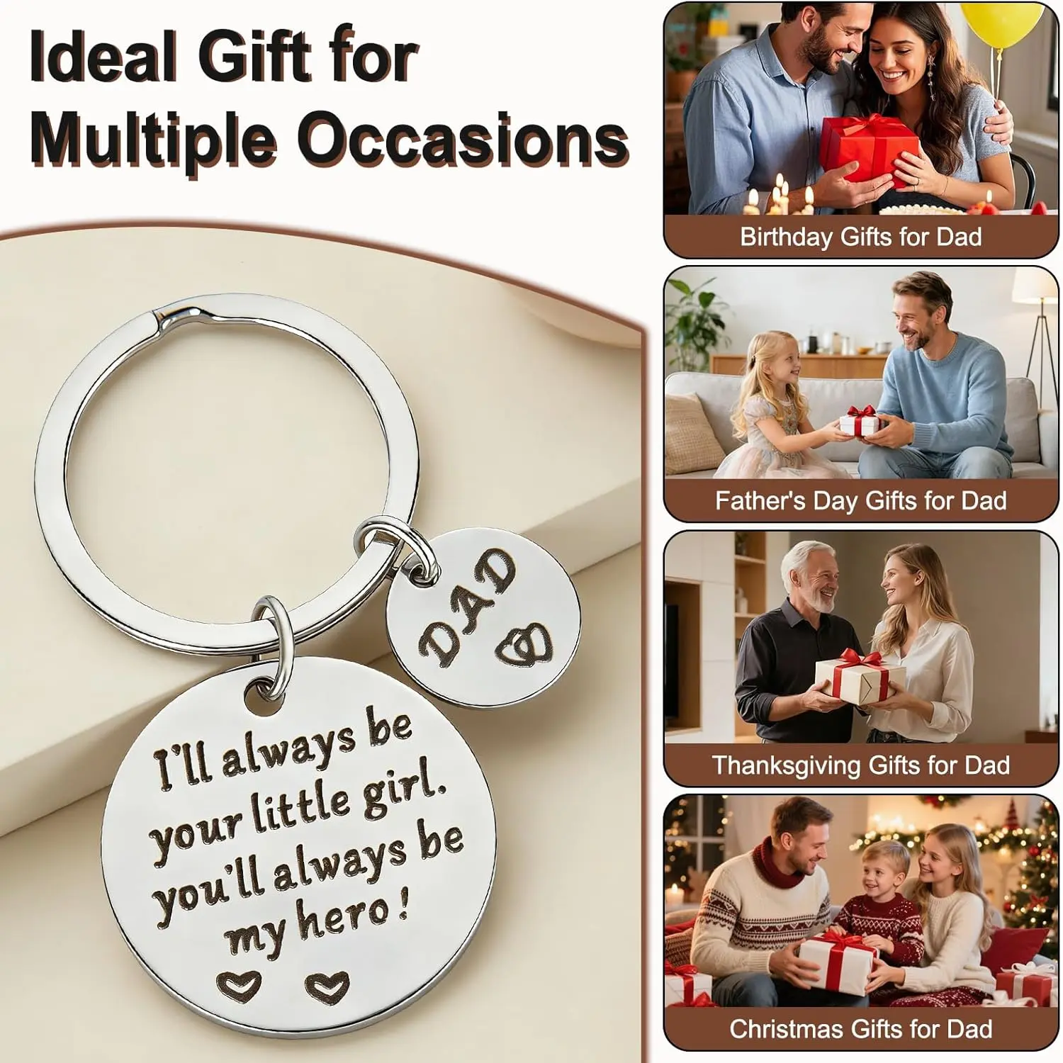 Keychain for Dad: This daughter to dad keychain is engraved with "I'll always be your little girl. You'll always be my hero!" It captures a daughter’s admiration and dependence on her father, making it a perfect way to express gratitude and love.