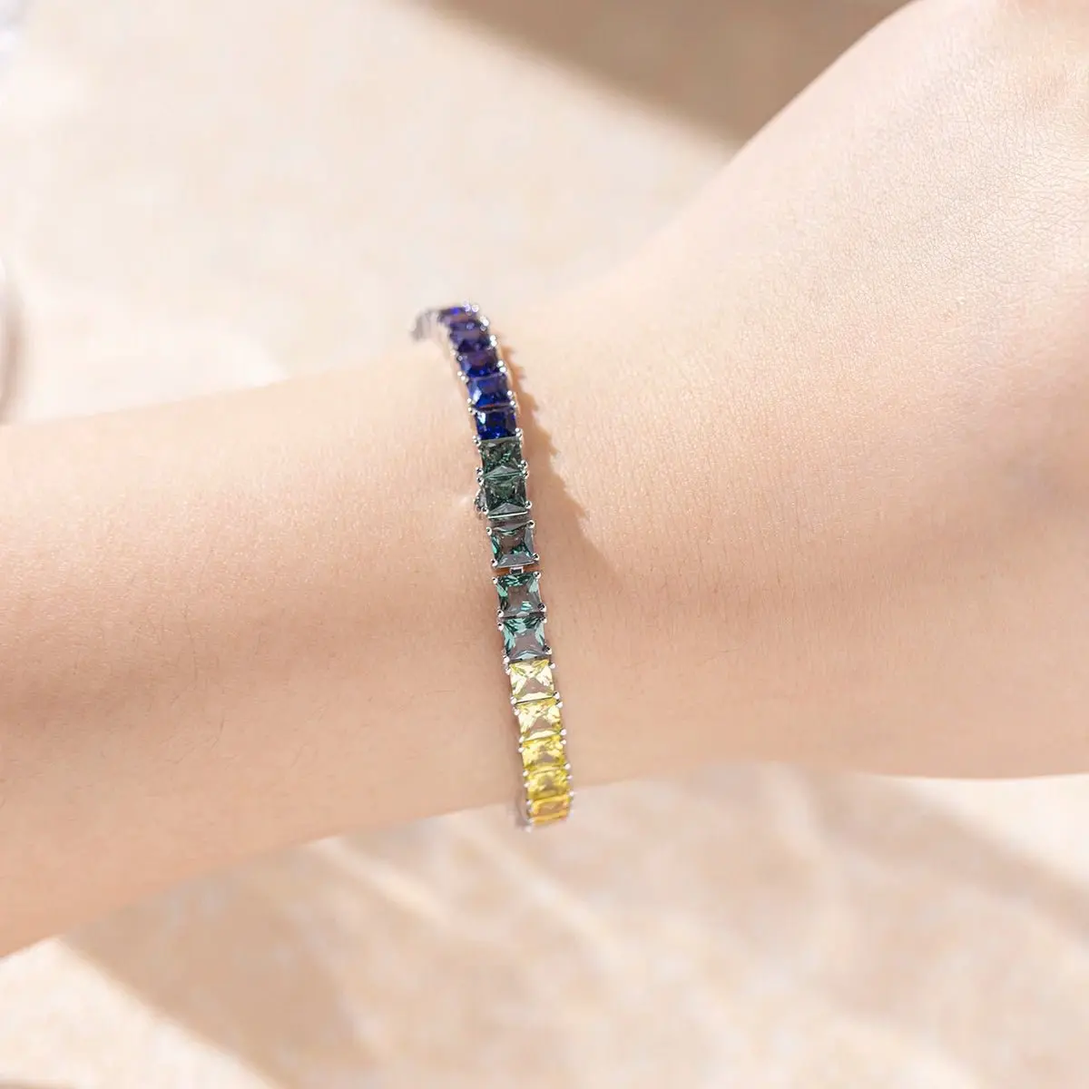 Shine like no one else with Lunev's 4mm Rainbow Spectrum Moissanite Bracelet—lab-grown VVS stones in a dazzling color-shift pave that catches every light angle. Crafted on 925 sterling silver, hypoallergenic and gold-plated, this slim chain flexes hip-hop edge with subtle elegance.