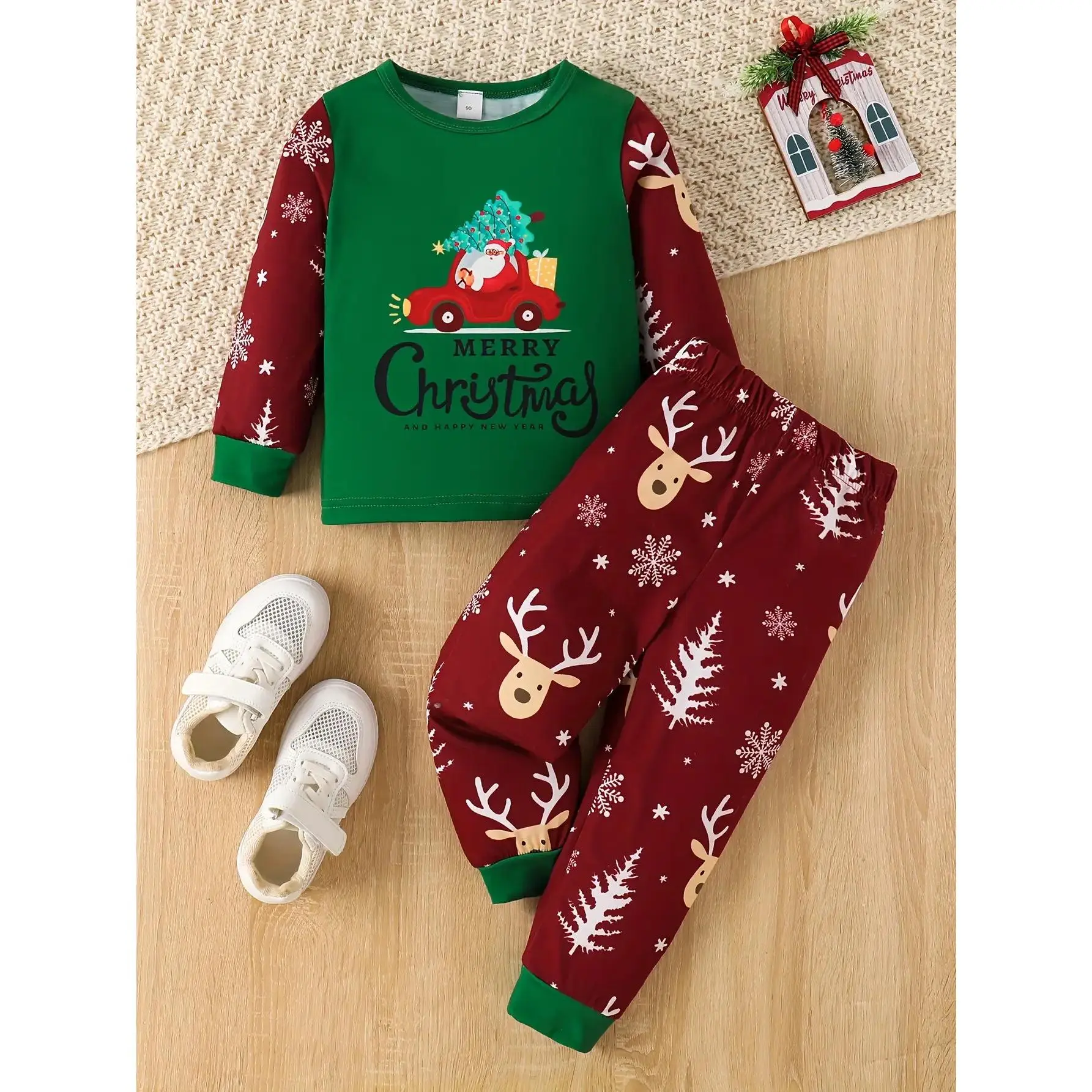 5. Children's Autumn Winter Christmas Santa Print Crew Neck Set, Toddler Boys Long Pants Two-Piece Set, Perfect for Outdoor