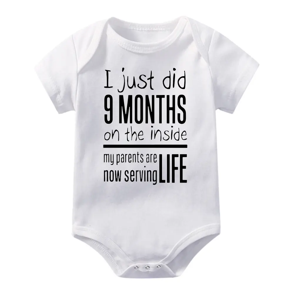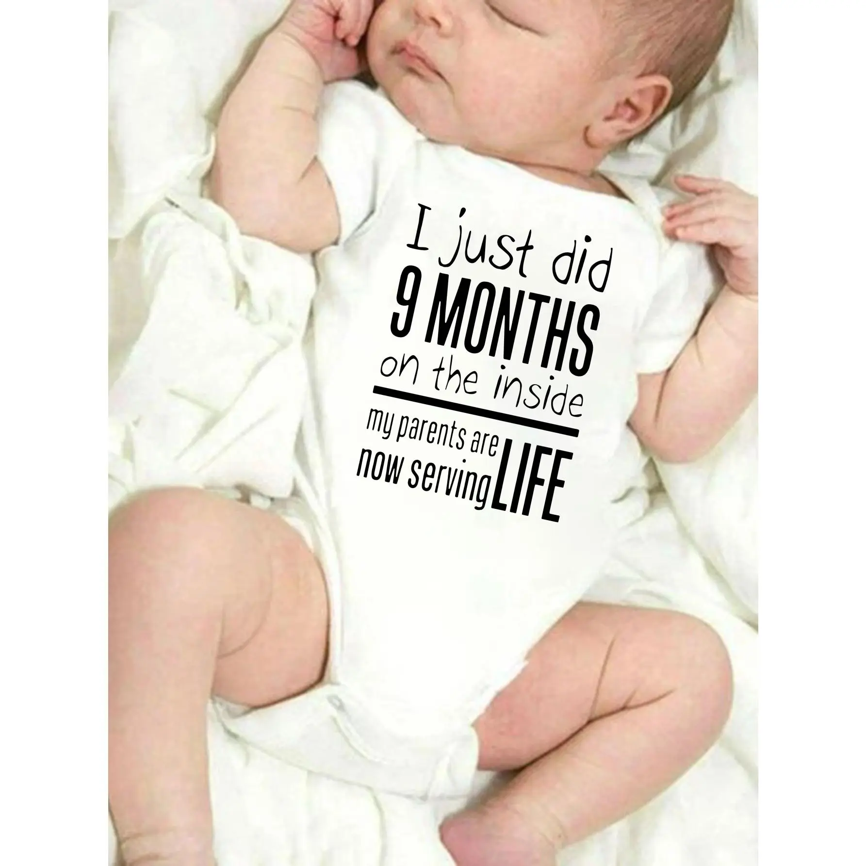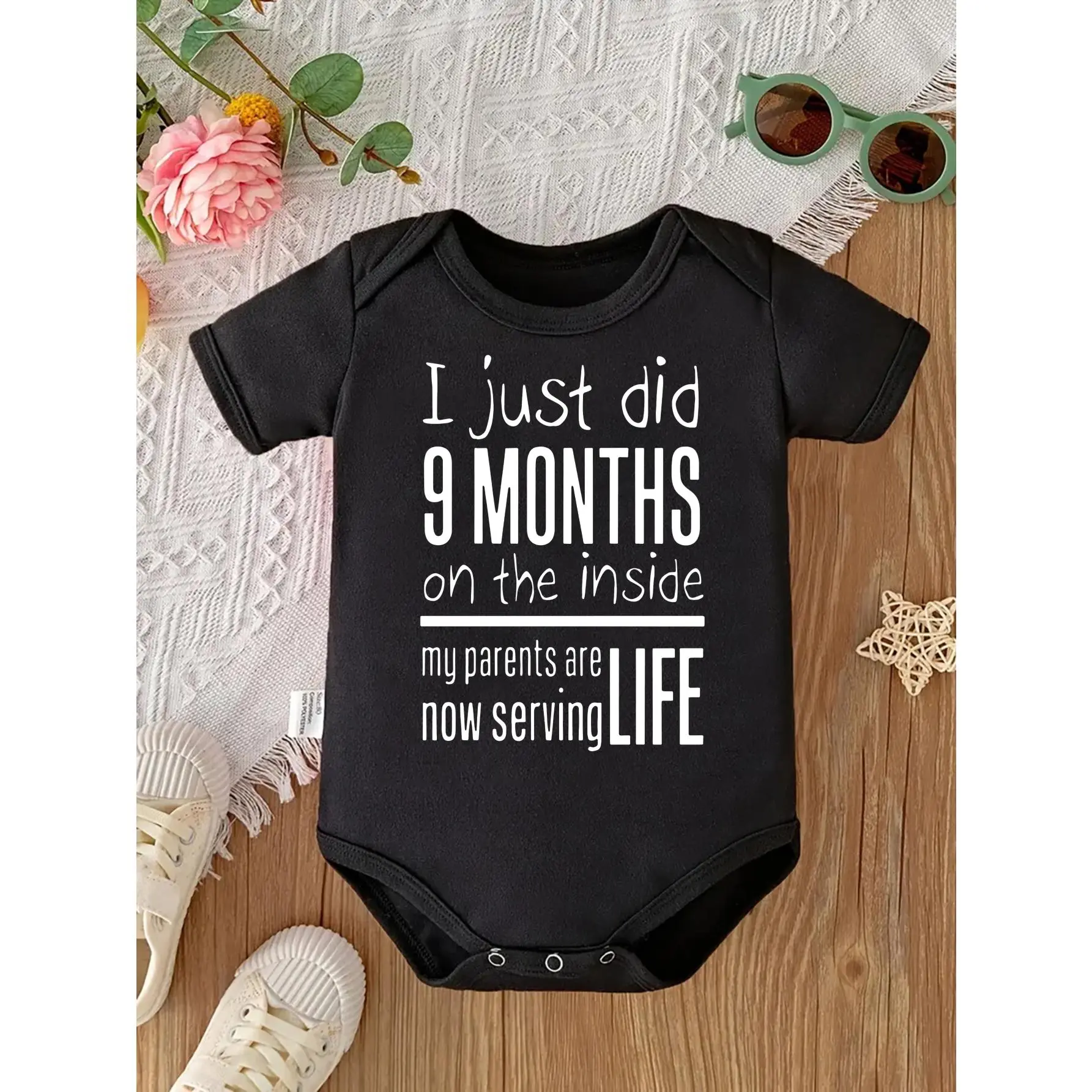 Baby Bodysuit With I Just Did 9 Months On ThInsidMy Parents ArNow Serving LifPrint Soft VersatilRound Neck Button Detail Regular Fit All Seasons Knitted Fabric Onesie