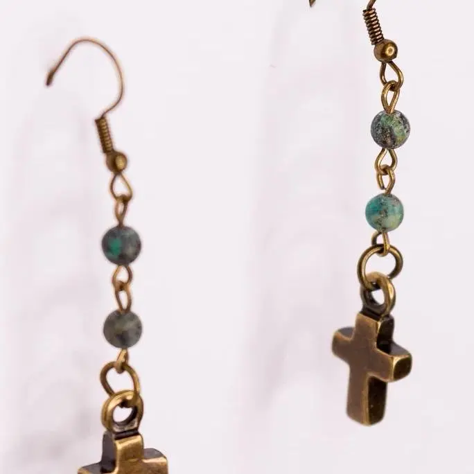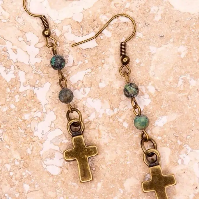 * Elegant Design: These fishhook dangle earrings feature two small African Turquoise stone beads. A small cross charm adds a touch of faith. Perfect for those who appreciate subtle elegance.