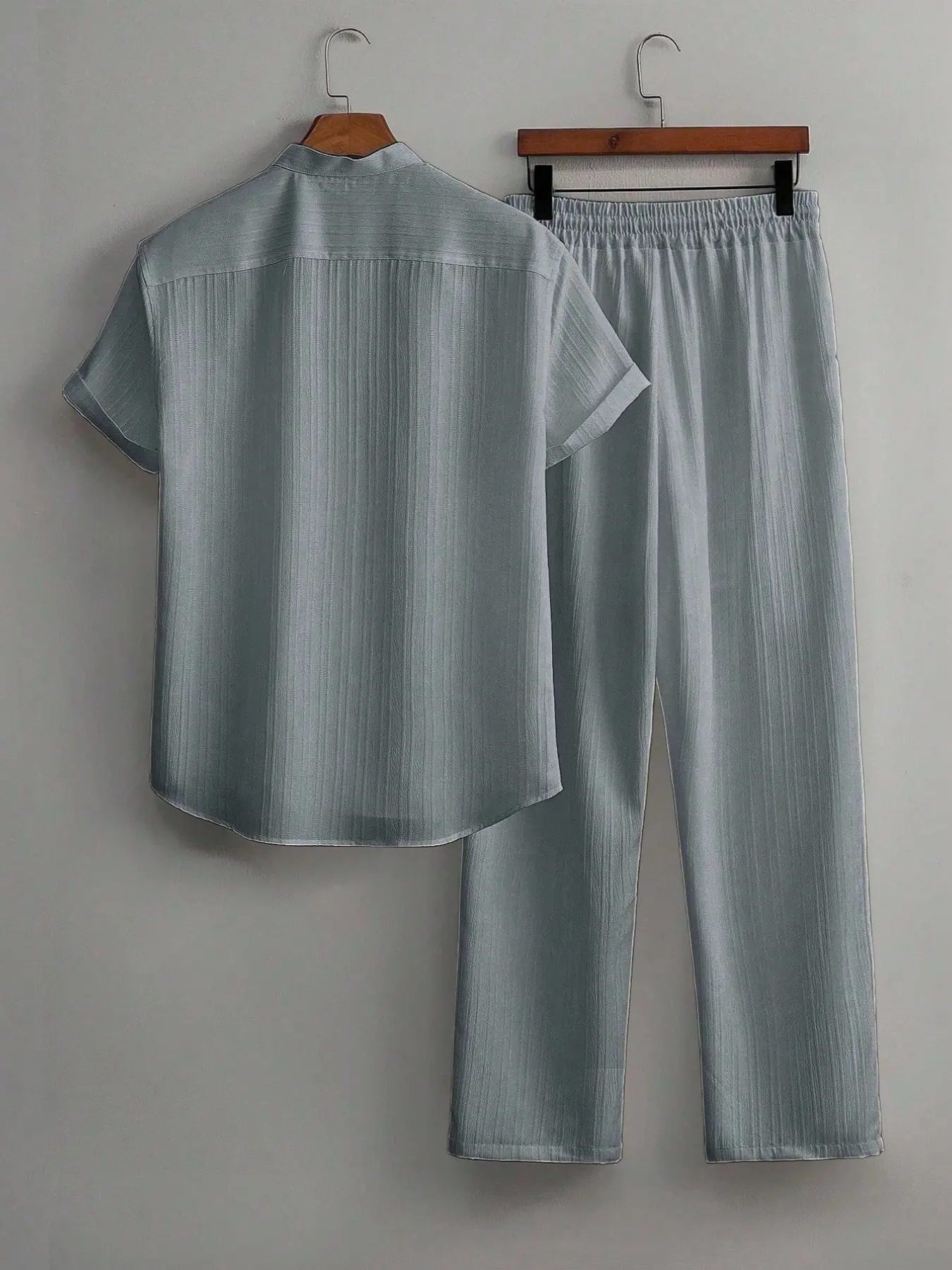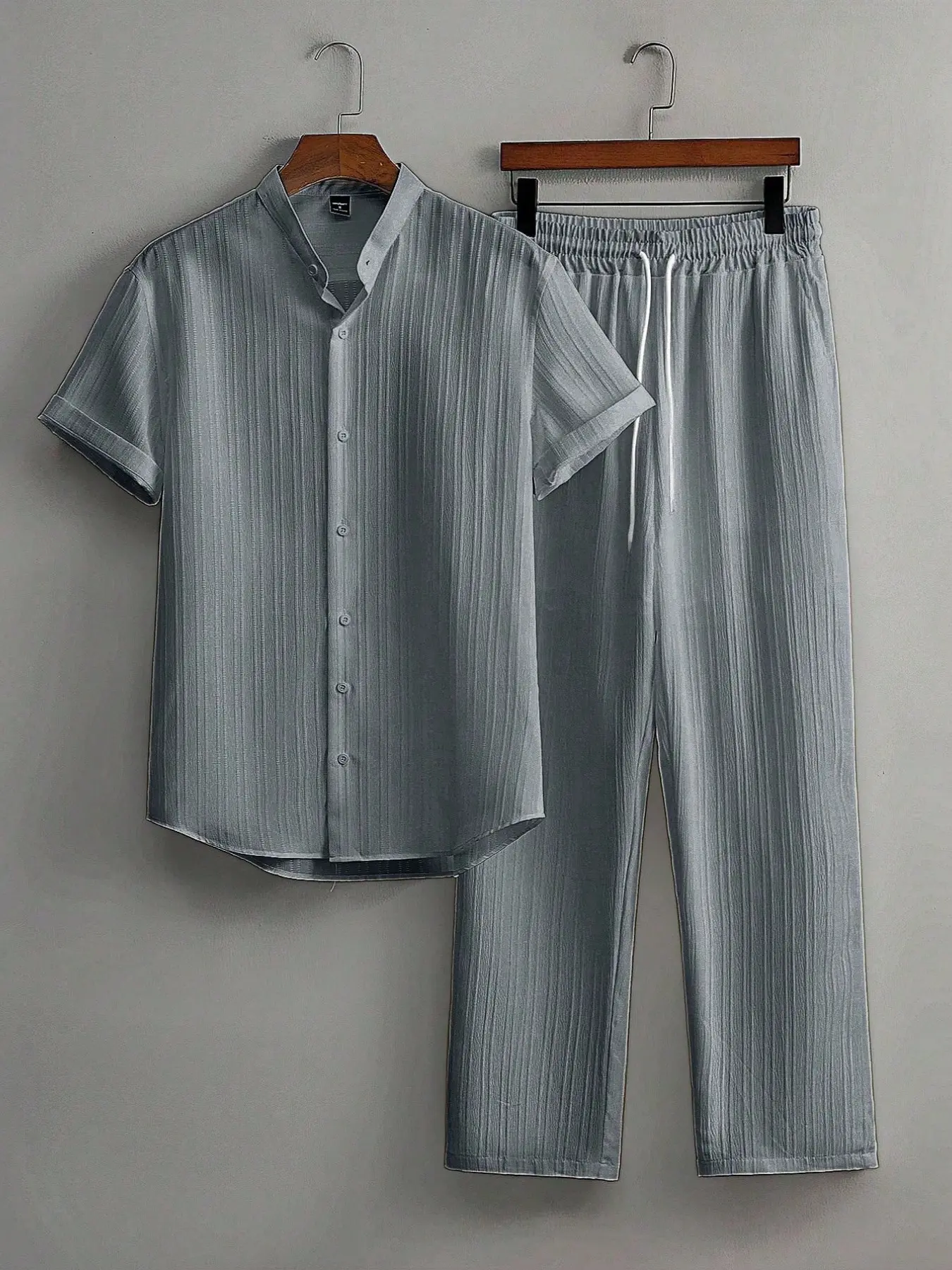 Men's Textured Stand Collar 2-Piece Outfit Set White/Black/Grey Color Options | Short Sleeve Button Shirt + Drawstring Waist Pants | Soft Breathable Fabric | Perfect for Summer Casual Outings, Streetwear & Smart Casual Style | Essential Set