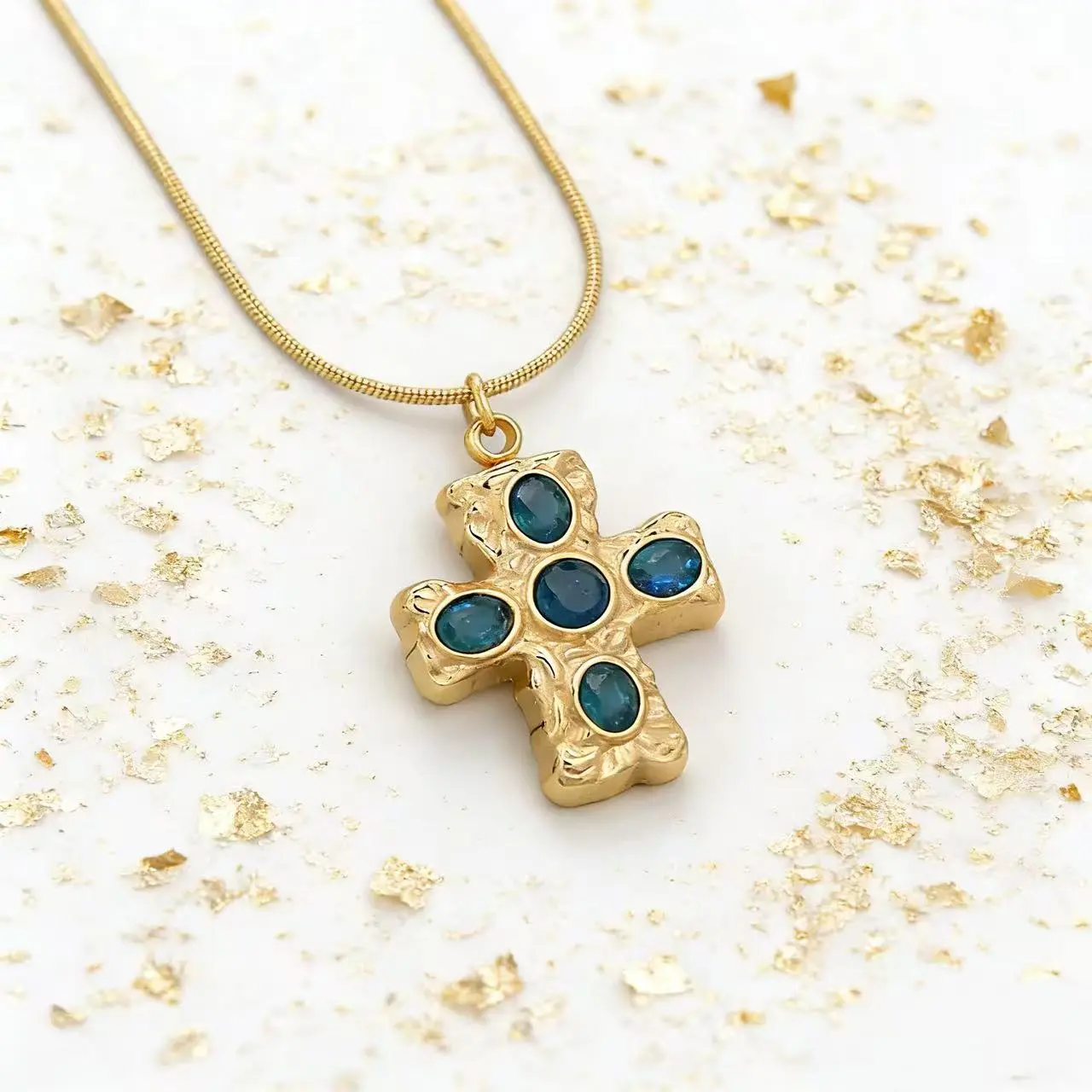 ·Craftsmanship: Dimensional, hand-hammered cross pendant with five iridescent blue gemstones, creating a sophisticated, vintage allure.