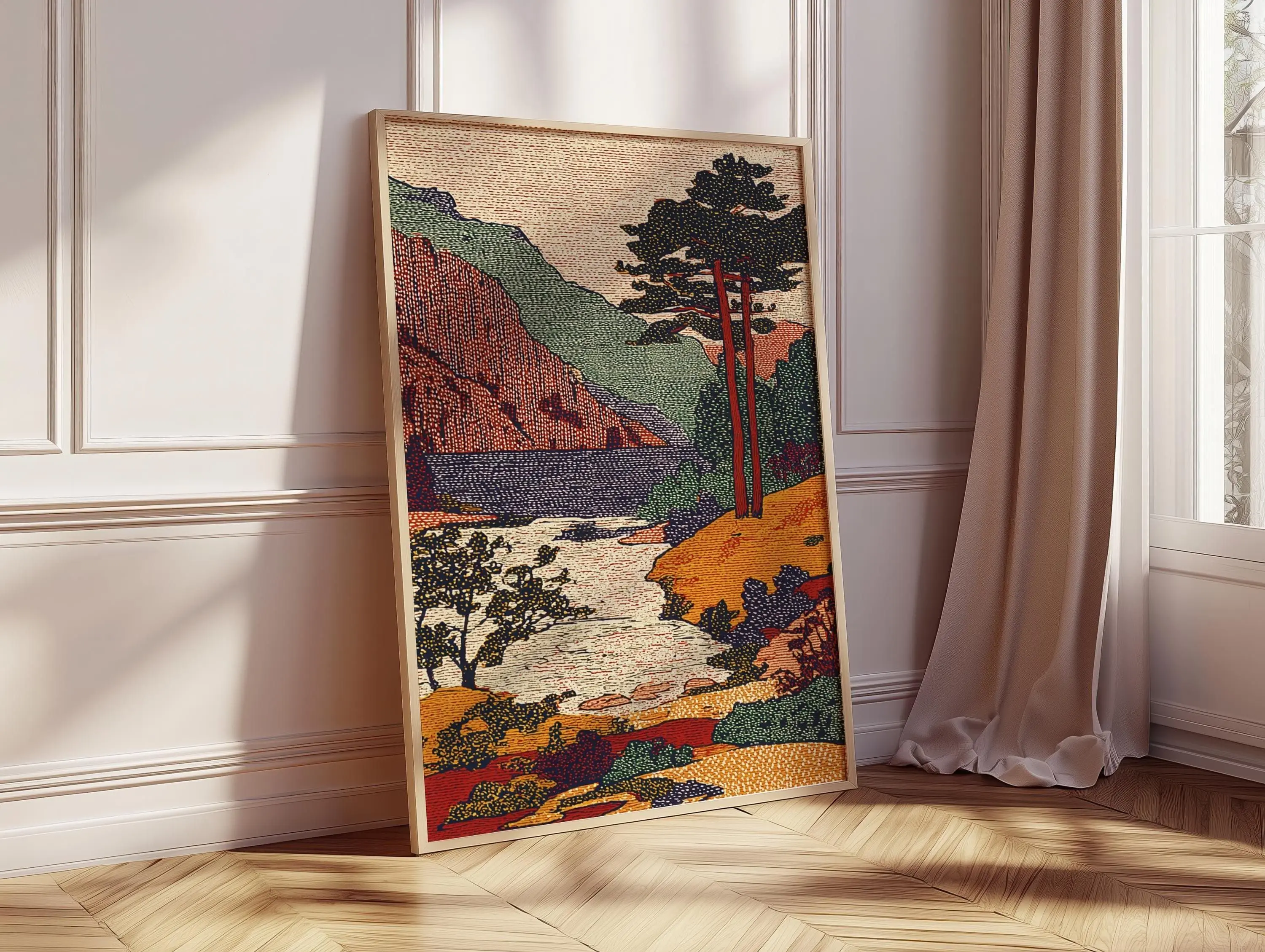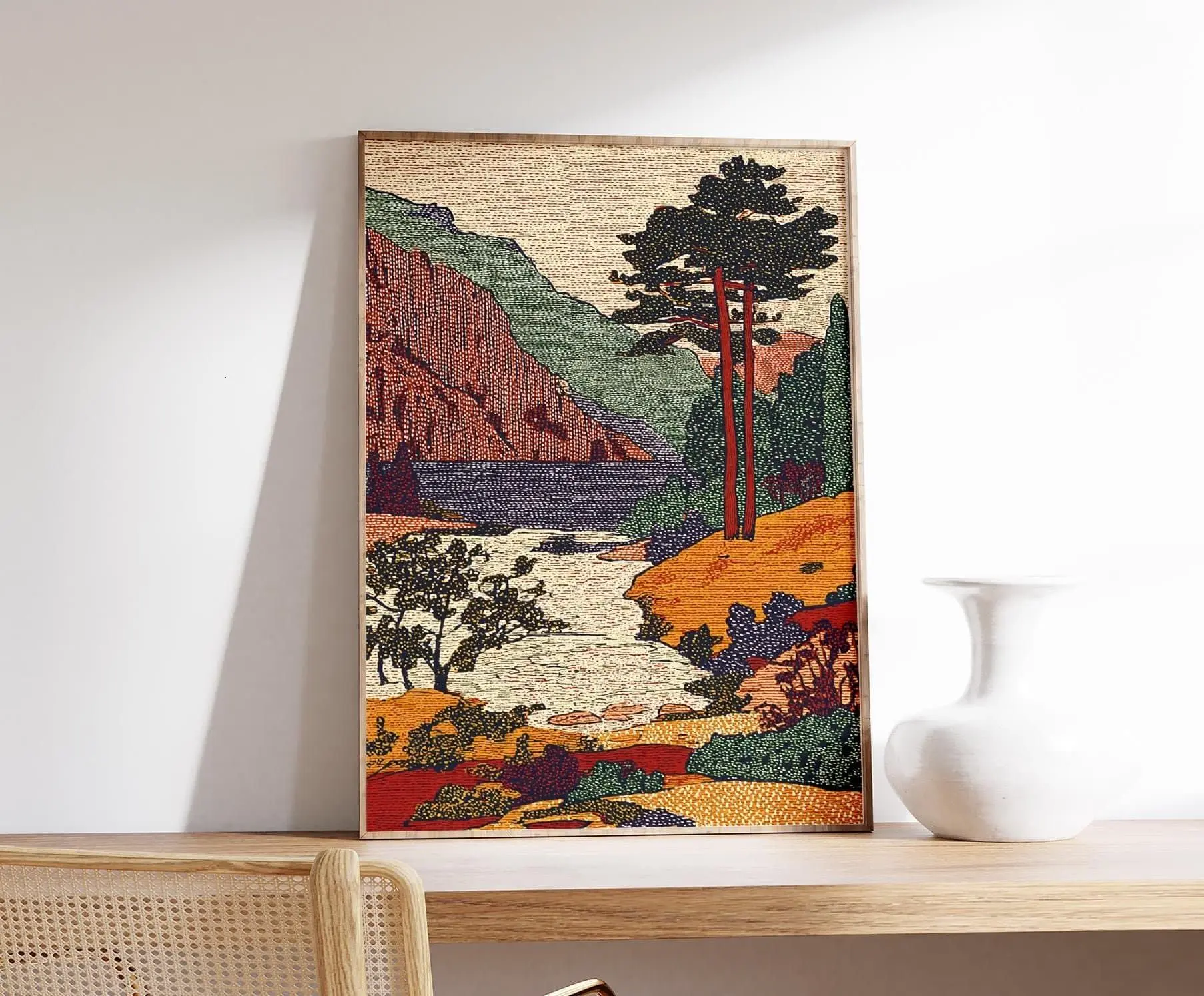 Vintage Landscape Poster, Classic Retro Scenic Mountain River Art Print, Sophisticated Warm Earth Tone Decor, Unframed Print Only
