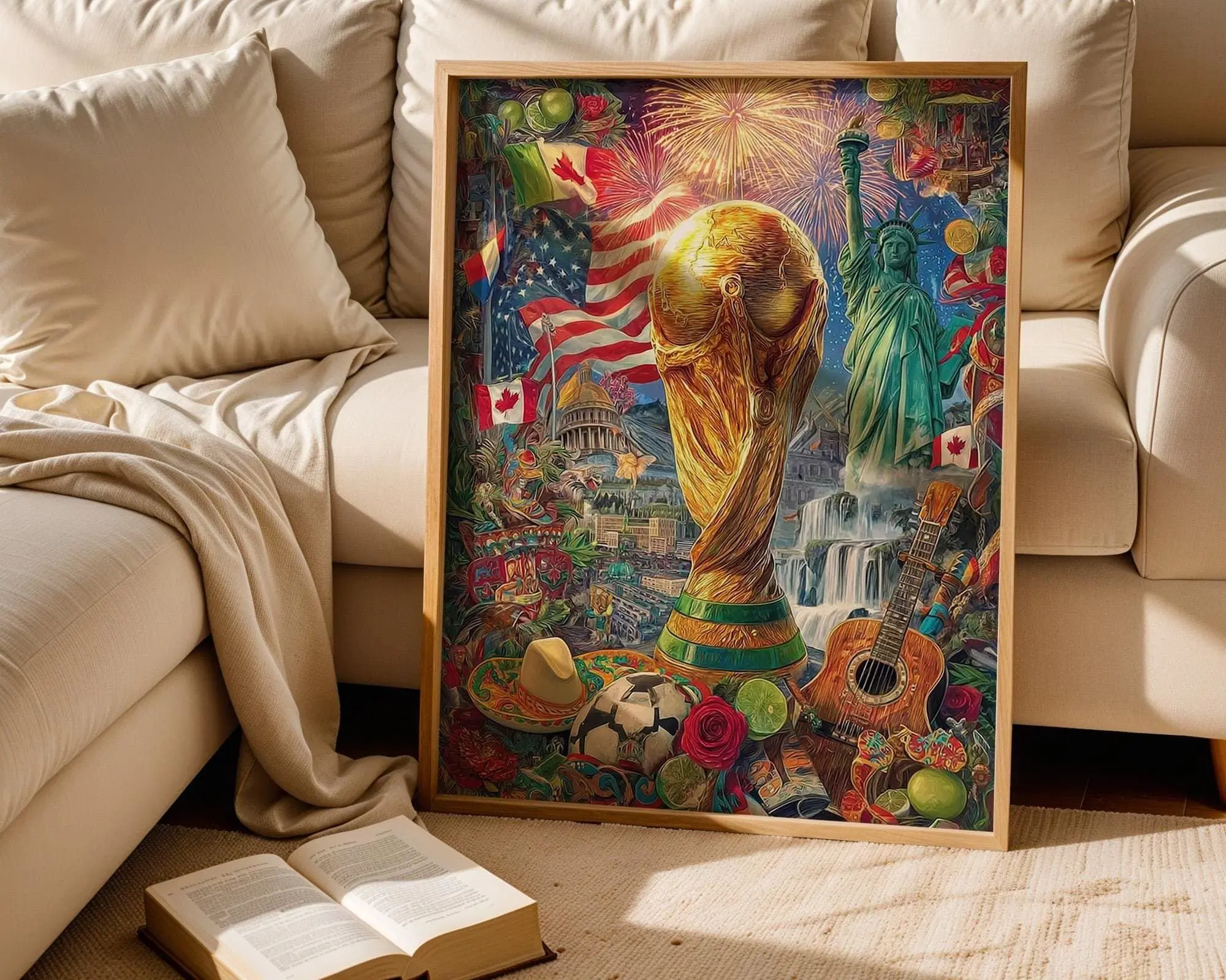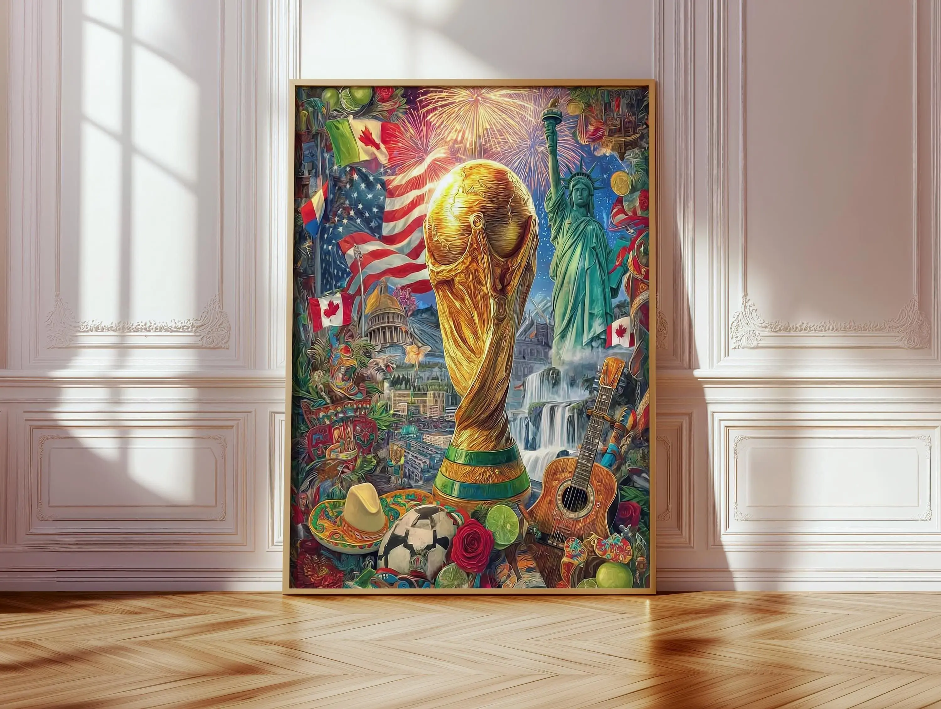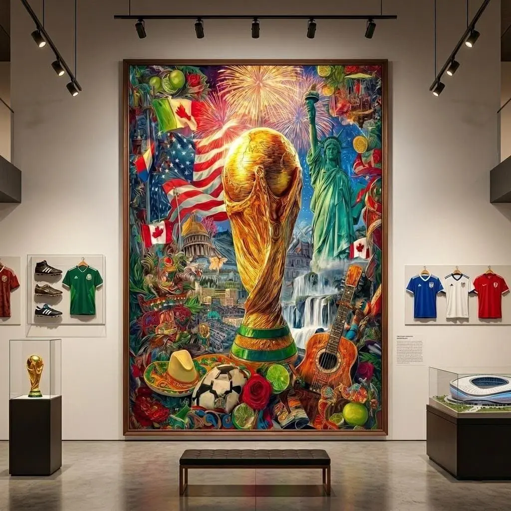 World Cup 2026 Wall Art, Large Canvas Print, Soccer Trophy USA Canada Mexico Collage Painting, Football Fan Home Decor