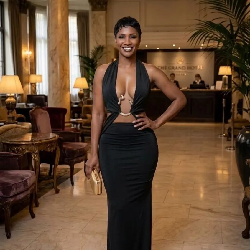 Command the room in our most daring silhouette yet. This floor-length gown features a deep burgundy hue crafted from premium, figure-hugging fabric. The plunging halter neckline is anchored by sculptural gold-tone hardware, creating a dramatic focal point that transitions into a sophisticated midriff cut-out. Perfectly balanced between high-fashion editorial and evening elegance, this piece is designed for the woman who isn't afraid to be the center of attention. Onyx Black