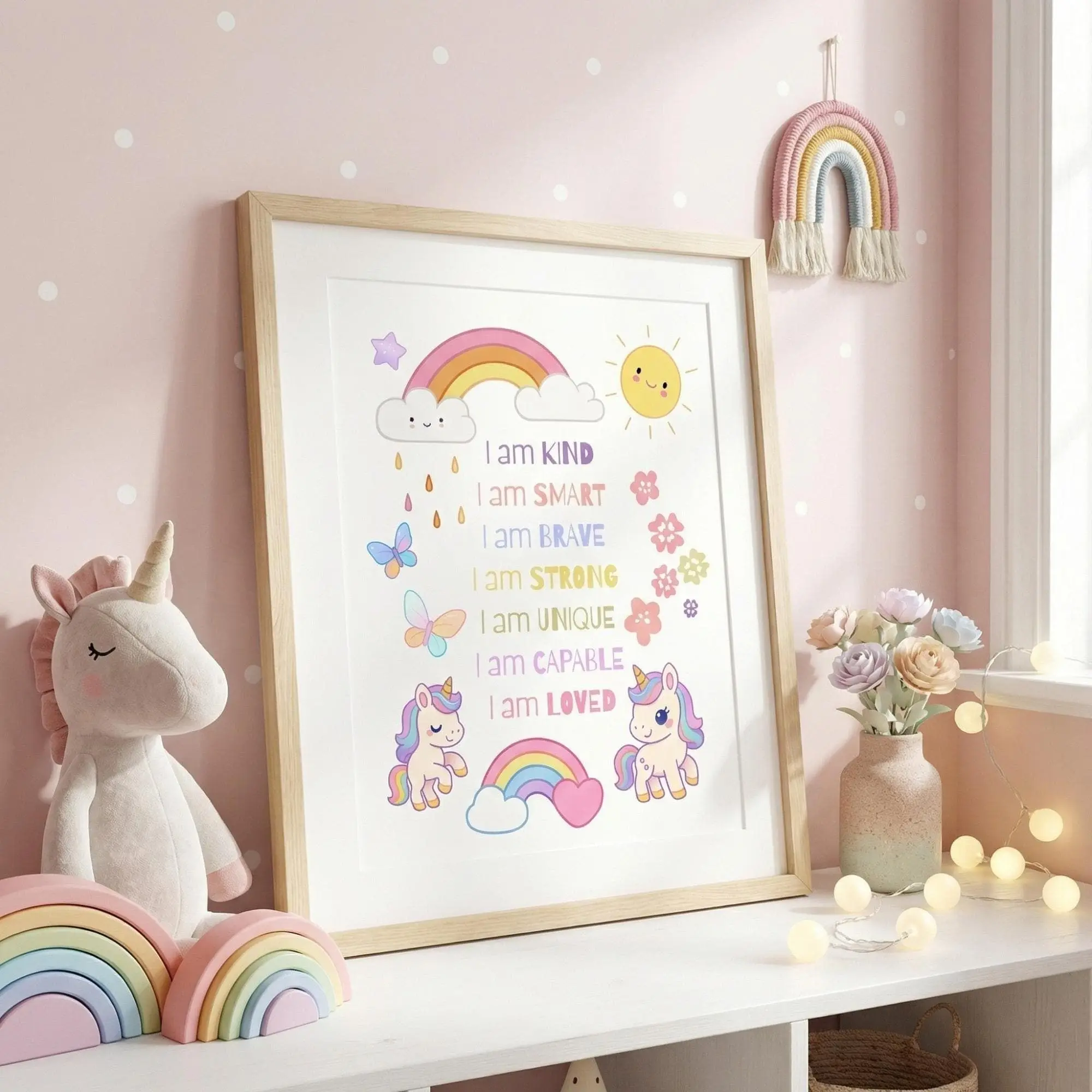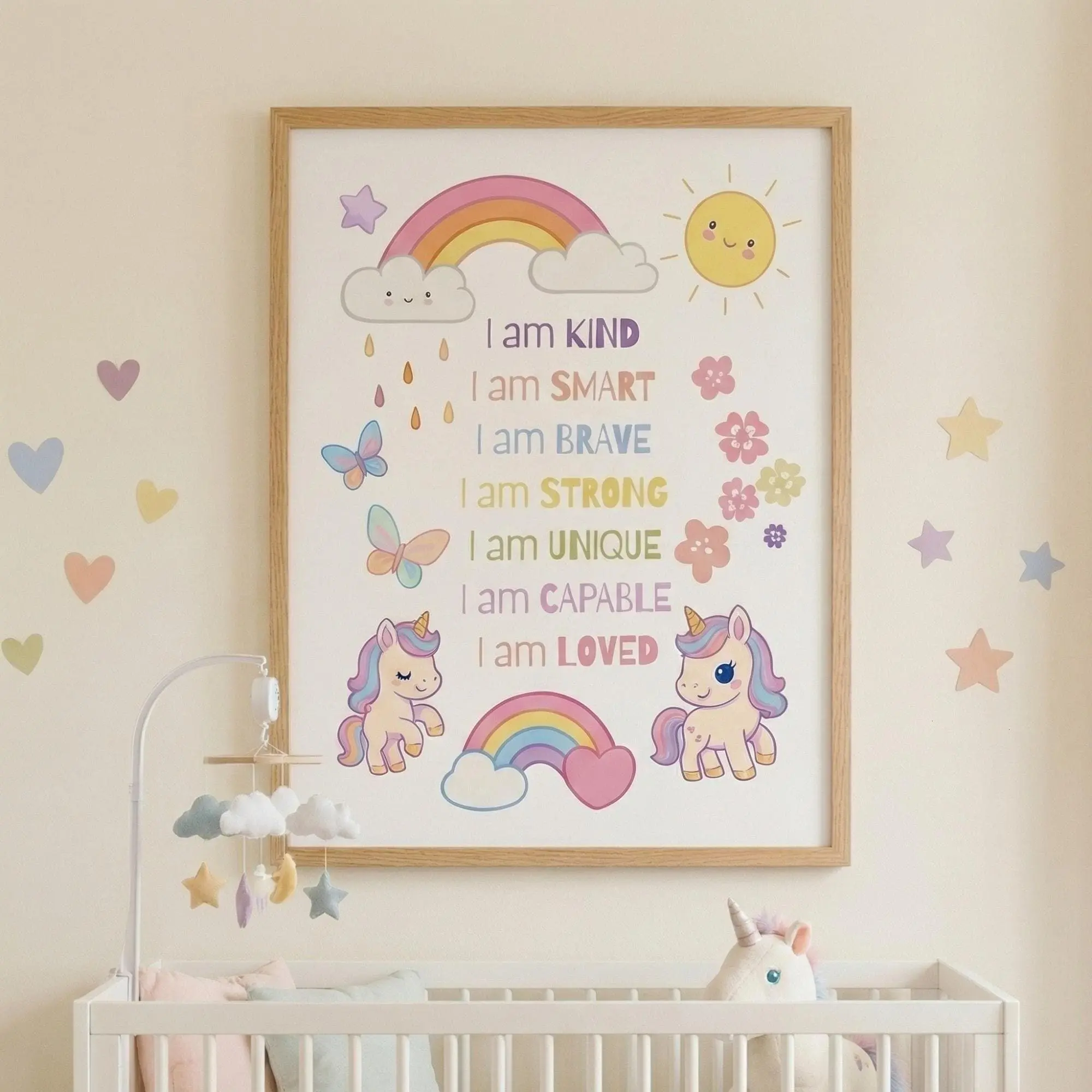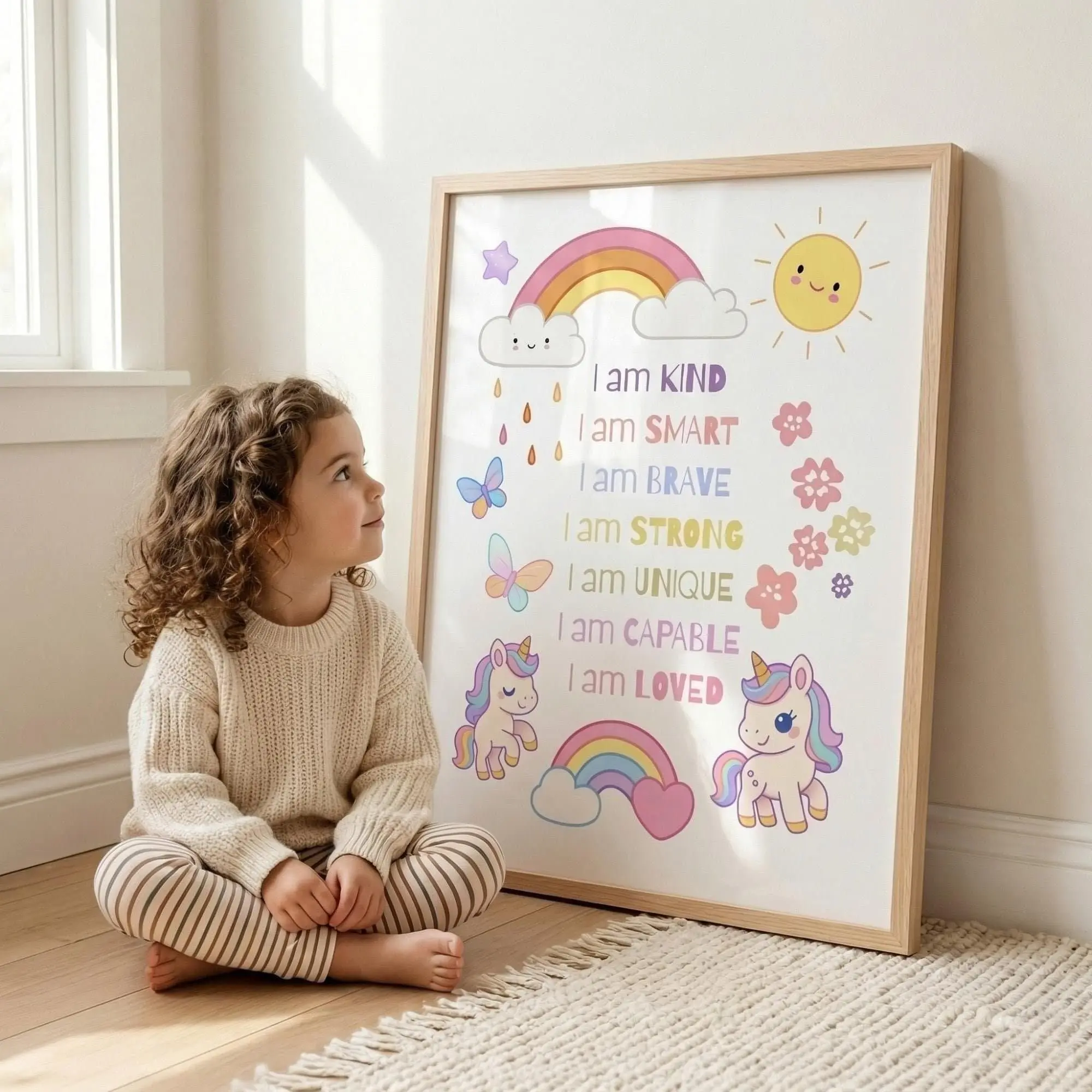 Unicorn Rainbow Nursery Wall Art Affirmations Print, Positive Quotes Kids Decor for Playroom, Printable Pink Girl's Room Poster