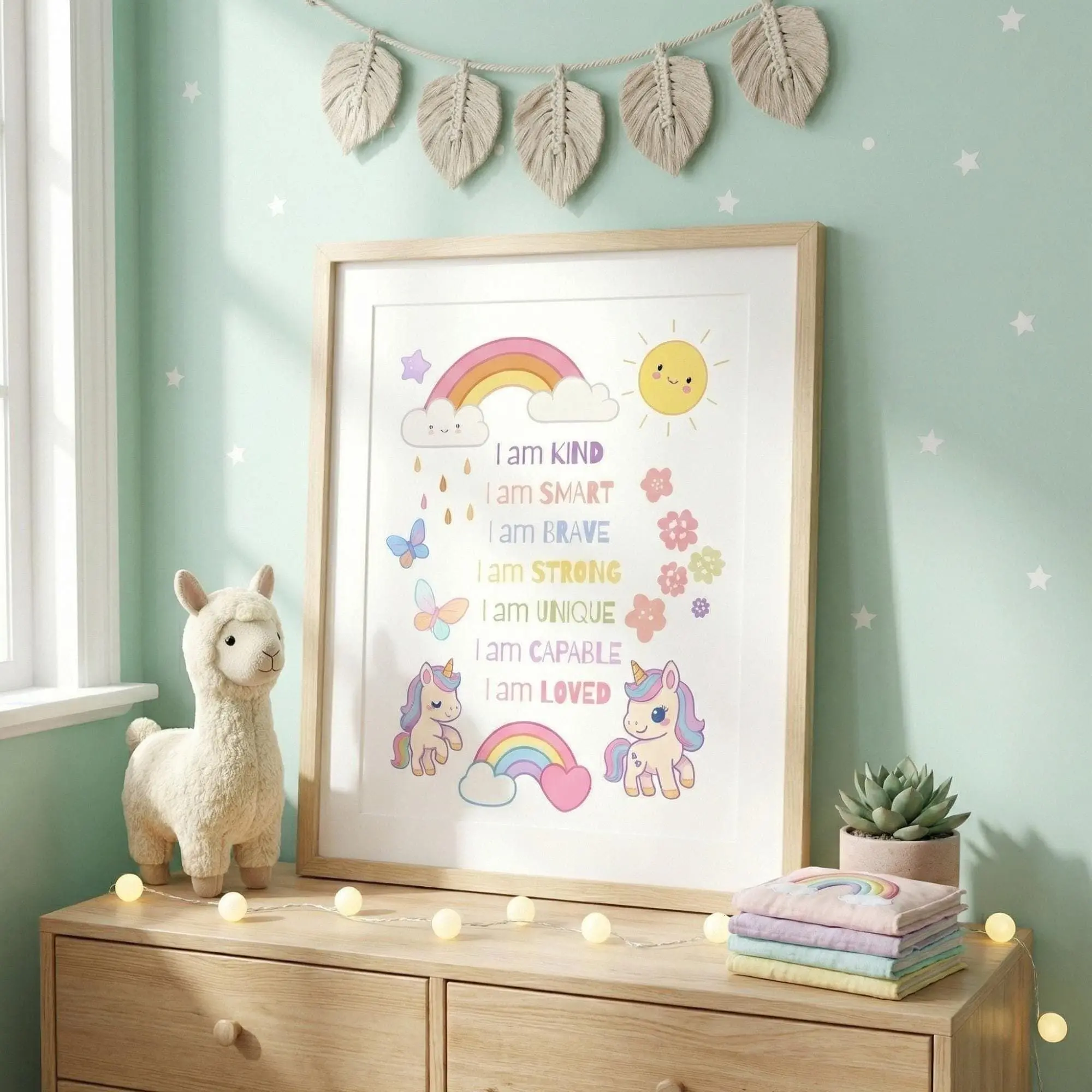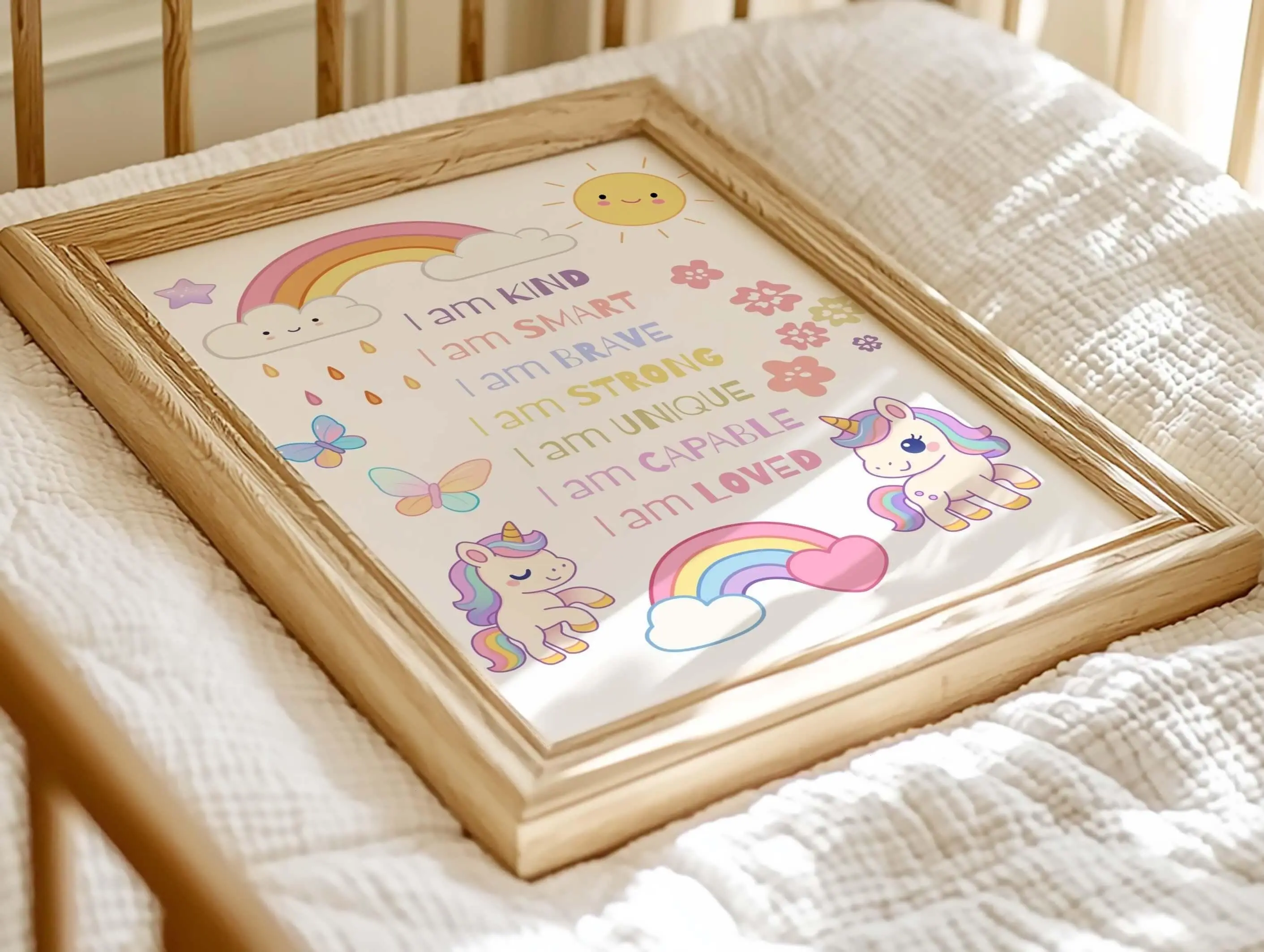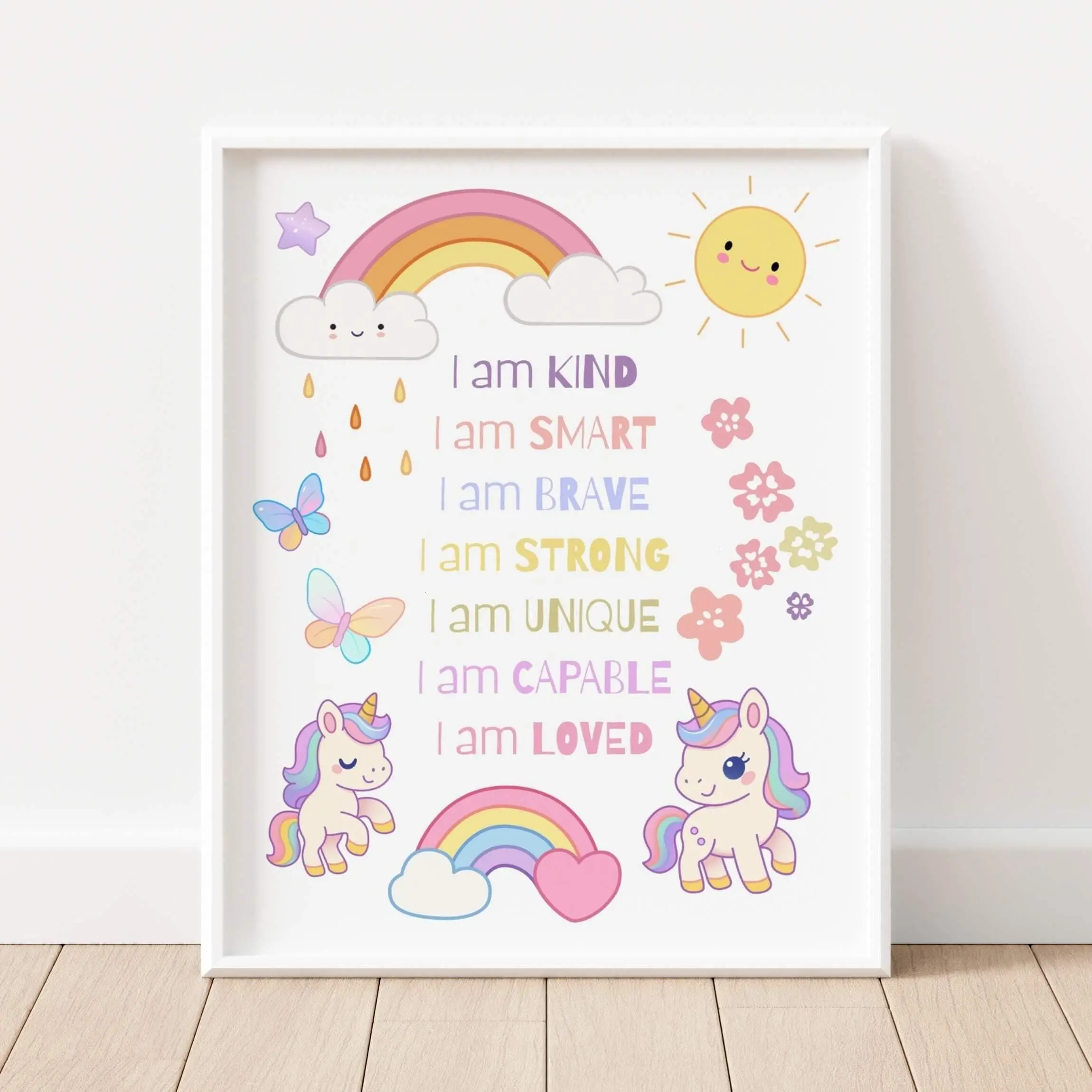 Unicorn Rainbow Nursery Wall Art Affirmations Print, Positive Quotes Kids Decor for Playroom, Printable Pink Girl's Room Poster