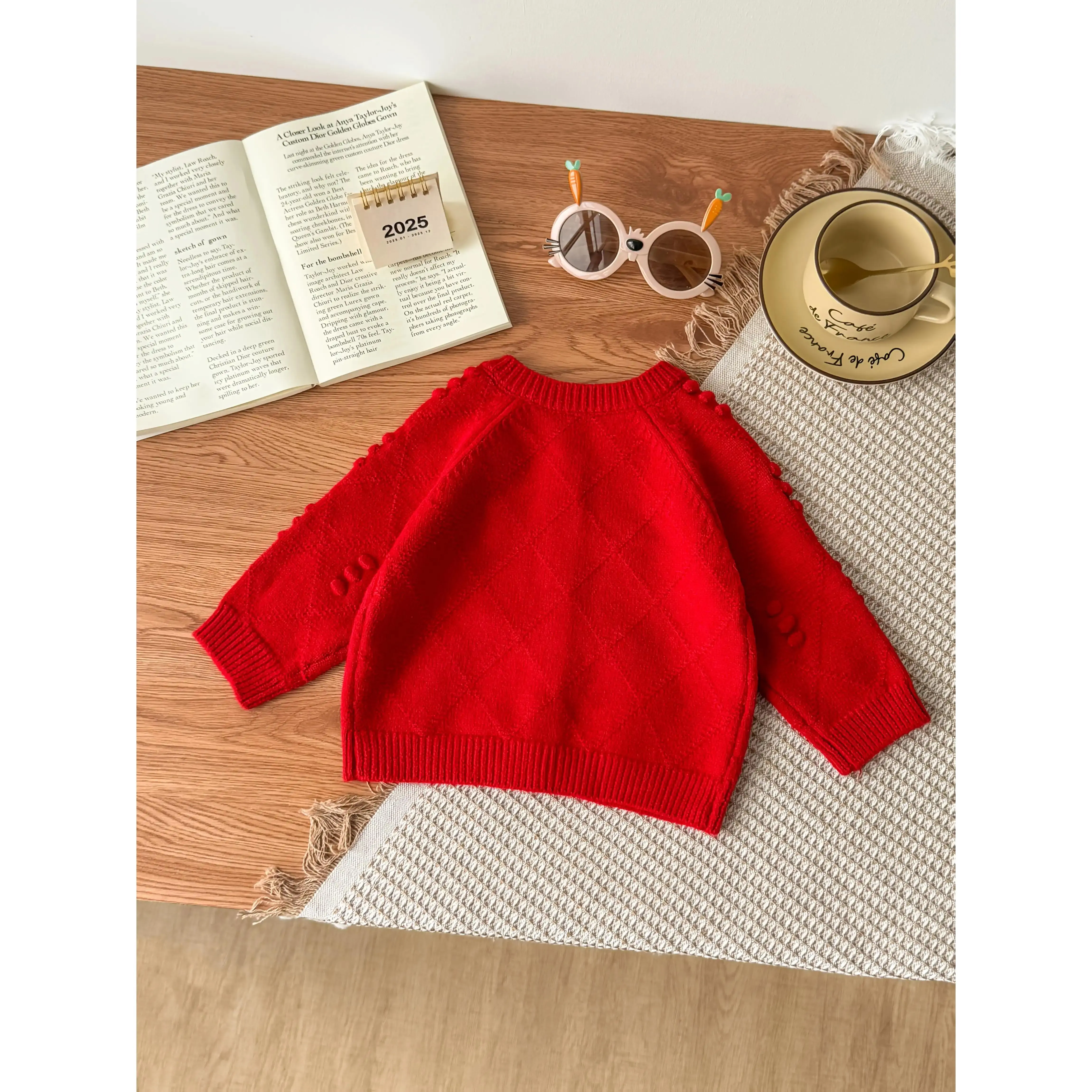 Girls' Red Knit Cardigan with Heart Pattern - Long Sleeve, Button-Up, Round Neck, Stretchy Fabric, Perfect for Fall/Winter, Halloween & Casual Wear, Halloween Cardigan | Playful Design | Knit Construction, Halloween Clothes, Girl Cardi