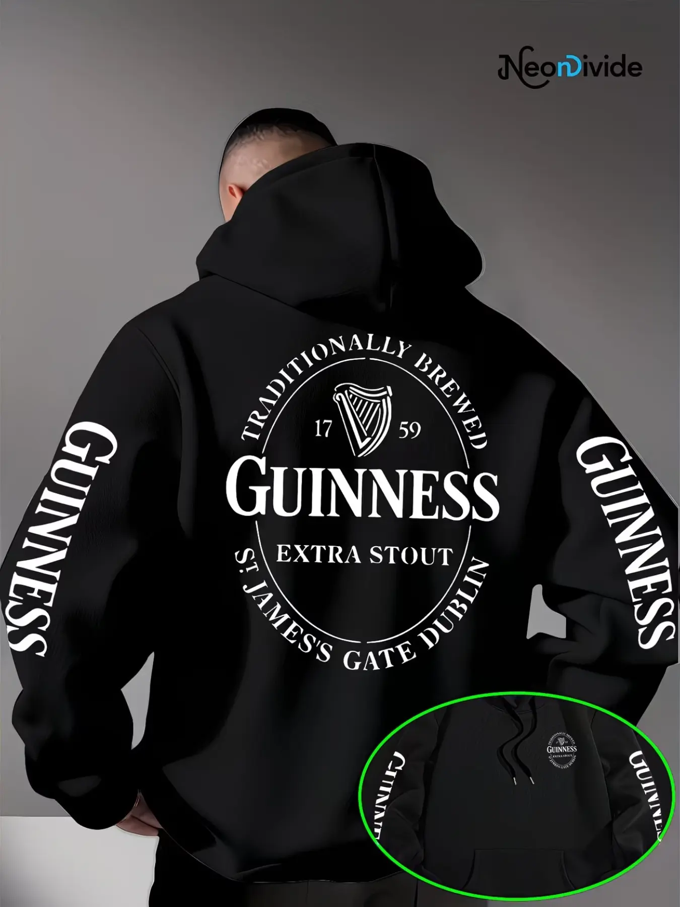 Trendy Men's Guinness Print Hoodie, Drawstring Kangaroo Pocket Design, Loose Fit, Lightweight Knit, Fall Winter Streetwear