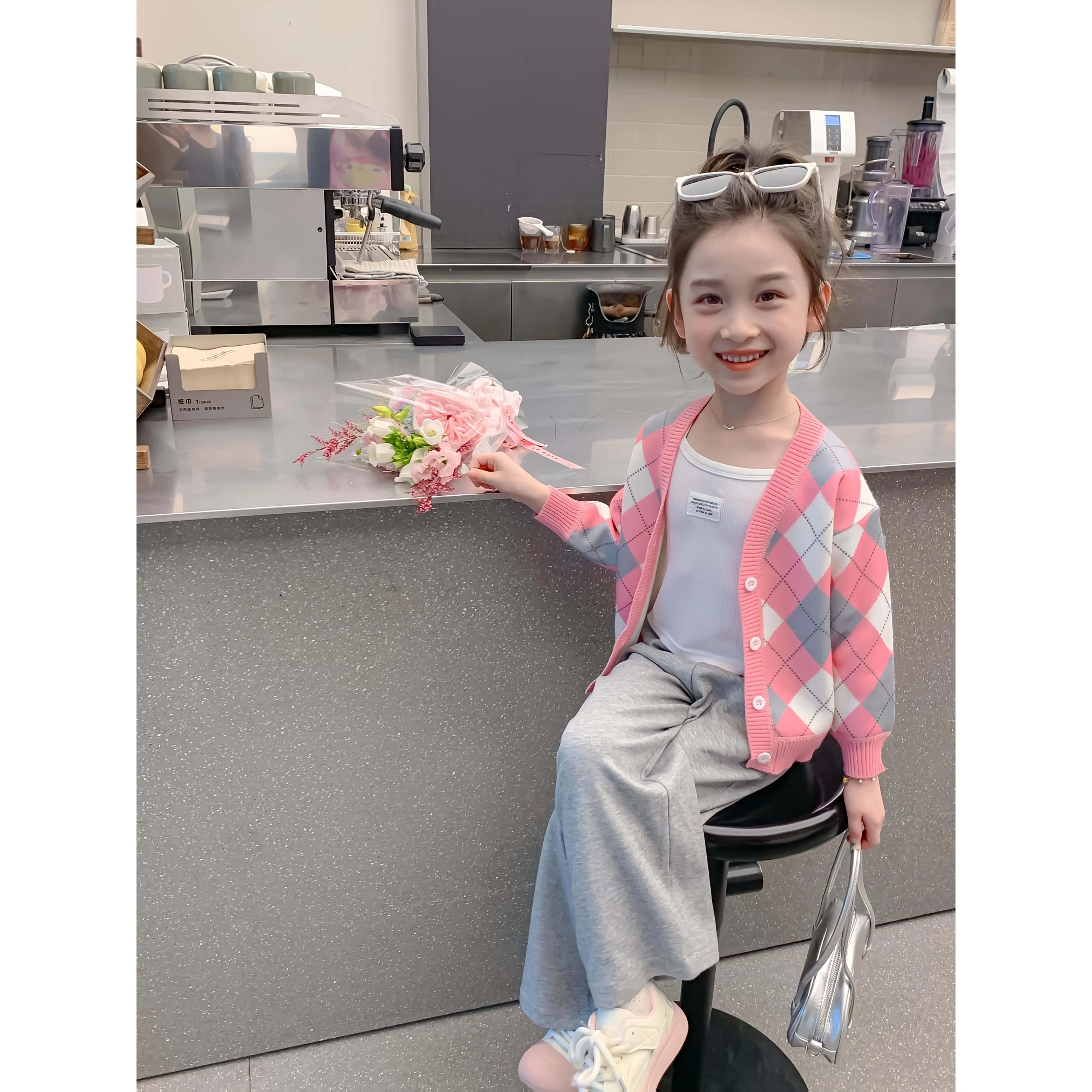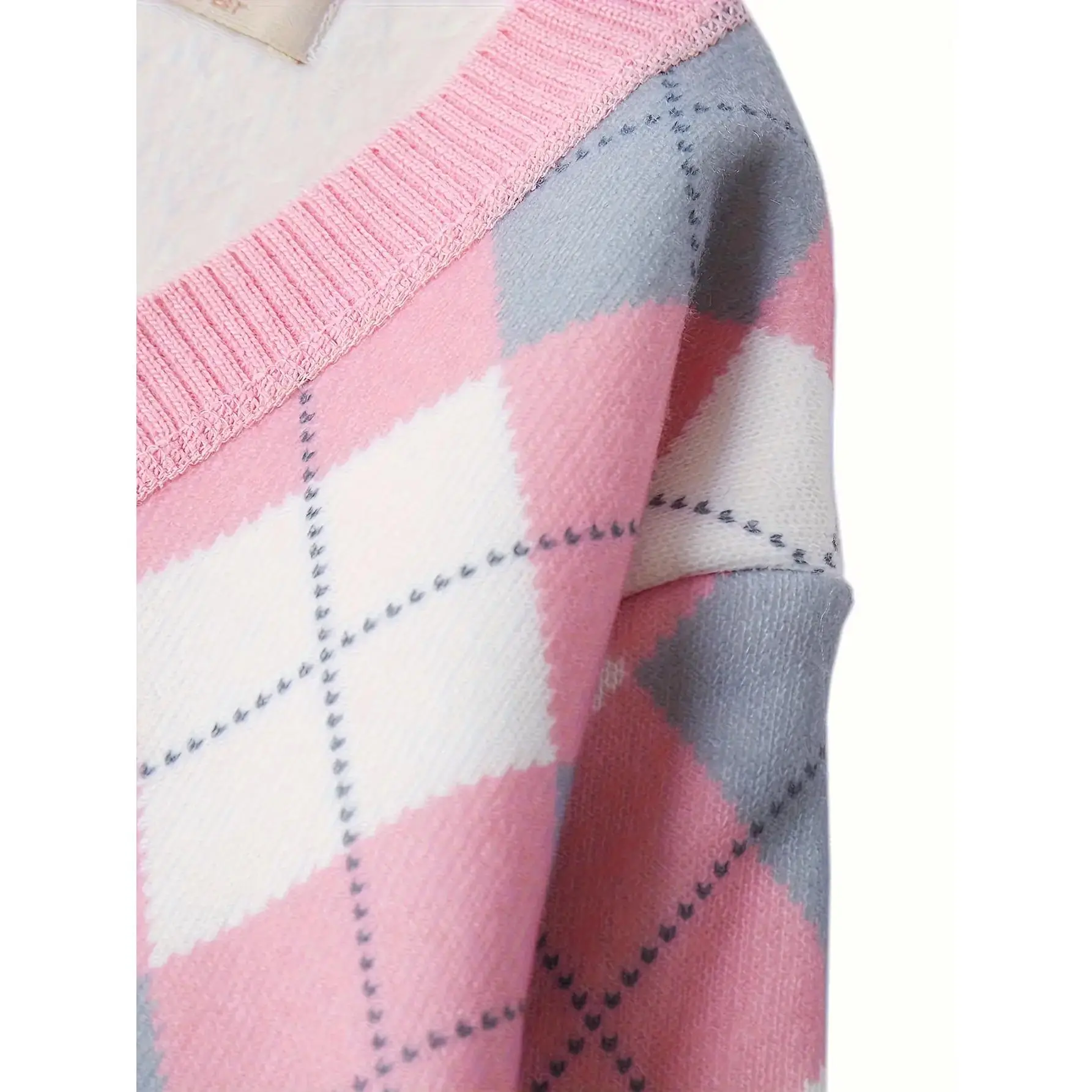 5. Girls' Cozy Fleece-Lined Knit Cardigan - Pink & White Checkered V-Neck with Button Front, Long Sleeves, and Ribbed Cuffs - Perfect for Fall/Winter Casual Wear, Winter Clothing for Girls