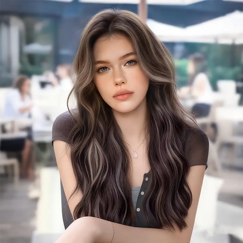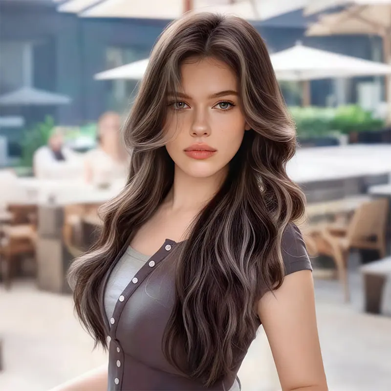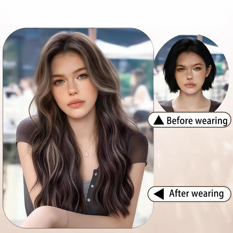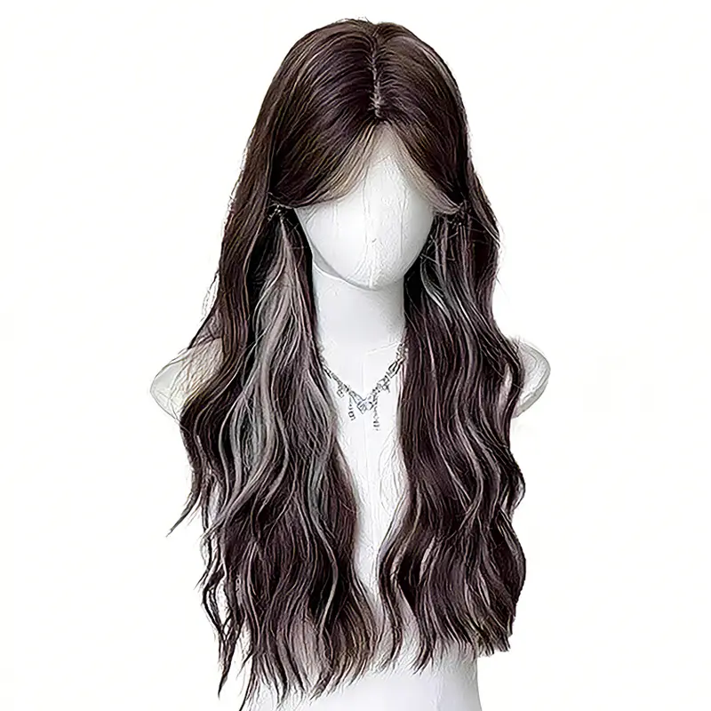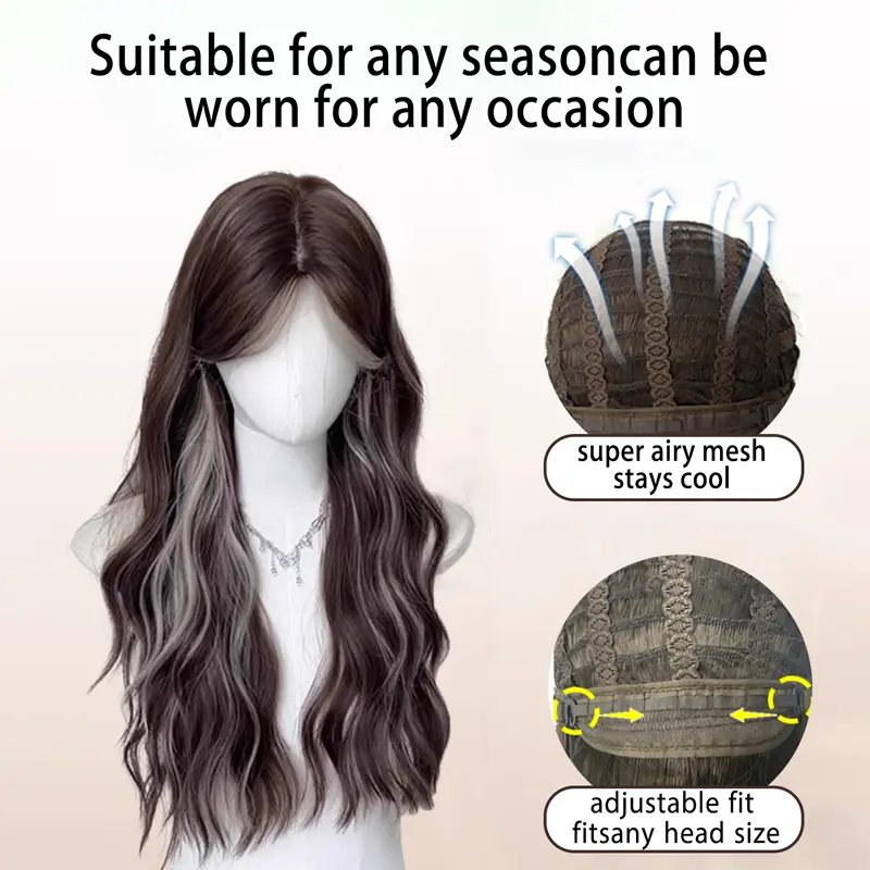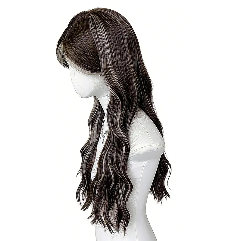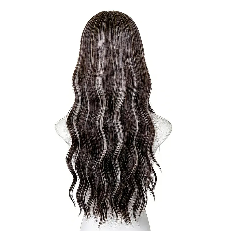 Lotfon Women's non-adhesive synthetic wig, Brown with white highlights big wave style, adjustable head circumference, comfortable fit, easy to wear, lightweight and breathable, instantly changes your style, suitable for daily wear and cosplay.