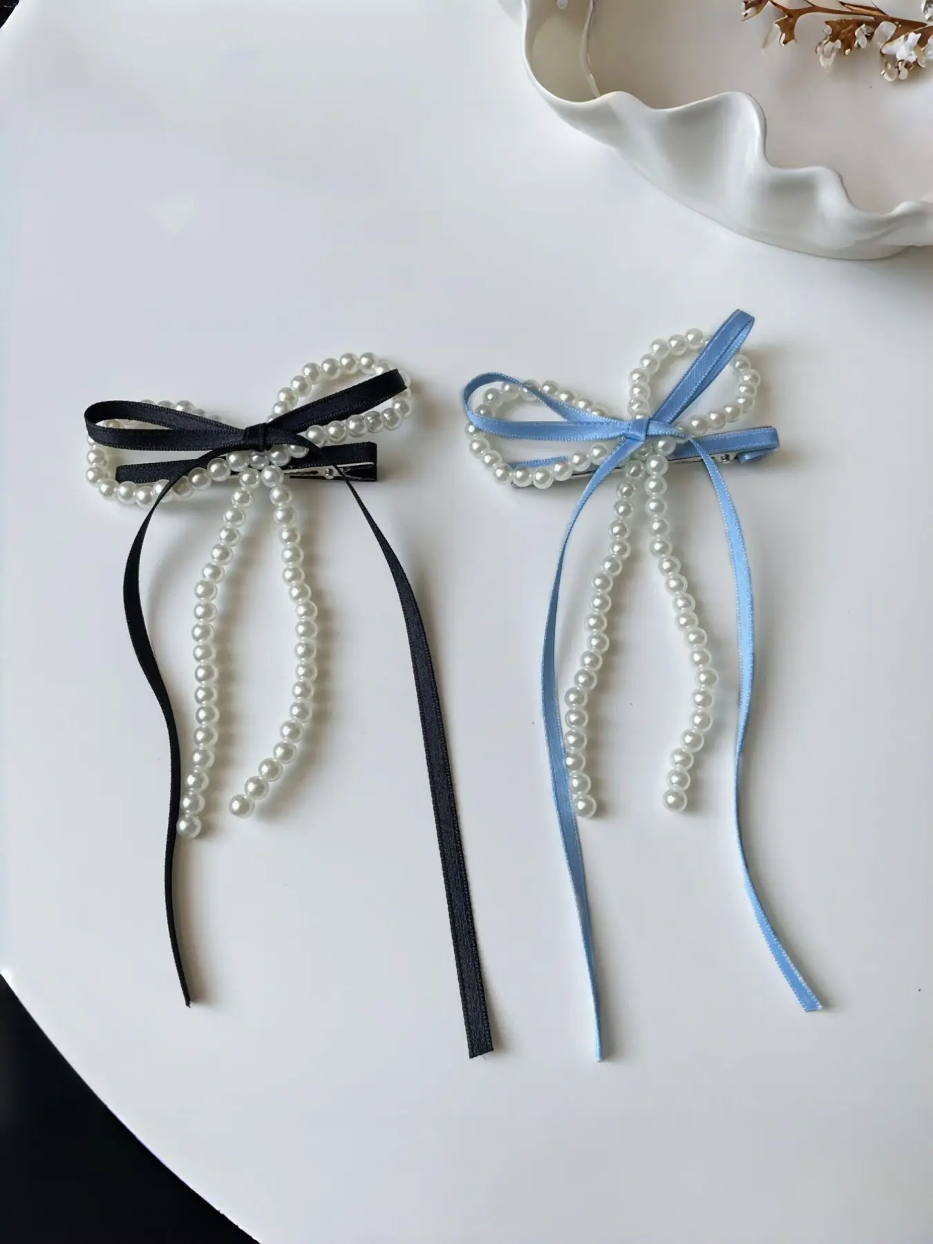 Sweet Forest Style Bow Ribbon Hair Clip, Imitation Pearl Edge, Girl Heart Side Clip, Elegant and Cute New Design Hair Accessory