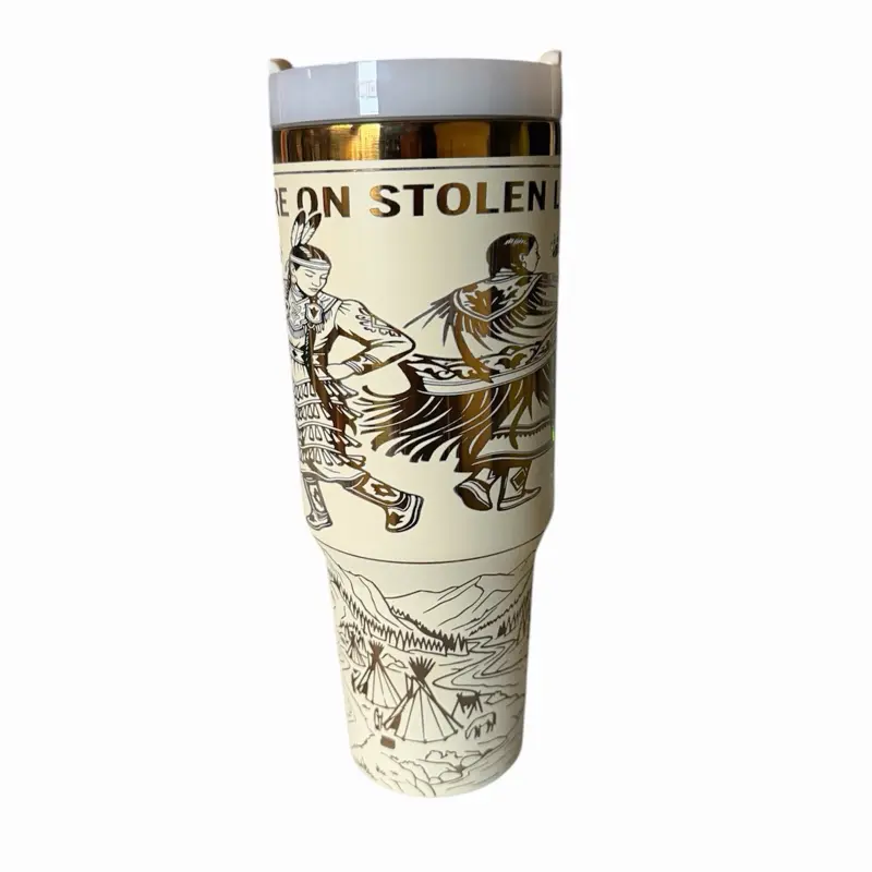 Wrapped around the design, you’ll find a beautifully detailed tribute to our sacred lands, along with women in traditional powwow dance—capturing strength, culture, and movement in every line.