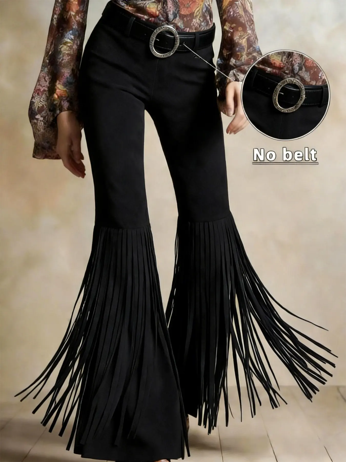 【Boho Chic】: Embrace a retro bohemian vibe with these black fringe flare pants, perfect for festivals and parties.