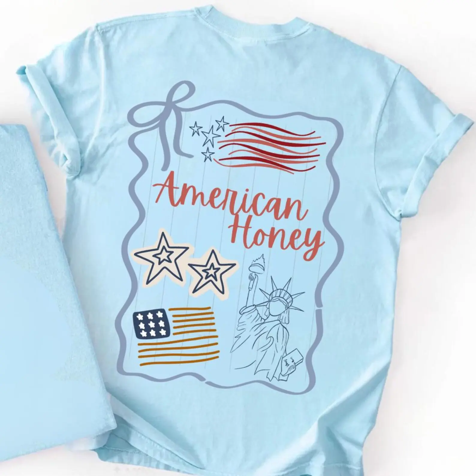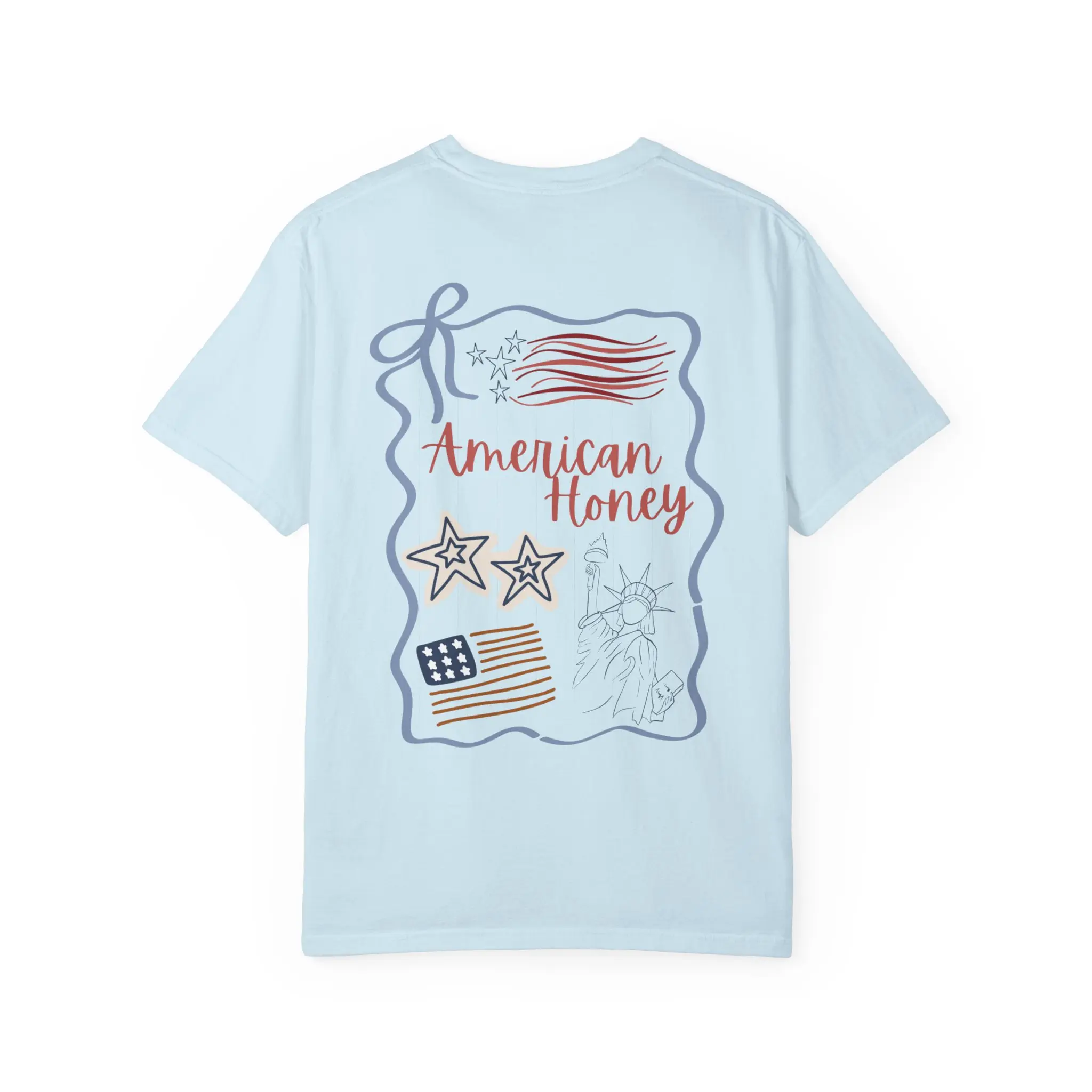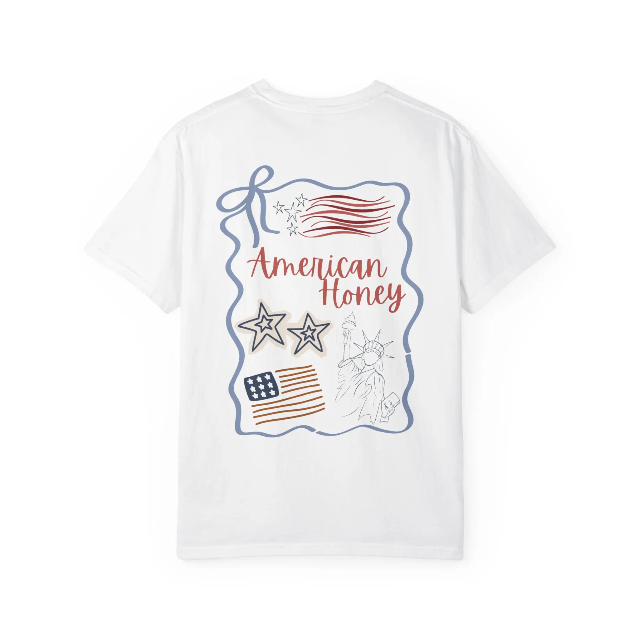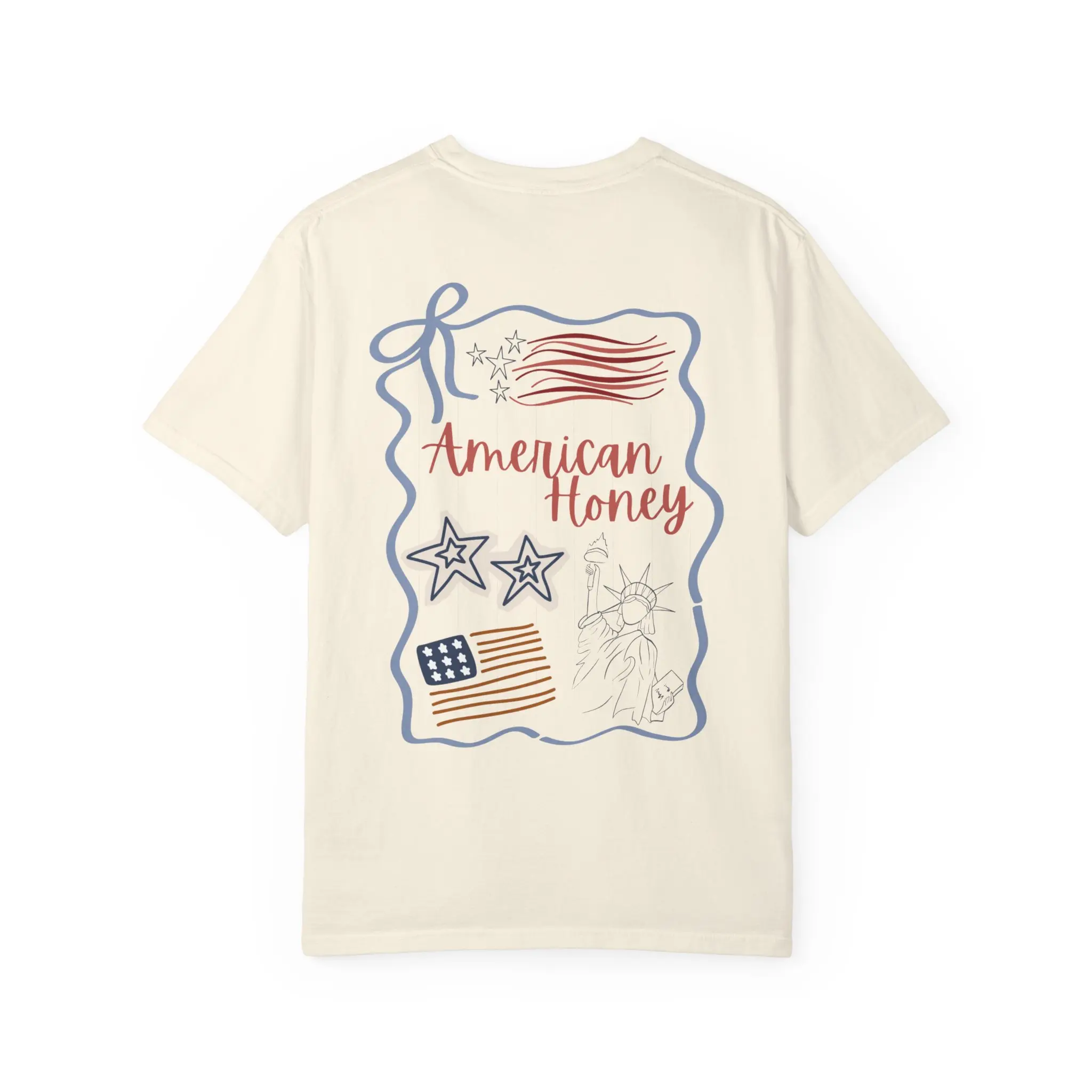 Soft, lived-in cotton with a gentle garment-dyed finish — this relaxed tee feels like an old favorite from the first wear. The back features a hand-drawn, Americana-inspired collage: waving flags, doodle stars, and the warm script “American Honey.” It’s the kind of shirt you reach for when you want casual comfort with a homespun, patriotic touch. Wear it to backyard cookouts, slow summer drives, or evenings on the porch when conversation and iced tea stretch long into dusk. The heavyweight knit keeps its shape while the pre-shrunk cotton and roomy cut let you move freely. Available in a wide palette of muted, washed colors to match that effortless, vintage-worn vibe.