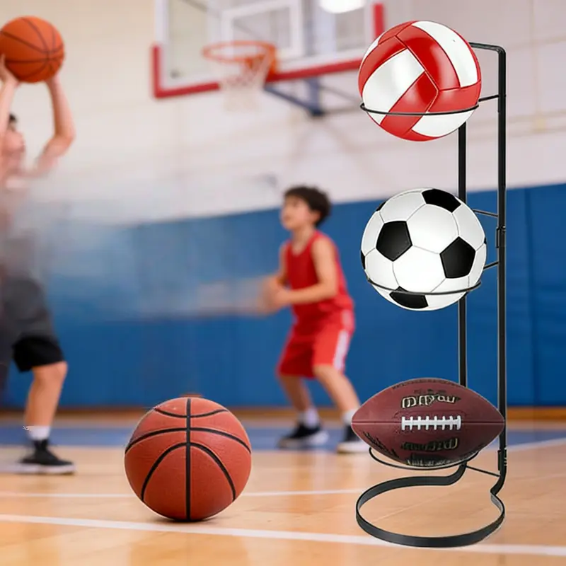 Versatile Design: This ball storage organizer can be wall-mounted or placed freely on the floor. It features a vertical 3-tier layout to neatly arrange your basketball, football and volleyball.