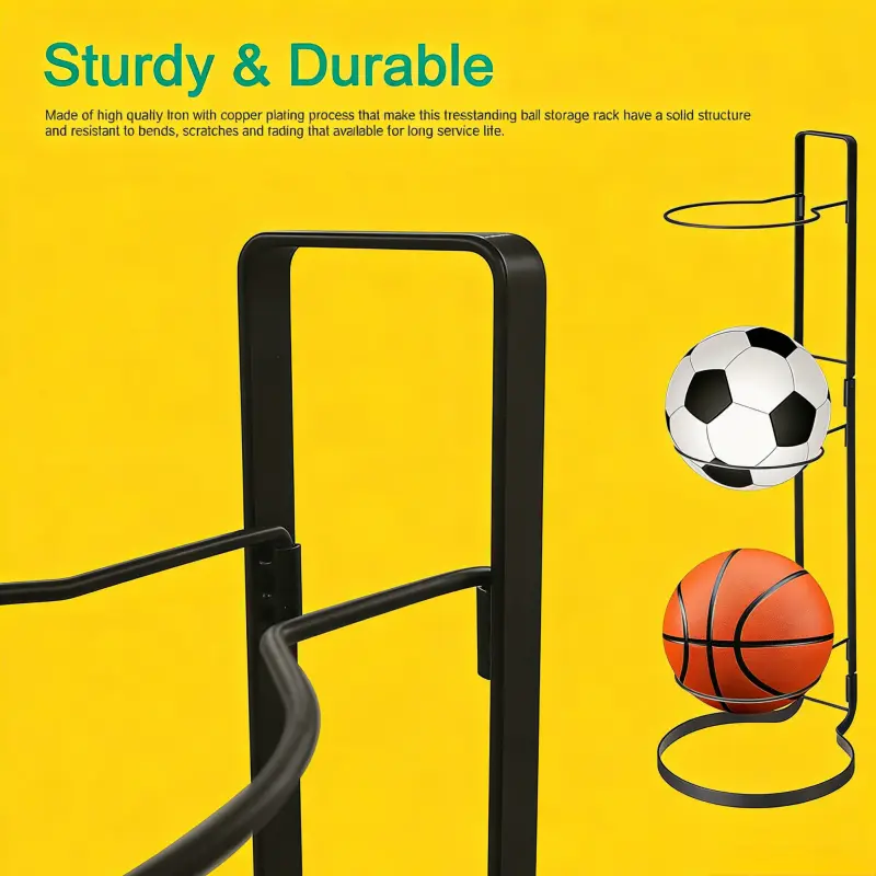 Size: Approx. 26''H × 7.9''D × 9.4''W. Crafted from premium iron with a copper-plated finish, this freestanding ball storage rack features a stable structure, resisting bending, scratches and fading for extended durability.