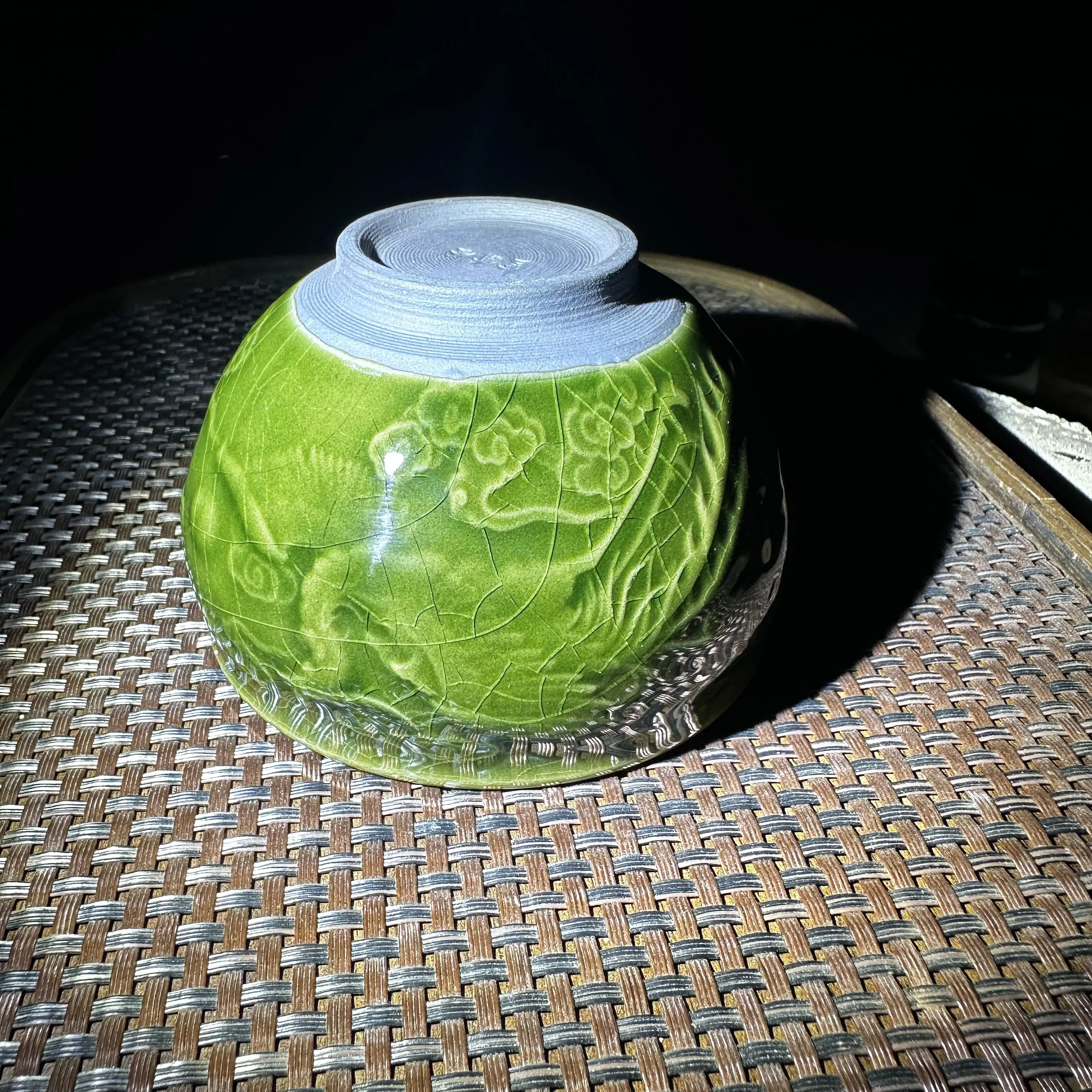 Green Crackle Glaze Tea Cup with Crane Emboss Handcrafted Artisanal Teaware for Tea Enthusiasts