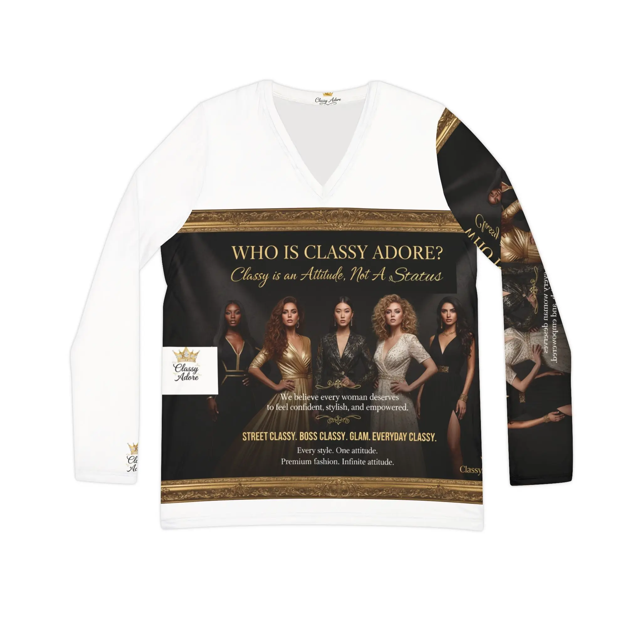 This isn't just a shirt — it's a conversation. The Classy Adore One Sleeve Banner Graphic Shirt is a wearable statement piece from the Classy Adore signature collection. Featuring our iconic "Who Is Classy Adore?" graphic dramatically printed across the front and one sleeve, this long-sleeve V-neck turns heads before you even open your mouth.