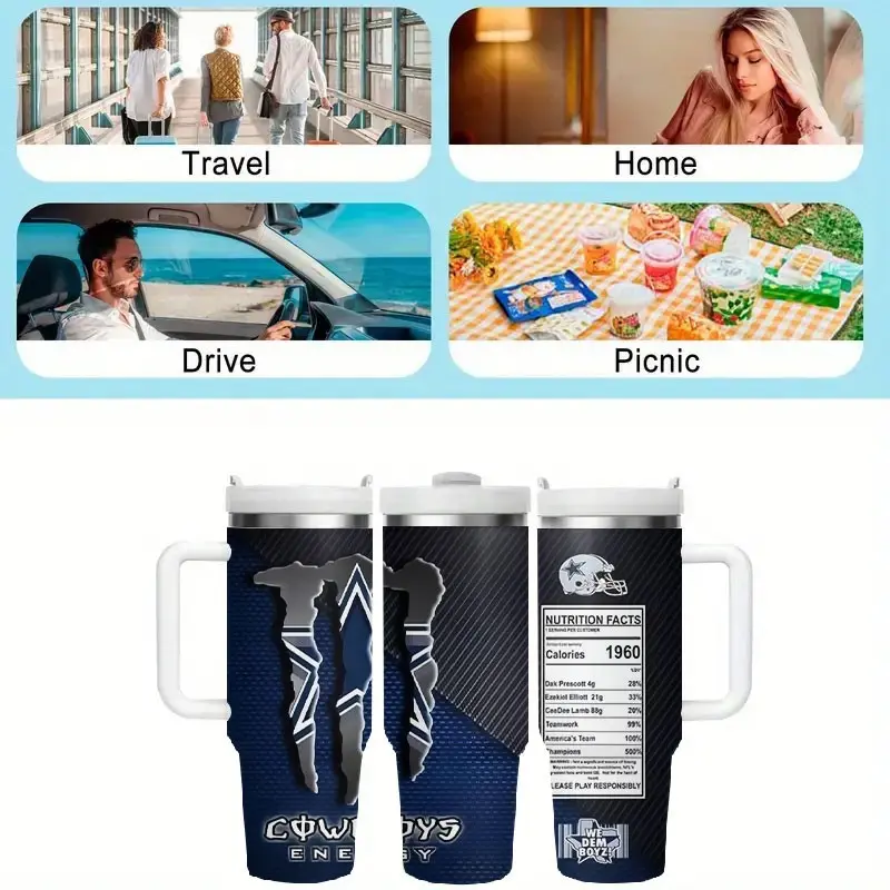 5. 1pc Dallas Cowboys Energy Drink Pattern 40oz Tumbler, Non-Slip Handle Insulated Cup, Large Capacity Functional Beverage Straw Cup, Car/ Sports Use