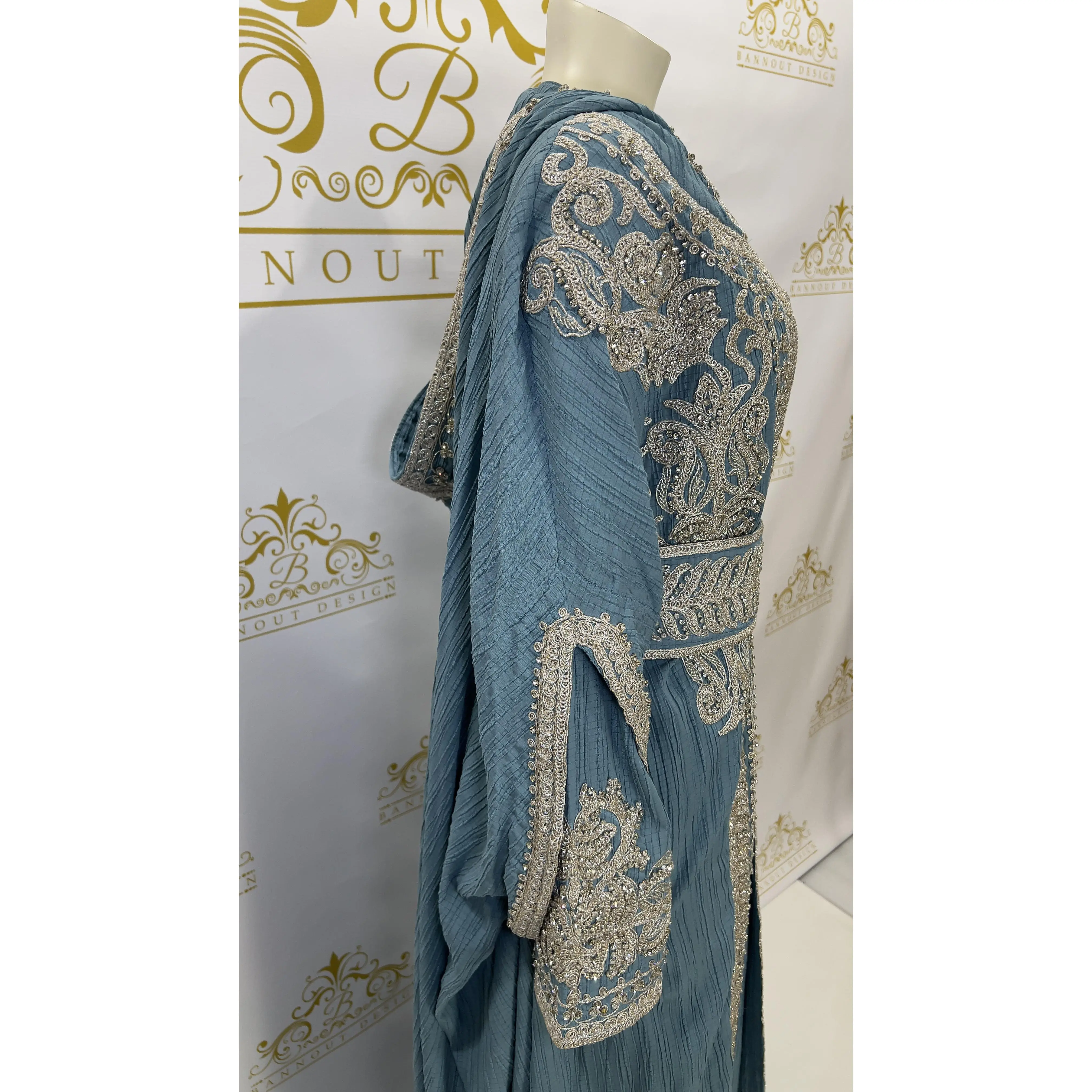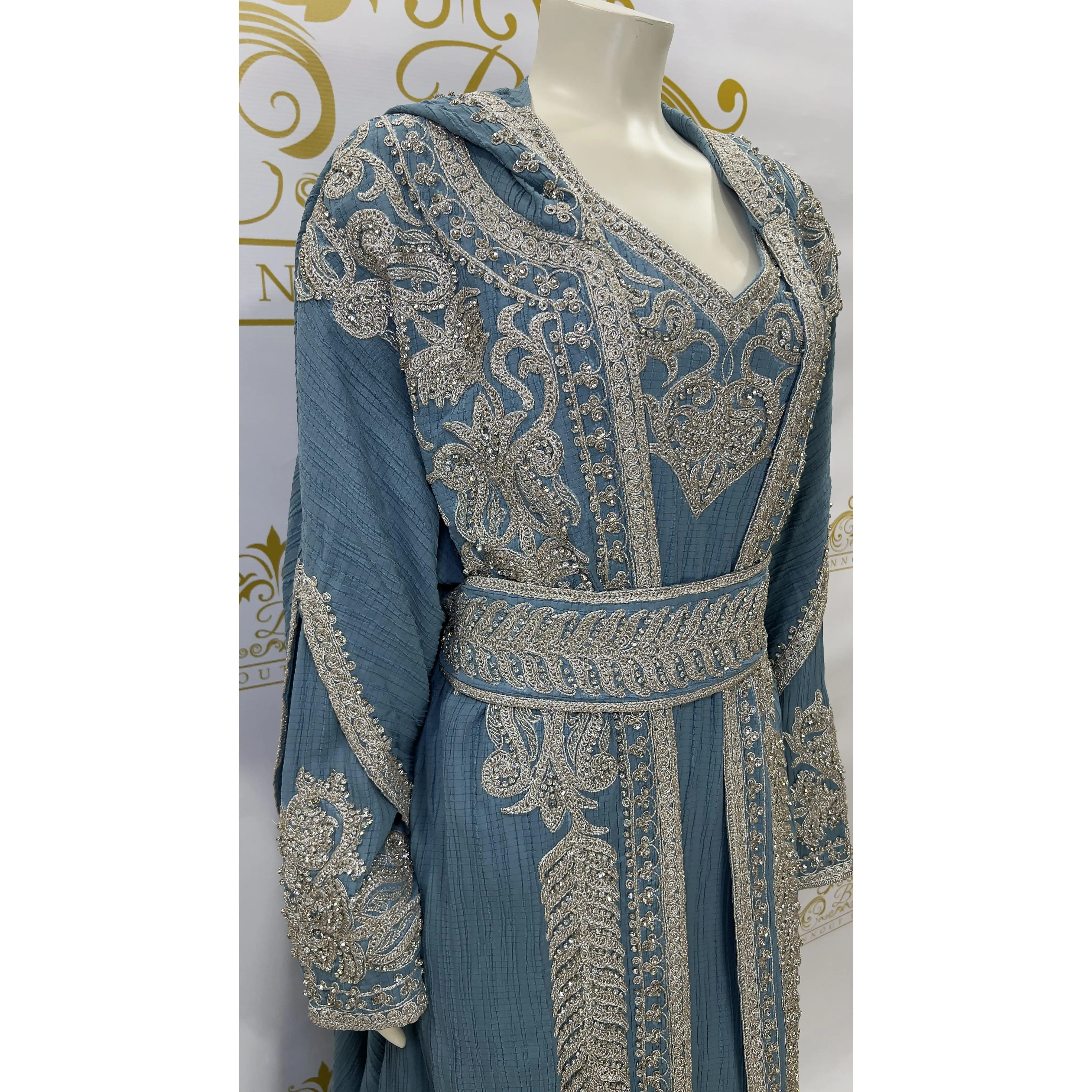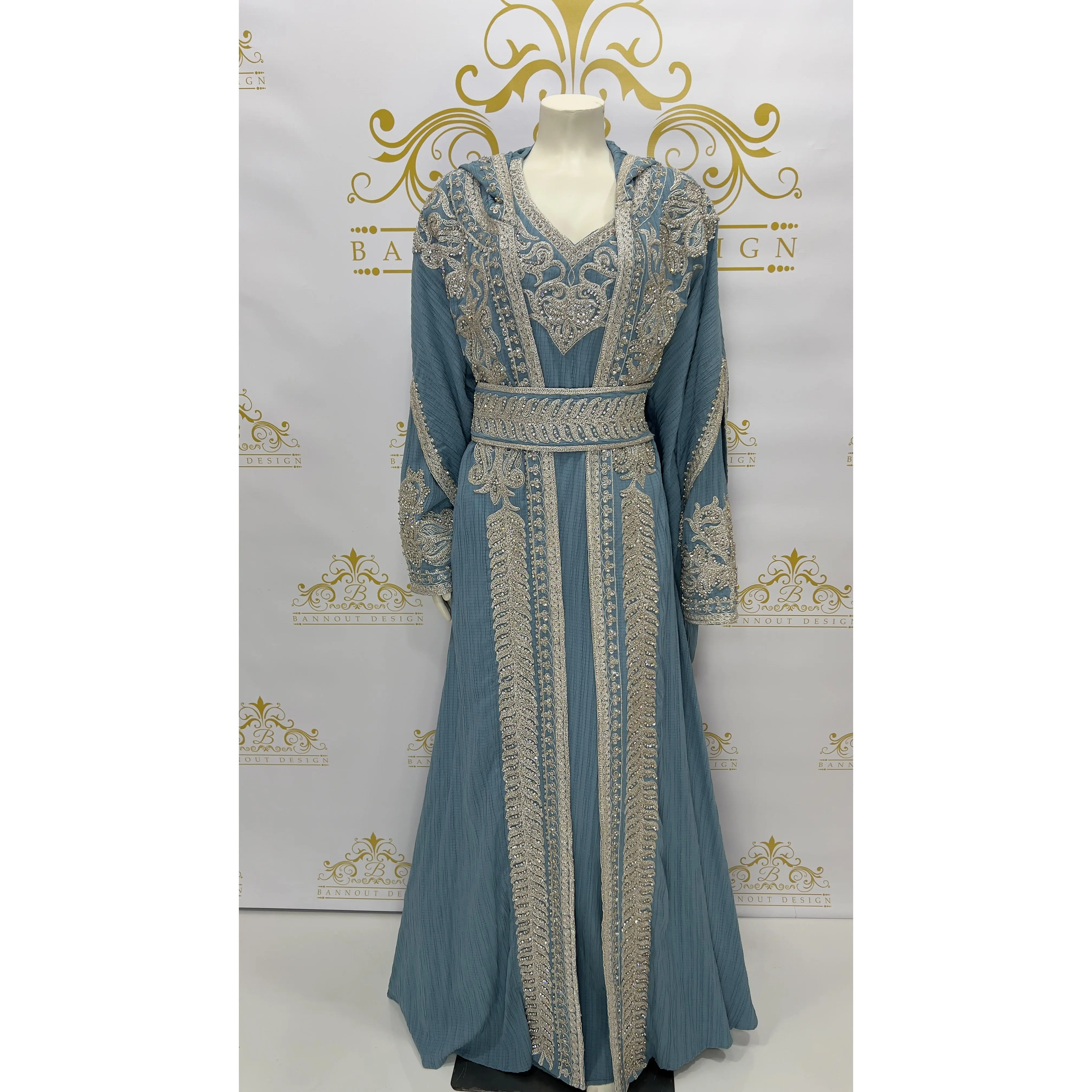 Hooded Butterfly Kaftan Abaya Set 3 Pcs Long Dress Silver Beads & Embroidery