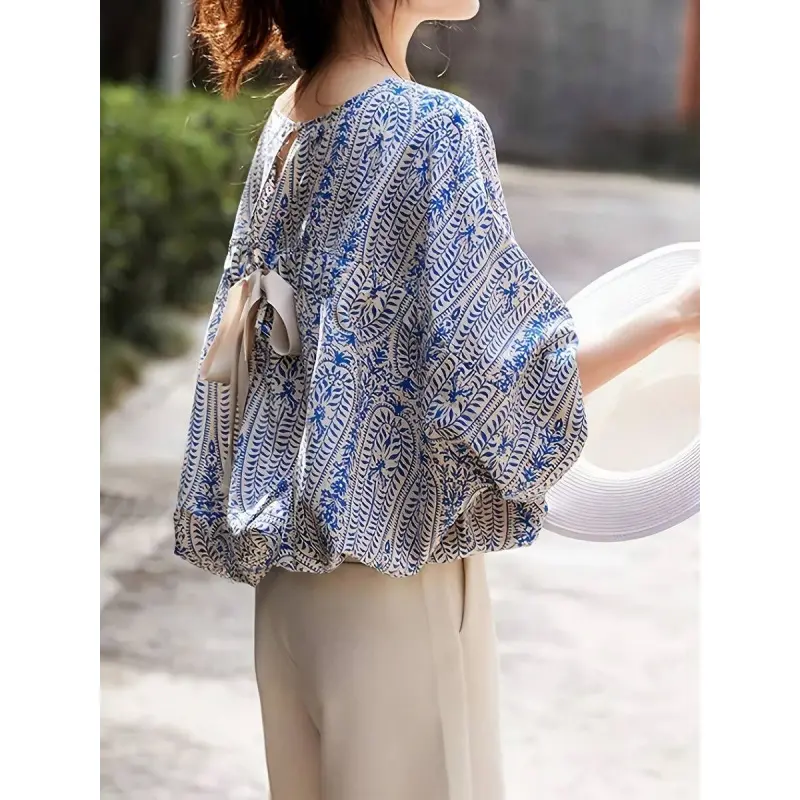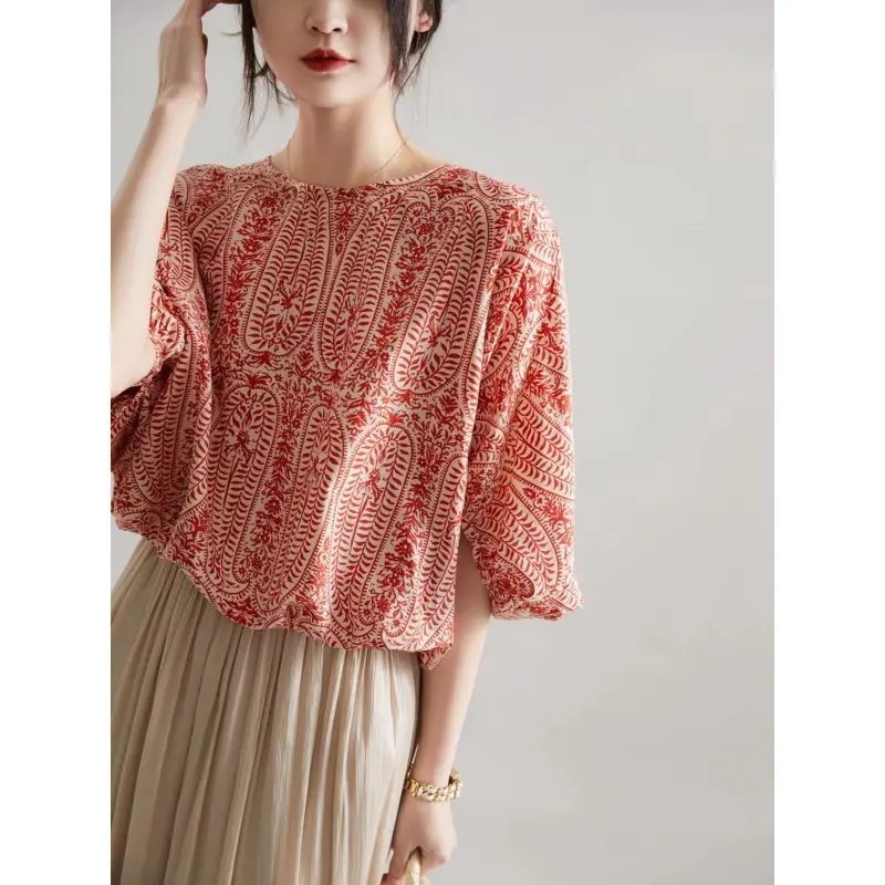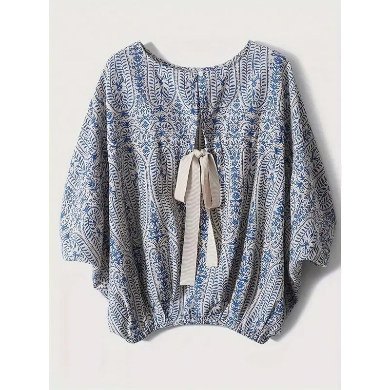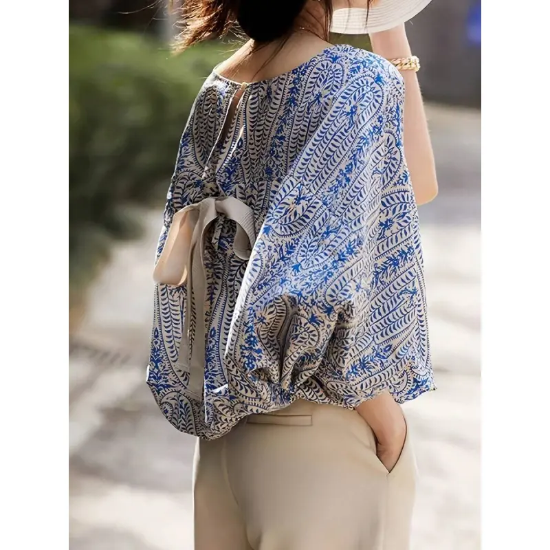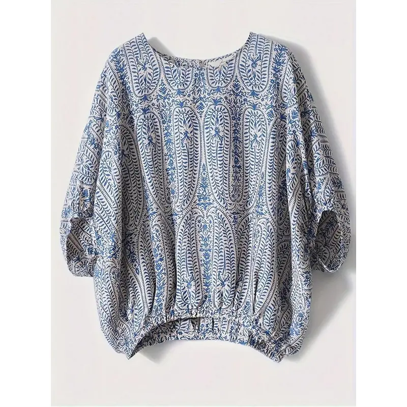 Elegant paisley print short-sleeve shirt, lantern sleeve round neck design - loose fit, polyester material, women's floral pattern, suitable for spring and summer outings and outdoor wear| Lantern sleeve shirt| Printed shirt, women's vacation shir