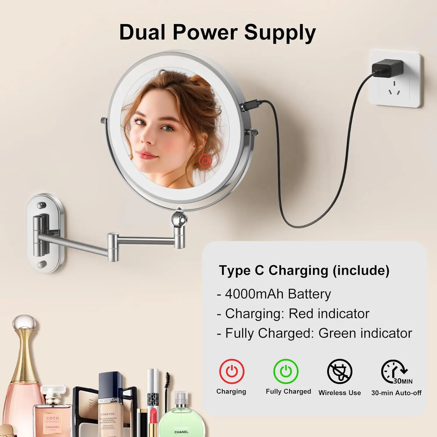 ·4000mAh Rechargeable Cordless Vanity Mirror: Our makeup mirror wall mount is built in 4000mAh rechargeable Lithium battery. Type-C cable and charger is included. No placing batteries needed. Work for more than 12 hours after fully charged, half hours of daily usage, 15 Days of wireless usage. And the lighted makeup mirror with magnification has a 30 mins Auto Light-off Feature to save energy when you forget to turn off the light.