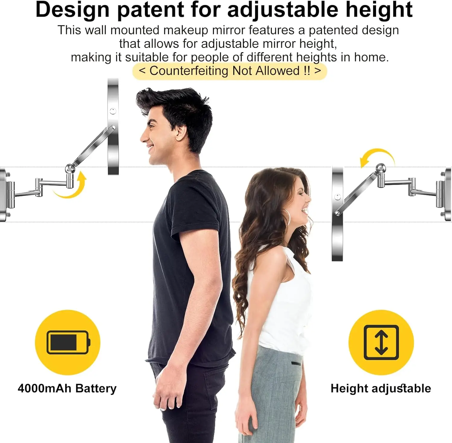 ·Premium Material&Easy Installation: This wall mounted lighted makeup mirror's frame, column, and base are crafted from expensive pearl nickel and feature a multi-layer electroplating and polishing process, providing durability, moisture resistance, and rust resistance. This makeup mirror with lights and magnification is very simple to install, Please check that all accessories are complete before installation, the base can be installed to any wall with simple screws (The bathroom mirror with lights may not be fully charged when leaving the factory, please fully charge it before the first use after installation).