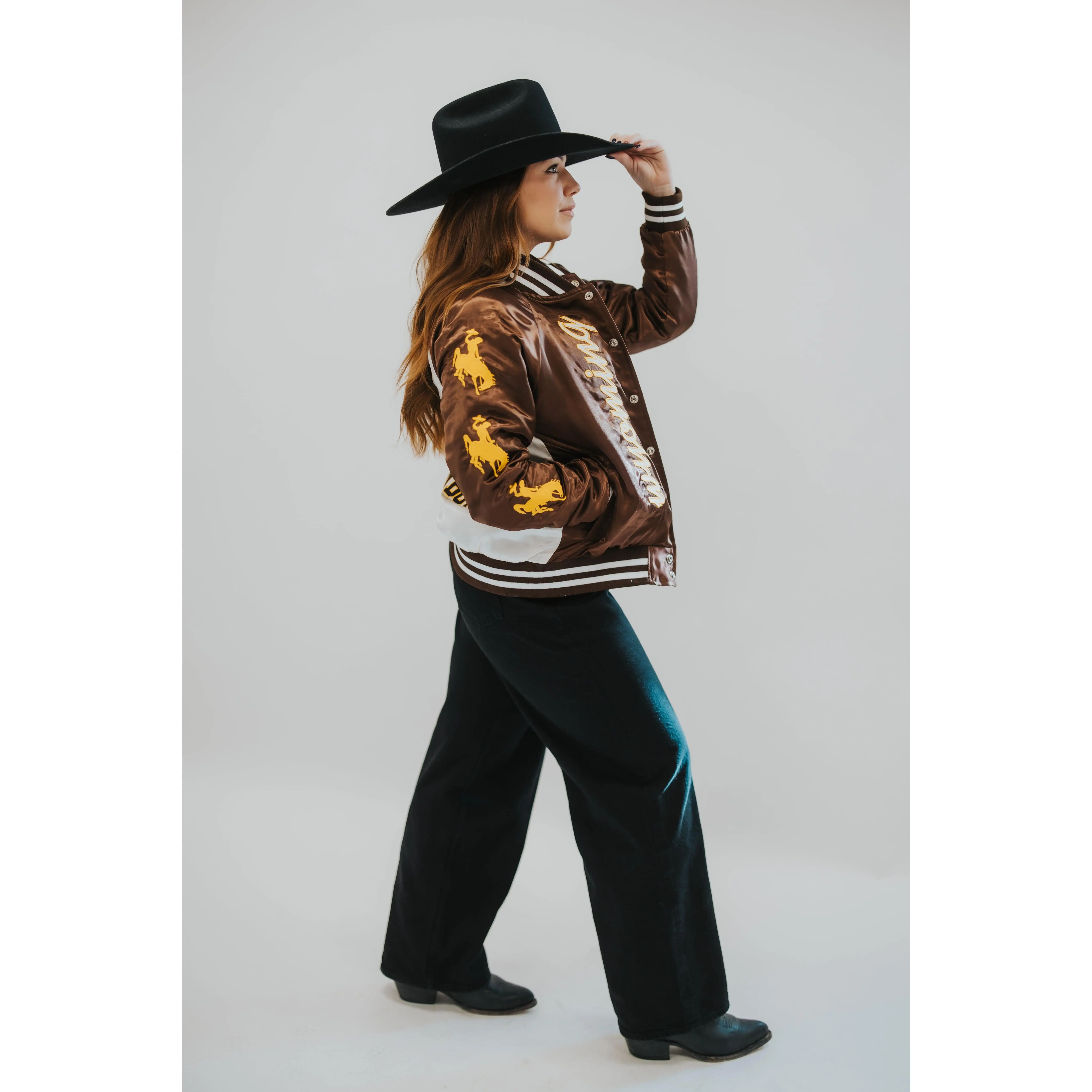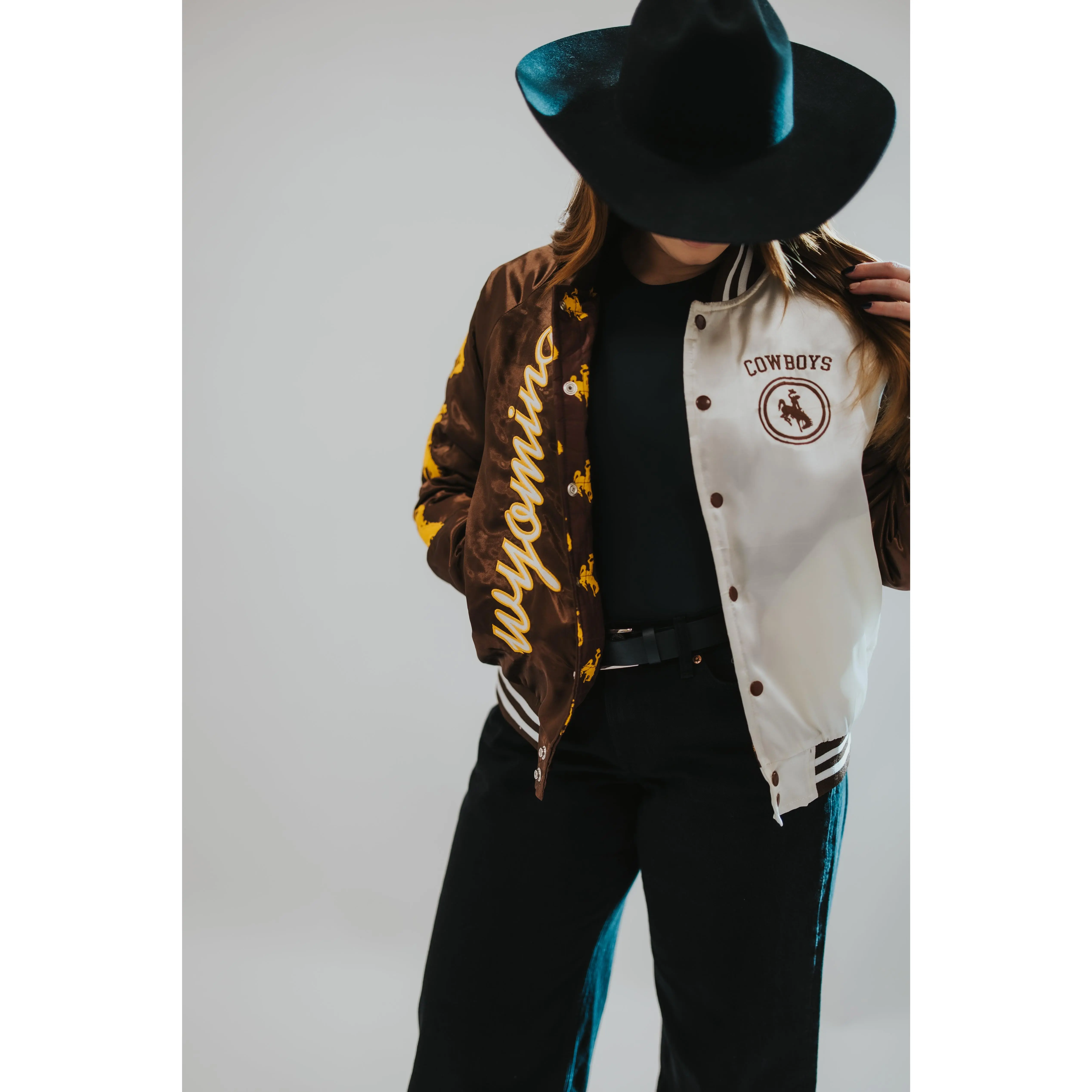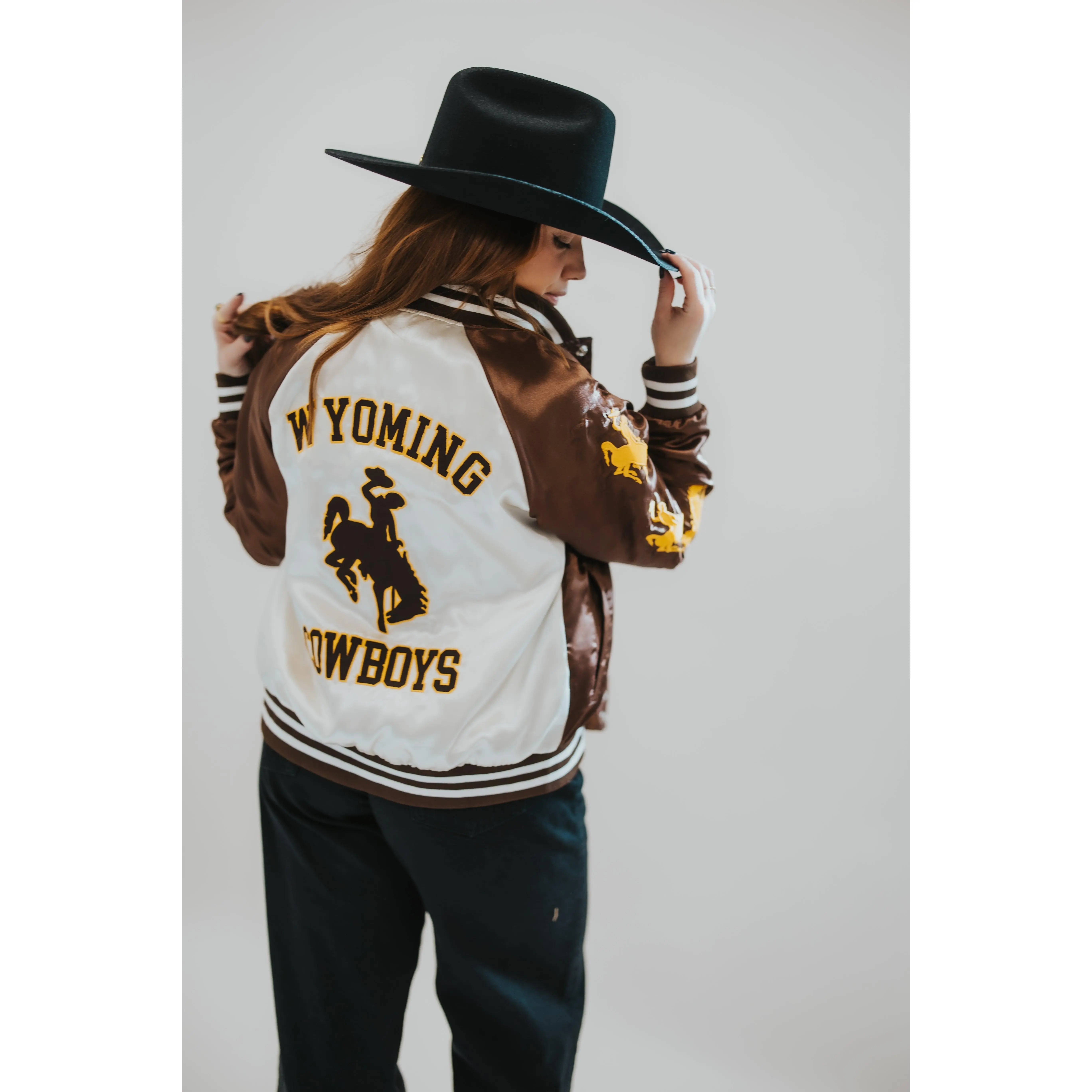 This nylon satin varsity jacket brings timeless collegiate style together with western grit. Designed with official University of Wyoming “Cowboys” and Bucking Horse trademarks, every detail was thoughtfully placed, from the bold back graphic to the embroidered sleeve hits and custom bucking horse interior lining.