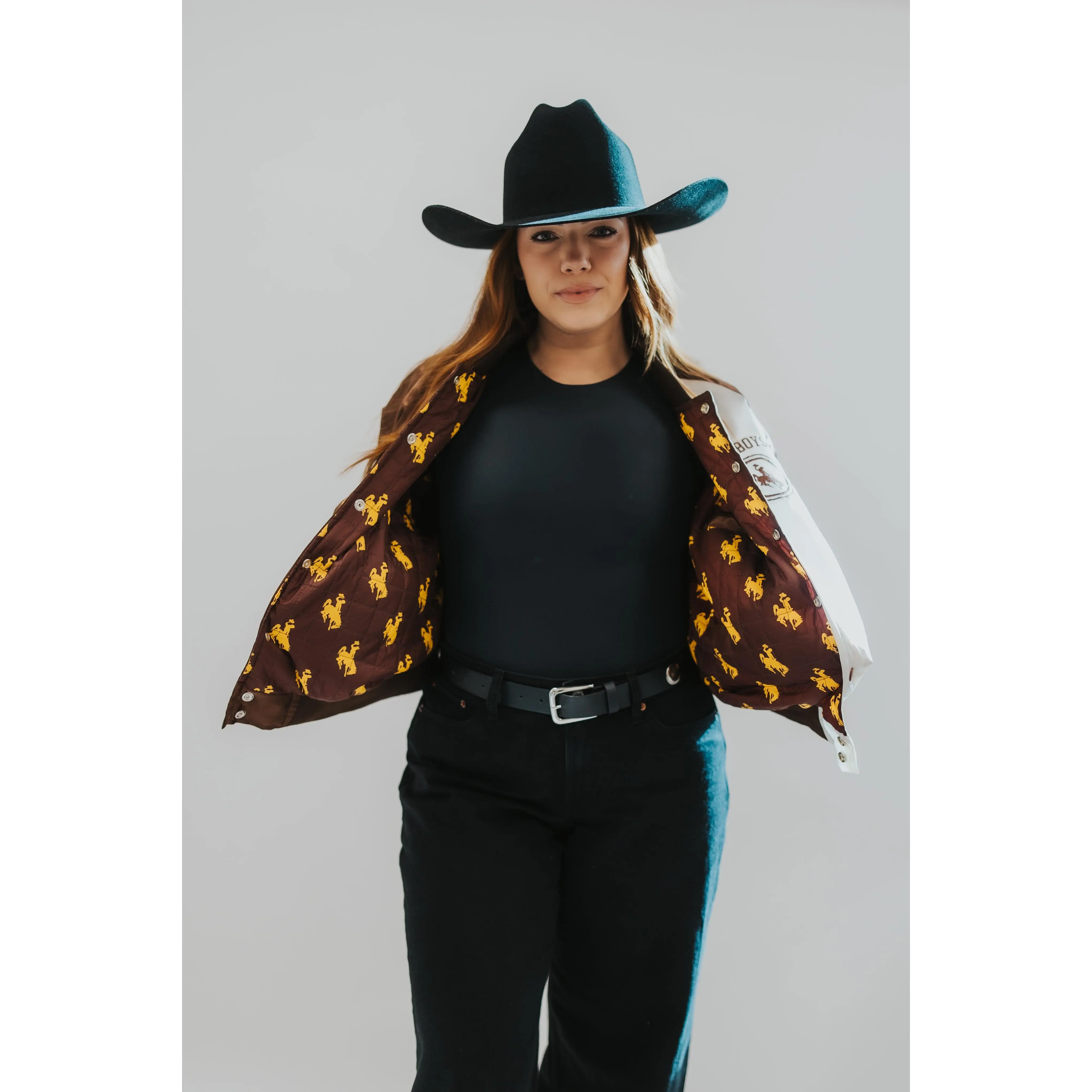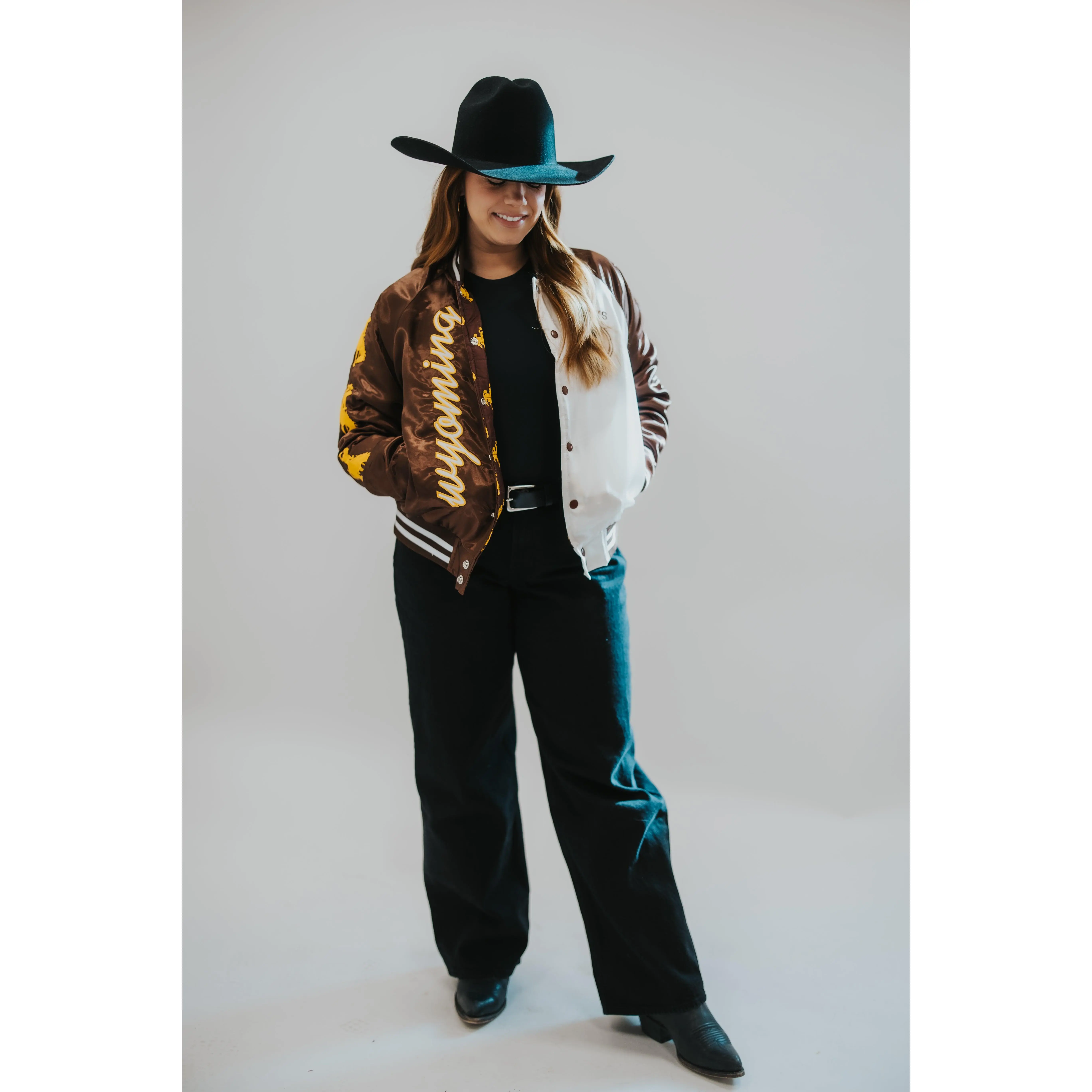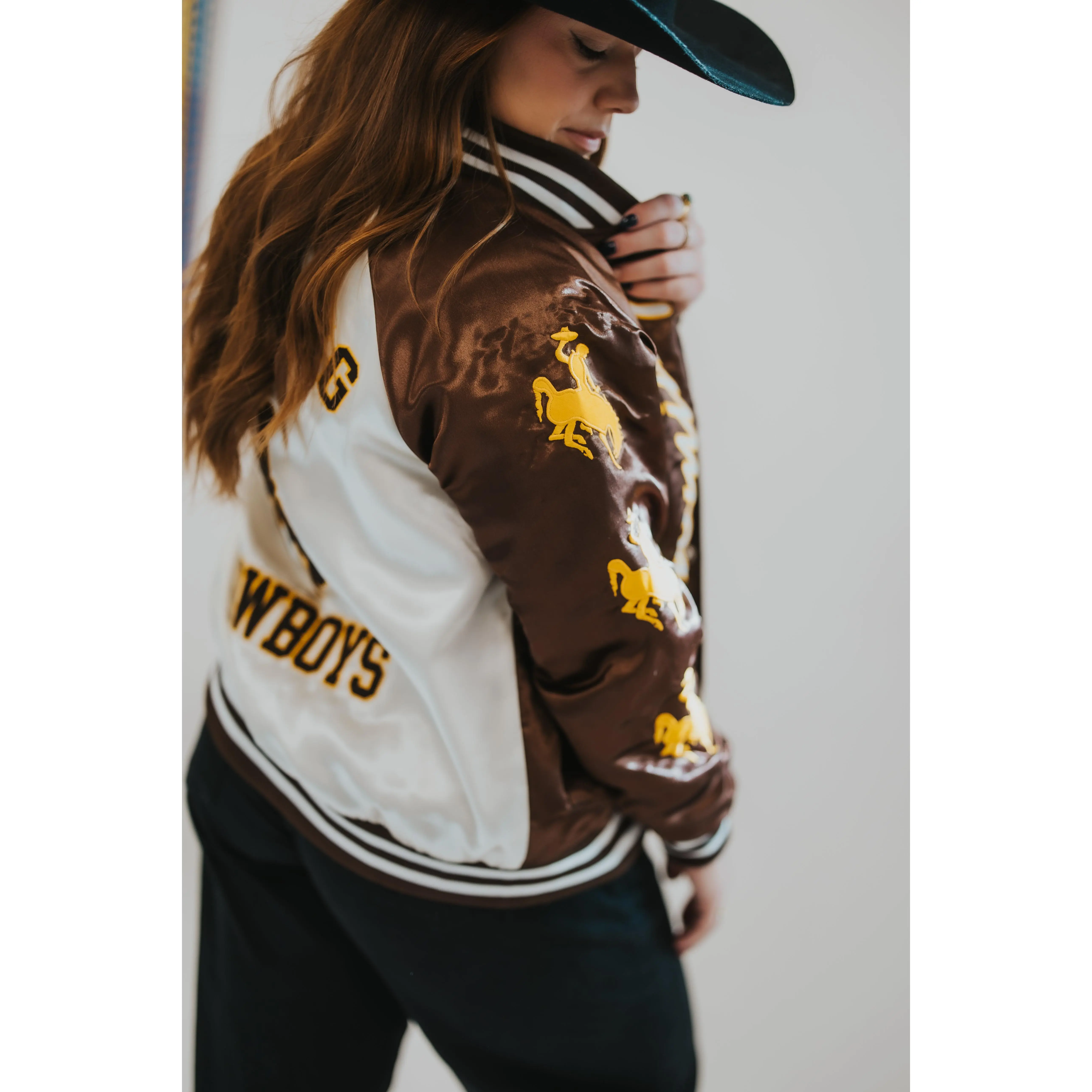This nylon satin varsity jacket brings timeless collegiate style together with western grit. Designed with official University of Wyoming “Cowboys” and Bucking Horse trademarks, every detail was thoughtfully placed, from the bold back graphic to the embroidered sleeve hits and custom bucking horse interior lining.
