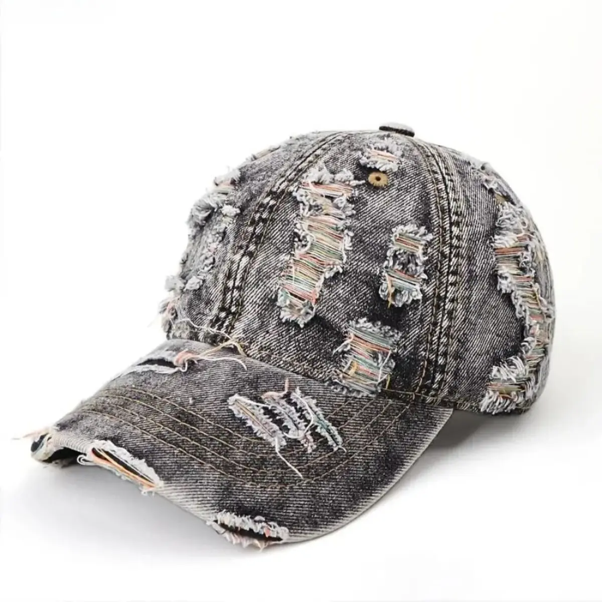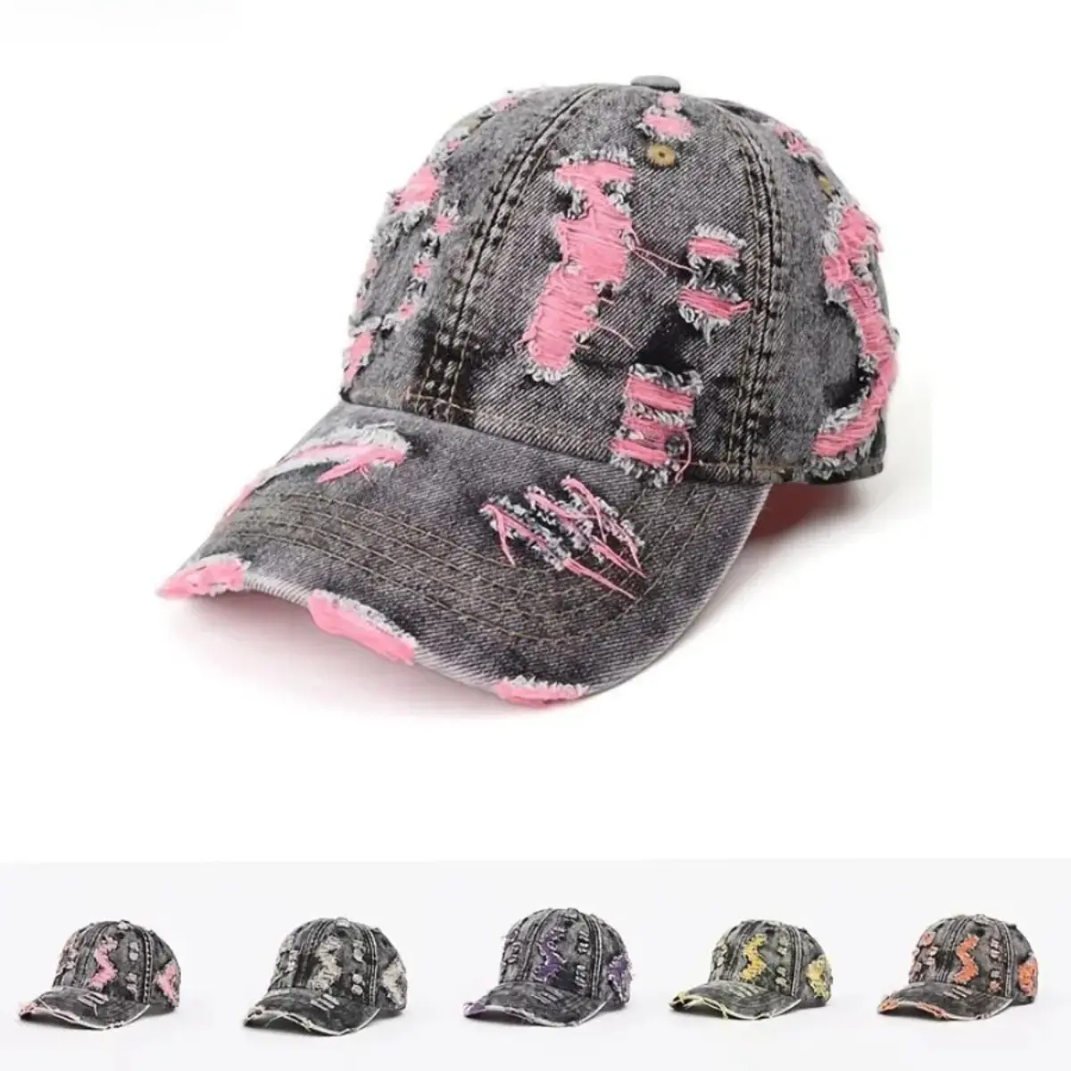 Unisex Distressed Washed Baseball Cap – Vintage Denim Style (with pink and frayed details), Adjustable Snap Back (Suitable for outdoor travel and casual streetwear), Unisex Comfortable Washed Cap (Ideal Gift) – Available in Multiple Colors