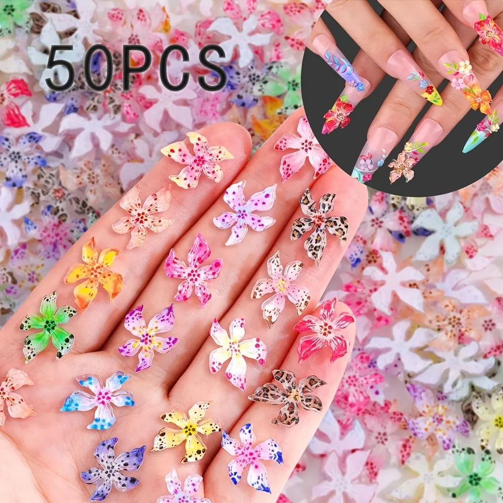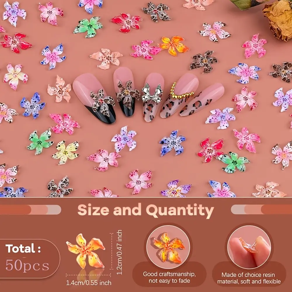 50 Resin Flower Nail Art Decorations, 1.2-1.4cm, Soft Elastic, Vibrant Colors, Leopard Print, Non-Fading 3D Nail Accessories, DIY, Salon, Home Use