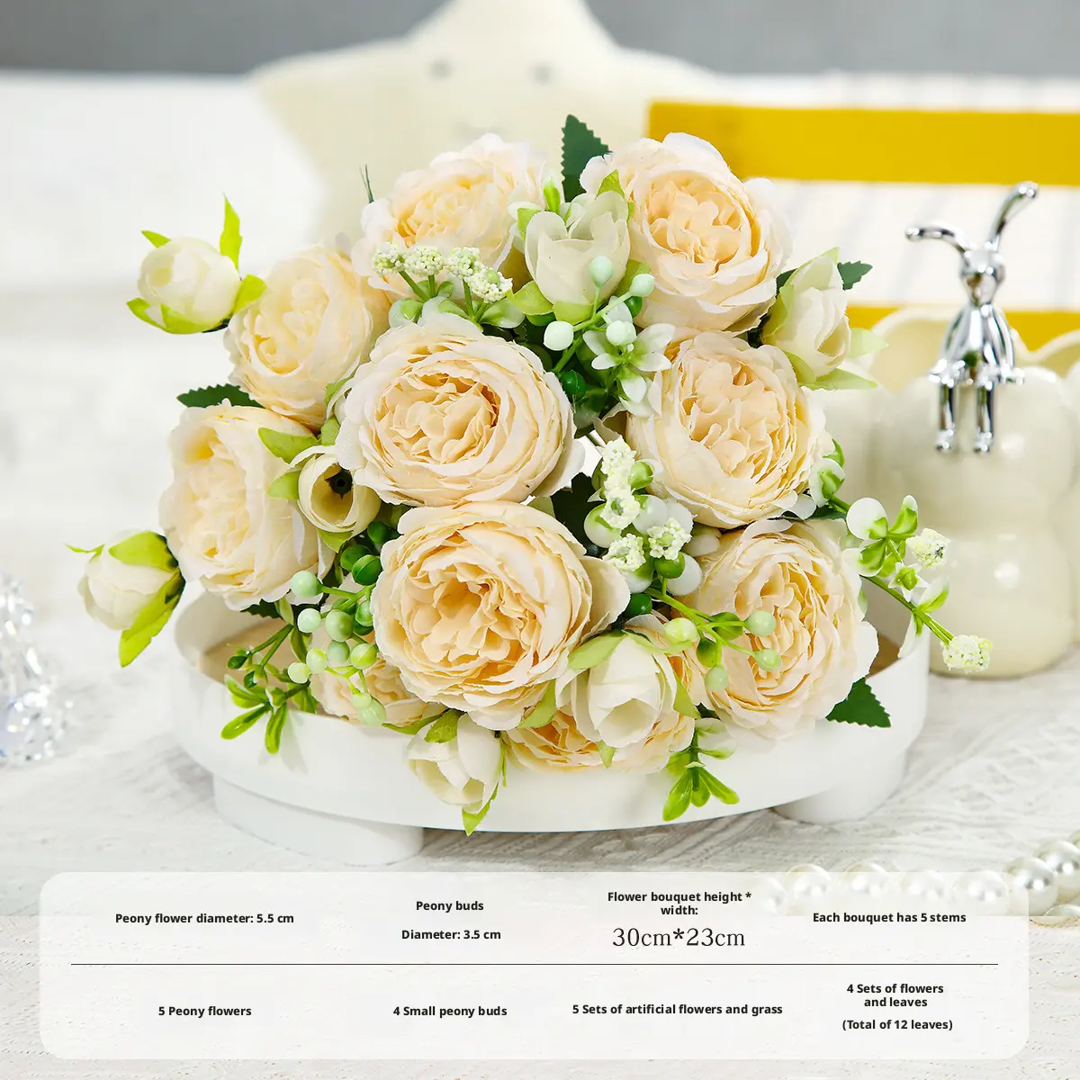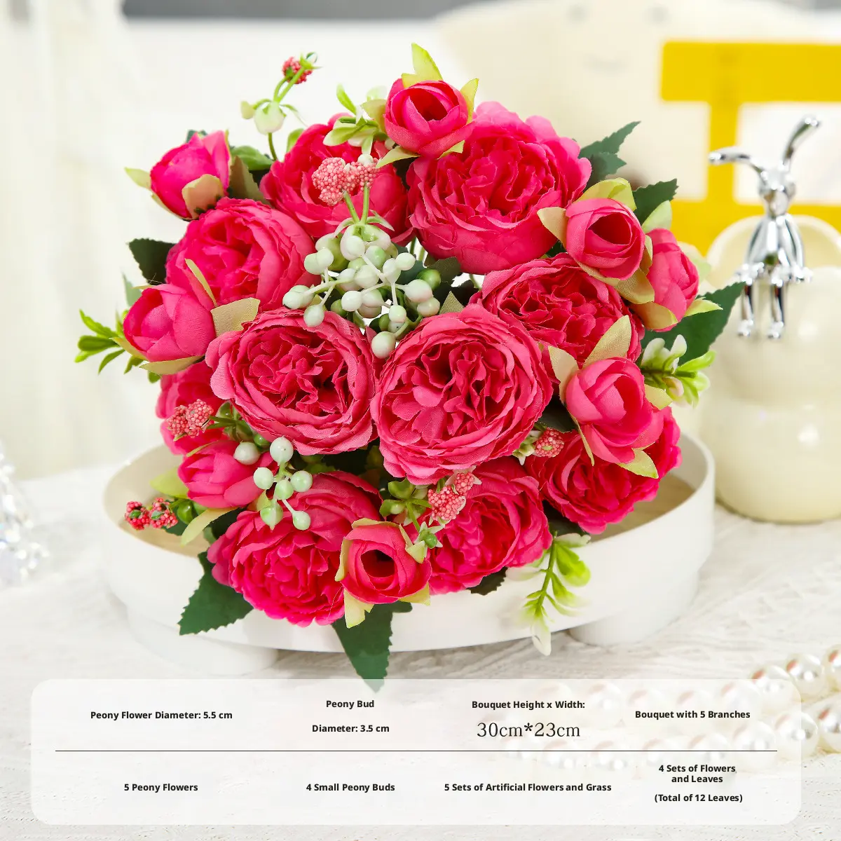 ·Key Dimensions:Large Peony Bloom Diameter:Approx.2.2" (5.5cm)Small Peony Bud Diameter:Approx.1.4" (3.5cm)Overall Bouquet Height x Width:Approx.12" x 9" (30cm x 23cm)