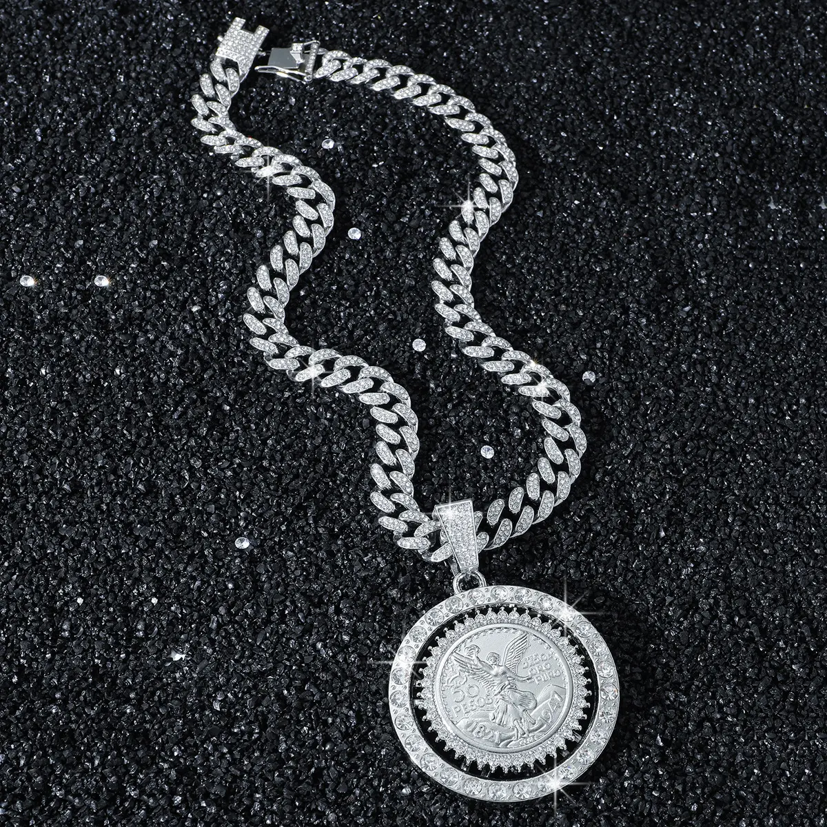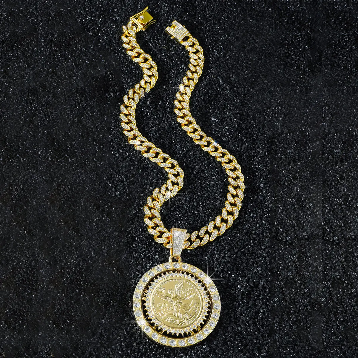 ·Pendant: A detailed replica of the Mexican 50 Pesos gold coin (with "50 PESOS," "ORO PURO," and "1947" inscriptions) surrounded by a double layer of sparkling CZ diamonds.The gold-tone bezel and diamond-encrusted bail add extra luxury.