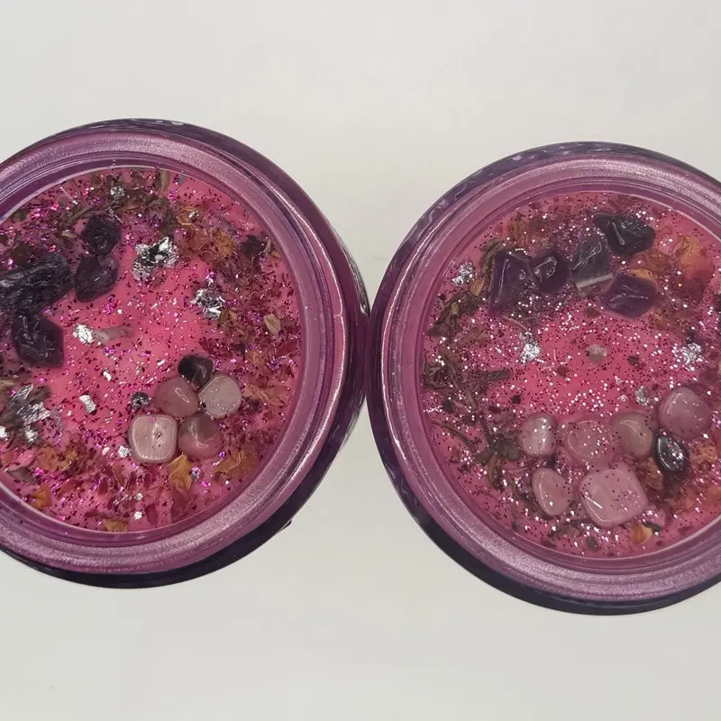 These beautiful Self Love candles are made with 100% soy wax and topped with dandelion leaf and rose petal herbs along with amethyst and rhodonite crystals. Wild roses fragrance oils and they are in a 10 oz purple embossed glass jars.