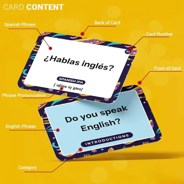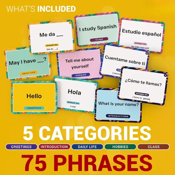 Learn Spanish with 75 essential conversational phrases across five categories: Greetings, Introductions, Daily Life, Hobbies, and Class. Designed for real-world communication and quick recall.