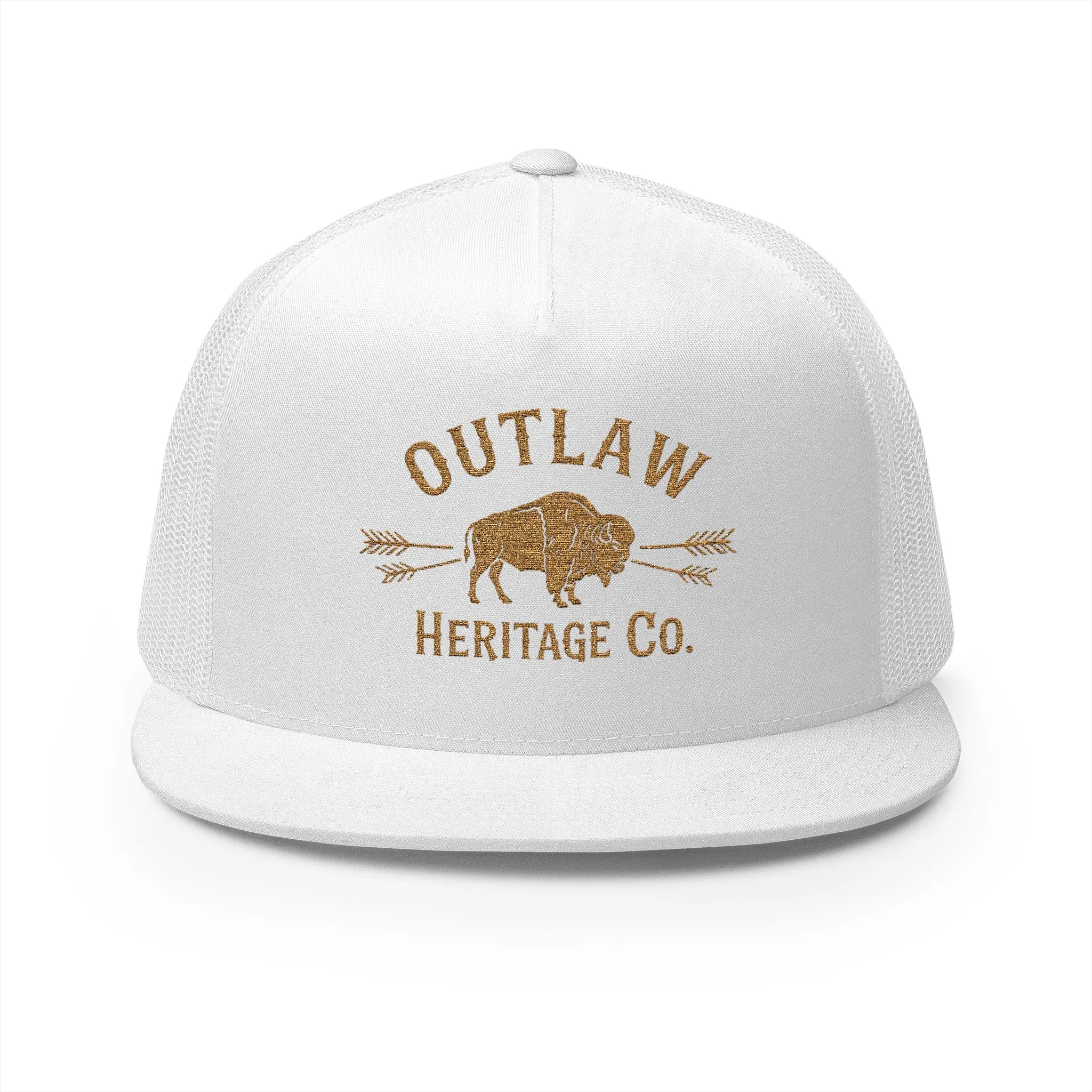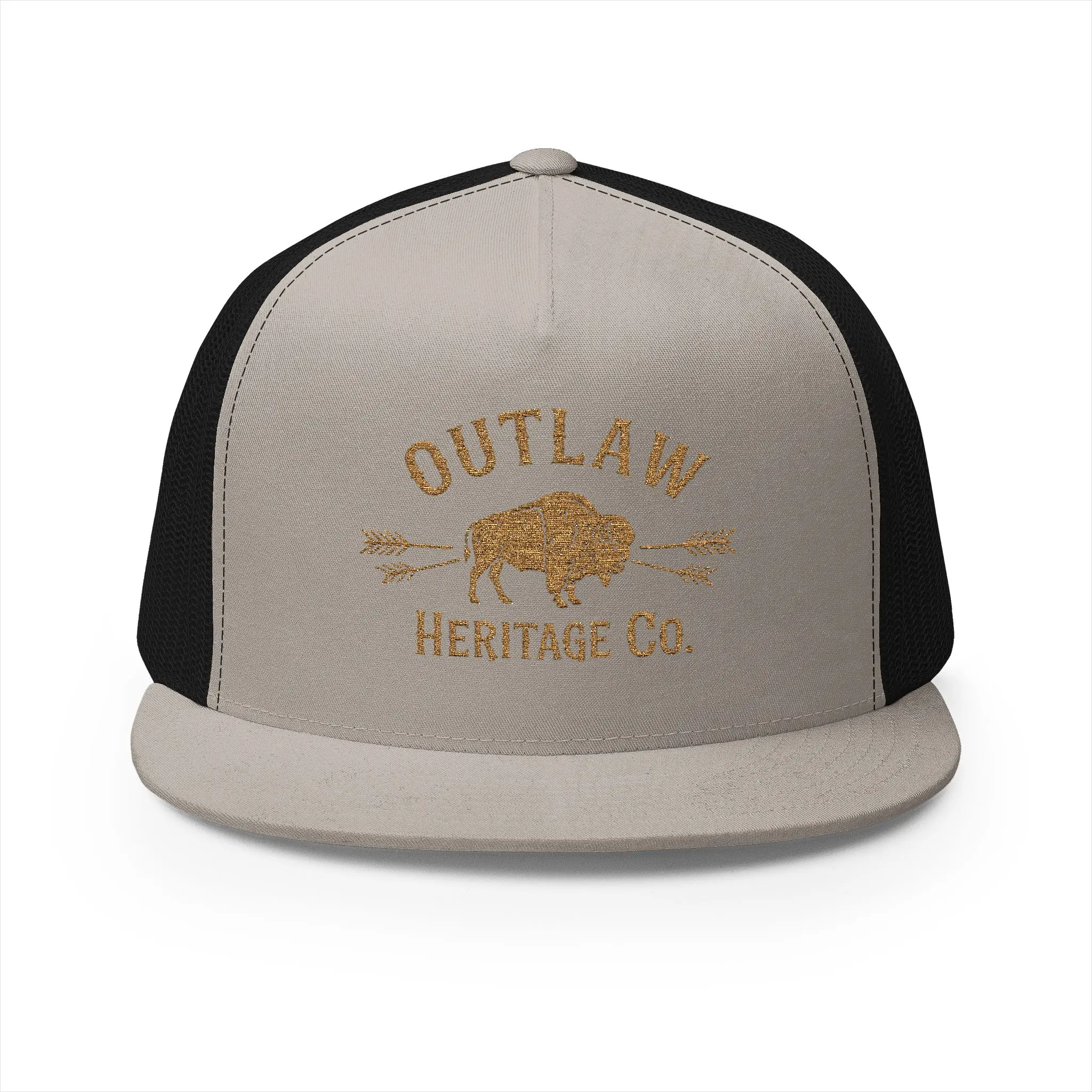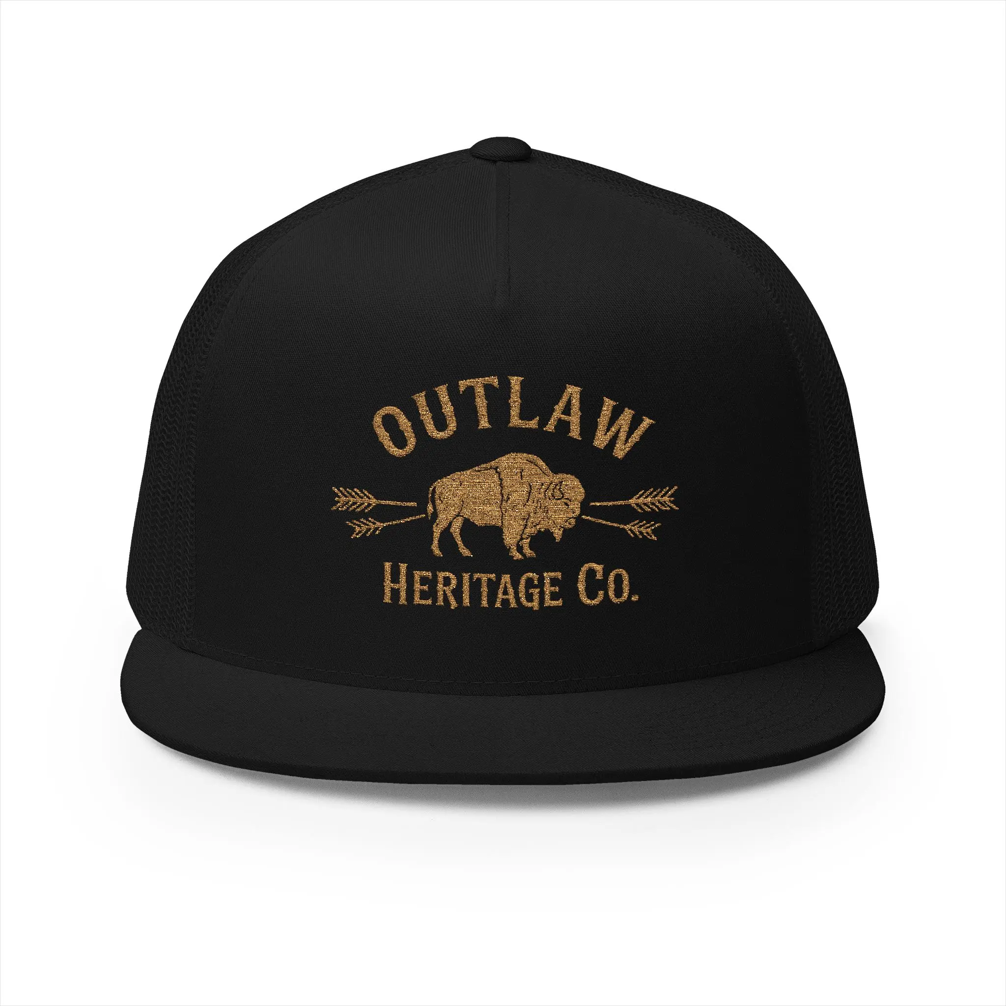 A rugged, vintage-inspired trucker cap that wears like a chapter from the road — sun-faded highways, cracked leather, and campfire glow. The structured five-panel crown and flat bill give it an unmistakable silhouette, while the mesh back keeps you cool on long drives or summer nights. The distressed ‘Outlaw Heritage Co.’ emblem reads like a story badge: rebellious, weathered, and quietly proud. Slide the snapback to fit, tilt the bill down, and it becomes part of your go-everywhere kit — a finish to weekend looks, a companion on dawn patrols, and a small declaration of lived-in style.