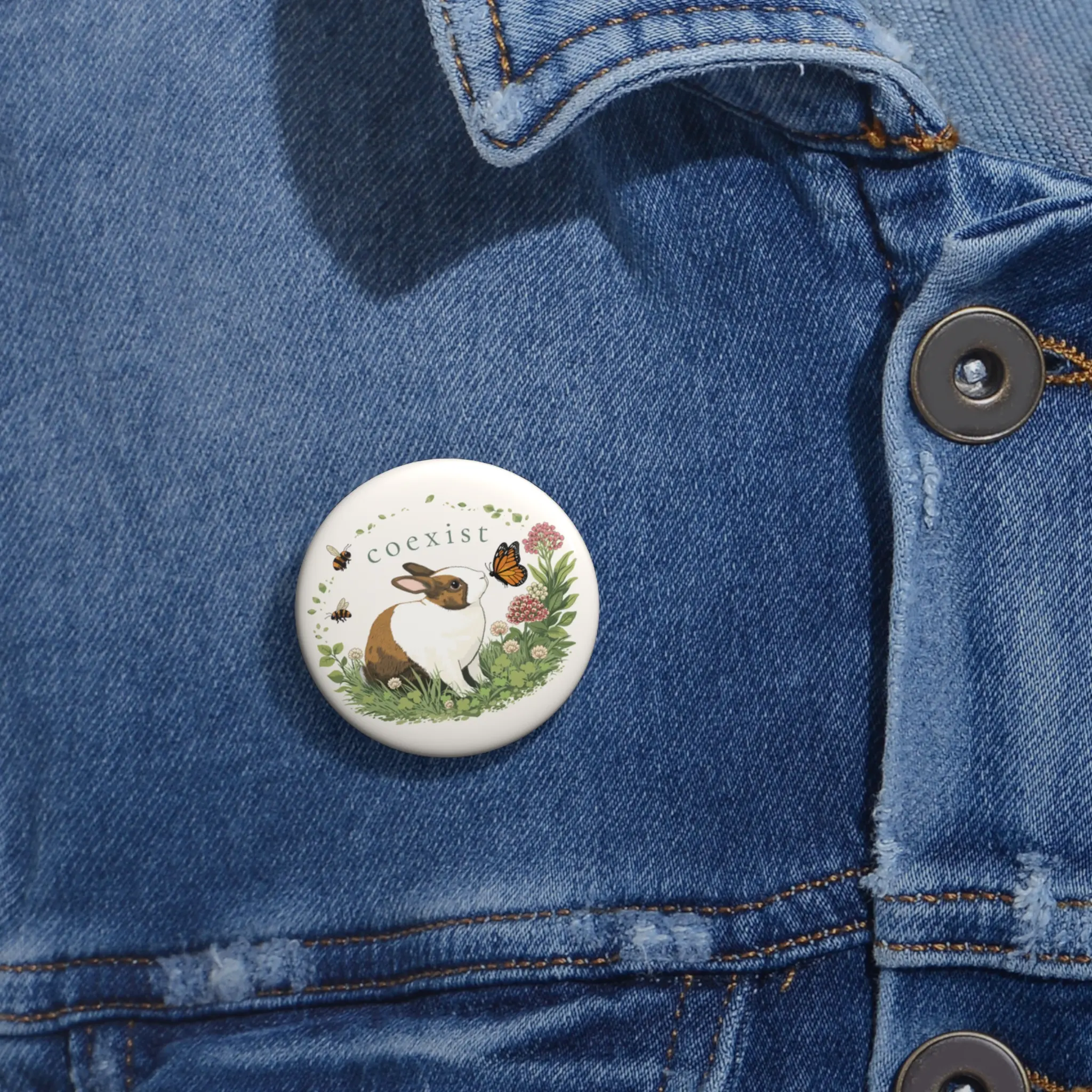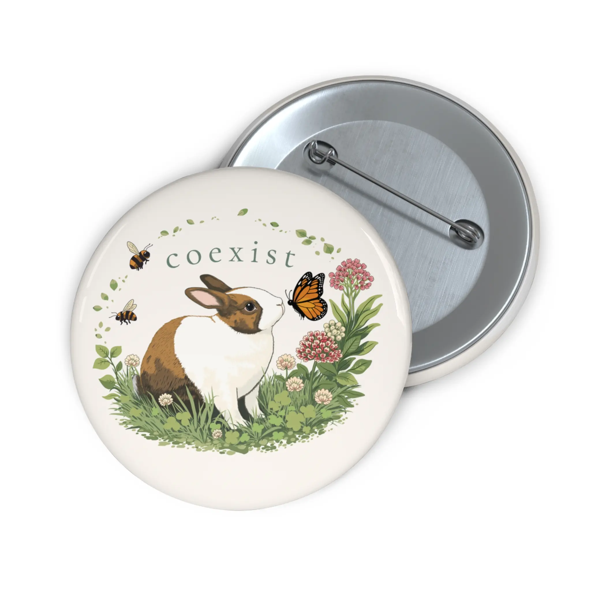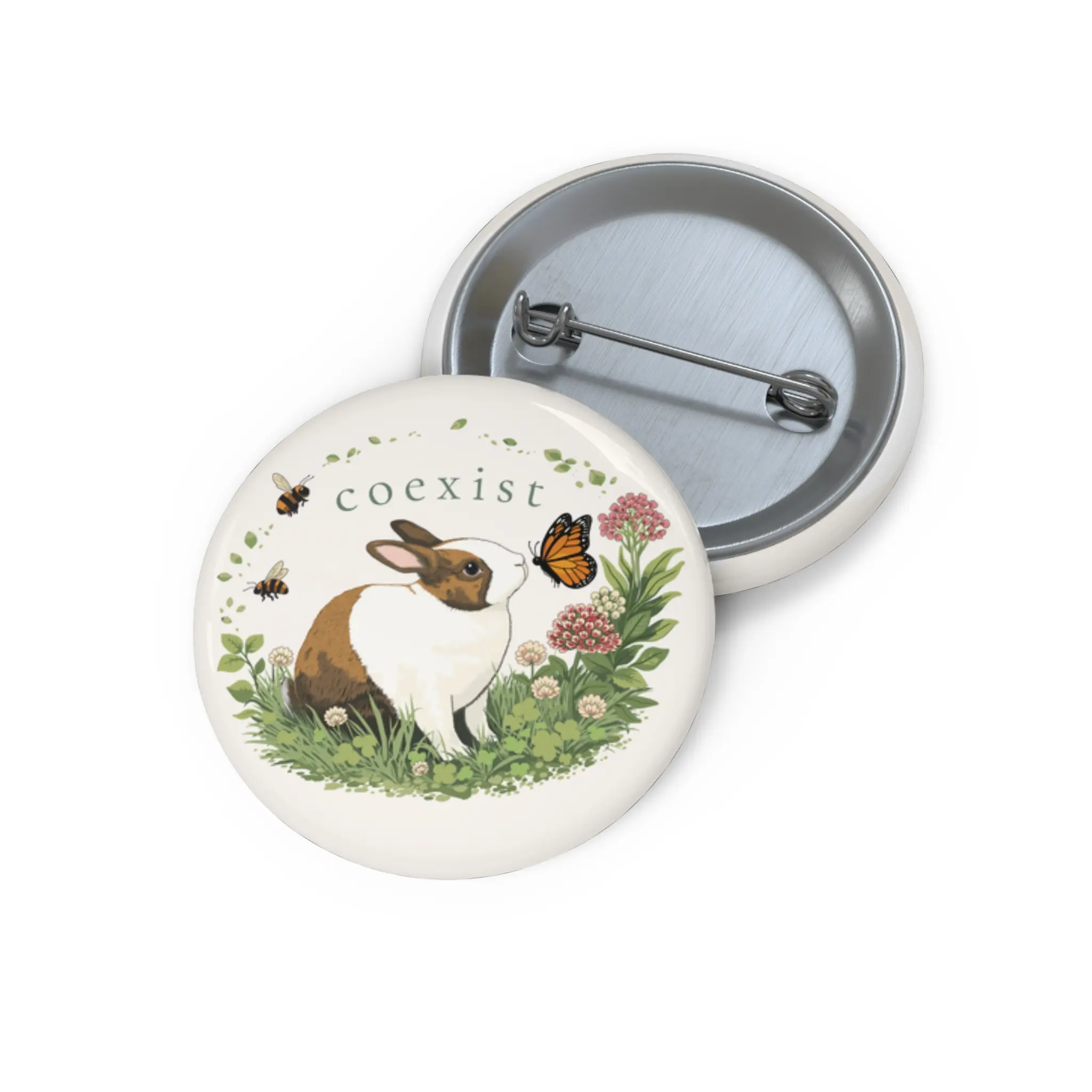 This design features a woodland bunny surrounded by wildflowers, bees, clover, and a monarch, all existing together the way nature intended. The word “coexist” curves above to keep the message simple and grounded.