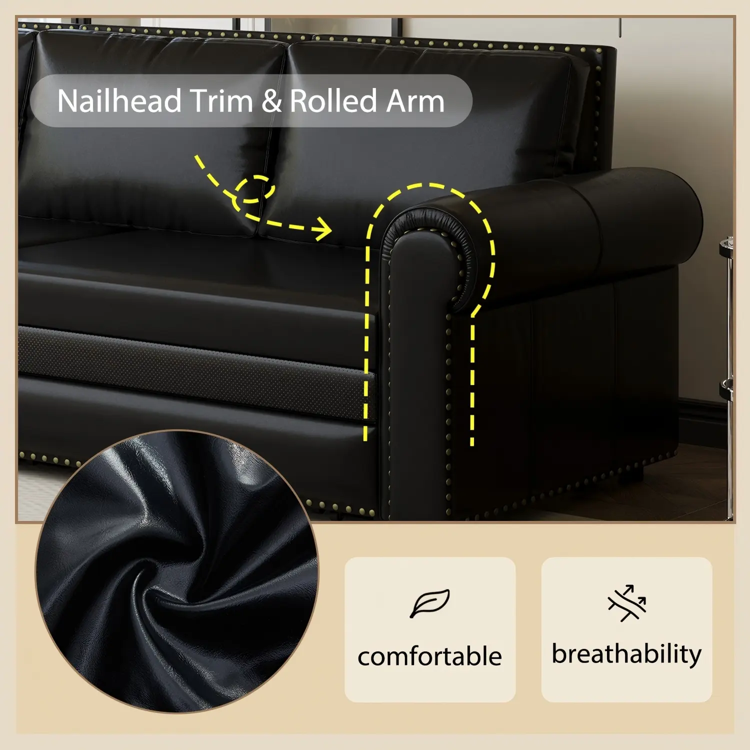·Traditional Retro Style: The Faux Leather sofa has a simple and exquisite design, with a luxurious appearance. The hand-inlaid rivet head trim is elegant and eye-catching, and the classic roll armrests provide comfortable support. The couches for living room blends traditional vintage with modern chic, making it the perfect addition to living rooms, apartments, offices and other seating areas.