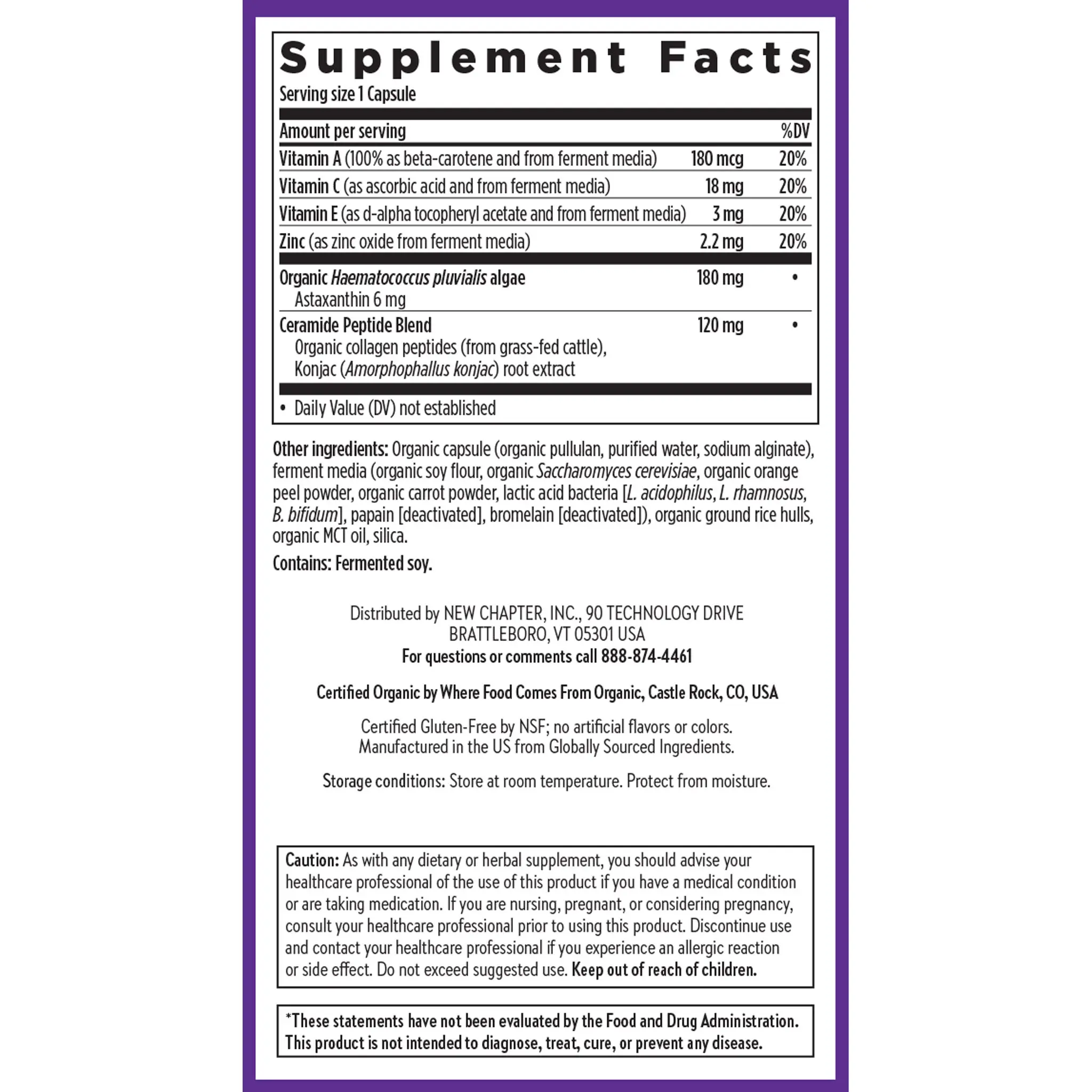 Calories 30 Total Carbohydrates 7 g 3%** Vitamin A (100% as beta-carotene) 900 mcg 100% Vitamin C (as ascorbic acid) 18 mg 20% Vitamin D3 (as cholecalciferol from lichen) 14 mcg (560 IU) 70% Vitamin E (as d-alpha-tocopheryl acetate) 15 mg 100% Vitamin K (as phylloquinone [K1]) 60 mcg 50% Thiamin (as thiamine hydrochloride and from ferment media) 2.5 mg 208% Riboflavin (and from ferment media) 2.5 mg 192% Niacin (as niacinamide and as nicotinic acid from ferment media) 30 mg 188% Vitamin B6 (as pyridoxine hydrochloride and from ferment media) 2.5 mg 147% Folate (as L-5-methylfolate) 80 mcg DFE 20% Vitamin B12 (as cyanocobalamin) 2.4 mcg 100% Biotin (and from ferment media) 30 mcg 100% Pantothenic Acid (as calcium D-pantothenate and from ferment media) 5 mg 100% Choline (as choline bitartrate) 20 mg 4% Calcium (as calcium citrate) 26 mg 2% Iodine (as potassium iodide) 150 mcg 100% Magnesium (as magnesium citrate) 13 mg 3% Zinc (as zinc citrate) 5.5 mg 50% Selenium (as selenium glycinate) 55 mcg 100% Manganese (as manganese citrate) 0.04 mg 2% Chromium (as chromium picolinate) 2.3 mcg 7% Molybdenum (as molybdenum glycinate chelate) 45 mcg 100% Organic Superfood Blend Organic Elderberry (Sambucus nigra) (fruit), Organic Black Currant (Ribes nigrum) (fruit) extract, Organic Grape (Vitis vinifera) (seed) extract, Organic Acerola (Malpighia glabra L.) (fruit) 100 mg •,Other ingredients (Orange Mango): Water, organic glycerin, natural flavors; Less than 2% of: ferment media (Saccharomyces cerevisiae, molasses), organic stevia leaf extract, malic acid, citric acid (preservative), xanthan gum.,Vitamin A (100% as beta-carotene and from ferment media) 180 mcg 20% Vitamin C (as ascorbic acid and from ferment media) 18 mg 20% Vitamin E (as d-alpha tocopheryl acetate from ferment media) 3 mg 20% Zinc (as zinc oxide from ferment media) 2.2 mg 20% Organic Haematococcus pluvialis algae Astaxanthin 6 mg 180 mg • Ceramide Peptide Blend Organic collagen peptides (from grass-fed cattle), Konjac (Amorphophallus konjac) root extract 120 mg •,Other ingredients: Organic capsule (organic pullulan, purified water, sodium alginate), ferment media (organic soy flour, organic Saccharomyces cerevisiae, organic orange peel powder, organic carrot powder, lactic acid bacteria [L. acidophilus, L. rhamnosus, B. bifidum], papain [deactivated], bromelain [deactivated]), organic ground rice hulls, organic MCT oil, silica.