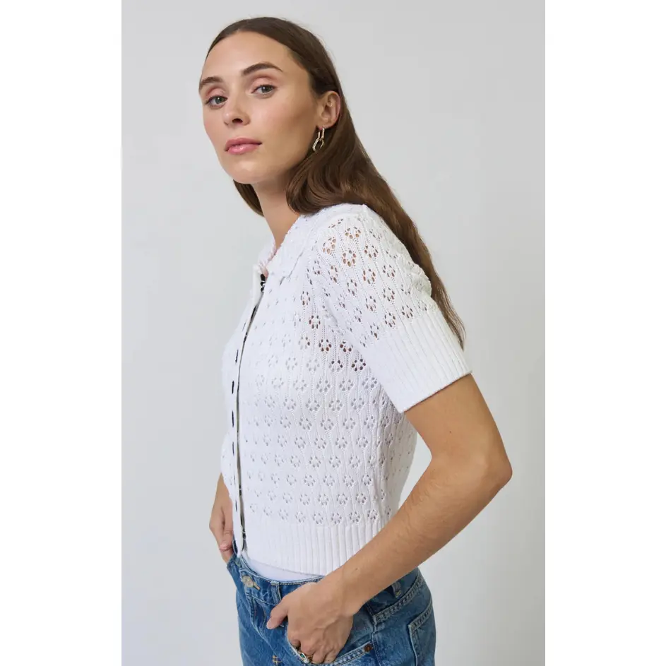 A breathable spring knit with darling details. Featuring an intricate pointelle pattern, short sleeves, collared neck, bold black stitching on front, ribbed trim and a soft white. Style with denim jeans and slides.
