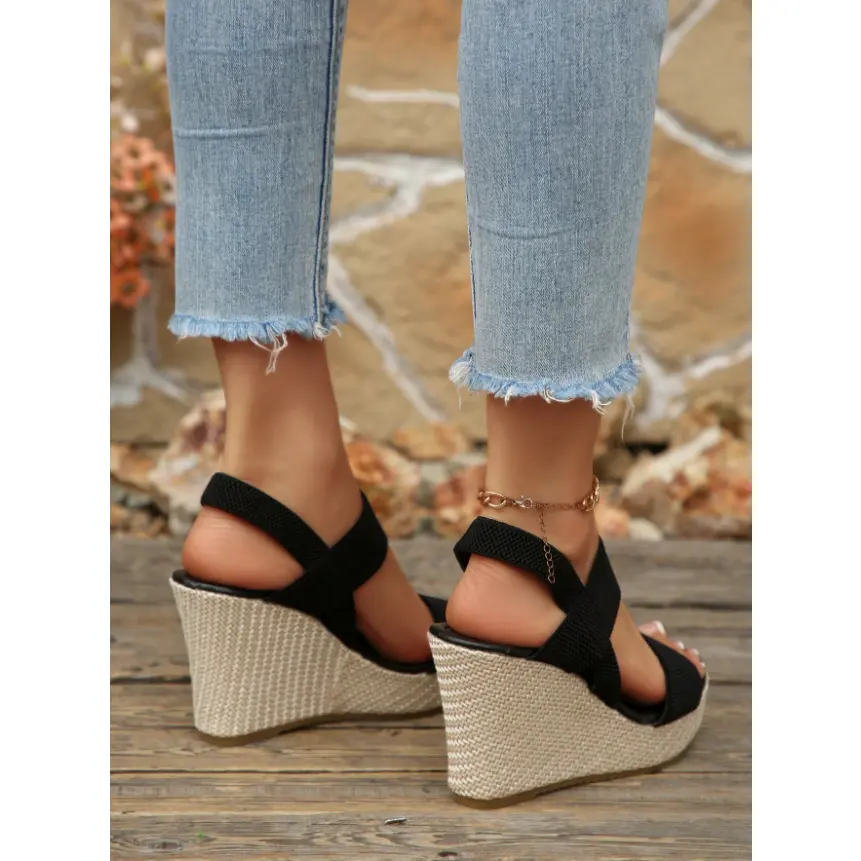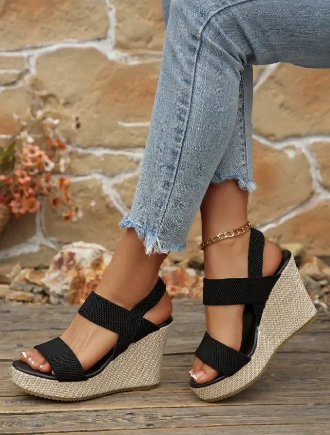 Description:Stylish women's black wedge sandals featuring an open-toe design, secure ankle strap, and comfortable platform sole. A versatile choice for casual outings, summer wear, vacations, and everyday styling.