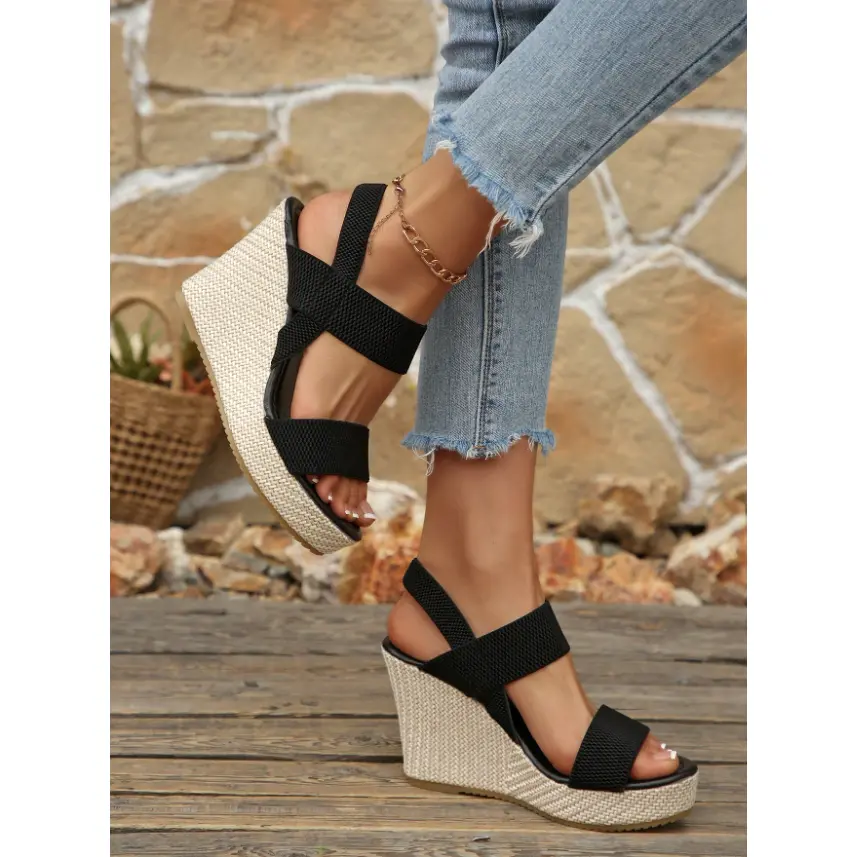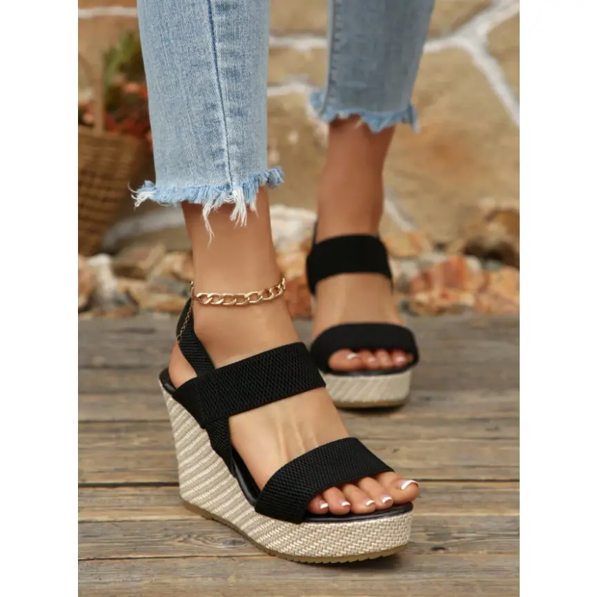 Women's Black Open-Toe Platform Wedge SandalsFeatures:- Open-toe design- Adjustable ankle strap- Platform wedge sole- Comfortable for everyday wear- Great for casual and summer outfitsColor:BlackStyle:Strappy wedge sandalsSizes:US 6 / 7 / 7.5 / 8 / 9 / 10 / 10.5 / 11Description:Stylish women's black wedge sandals featuring an open-toe design, secure ankle strap, and comfortable platform sole. A versatile choice for casual outings, summer wear, vacations, and everyday styling.
