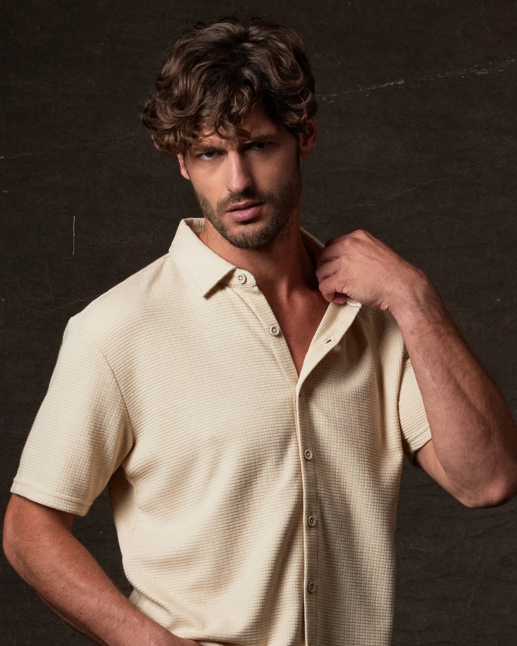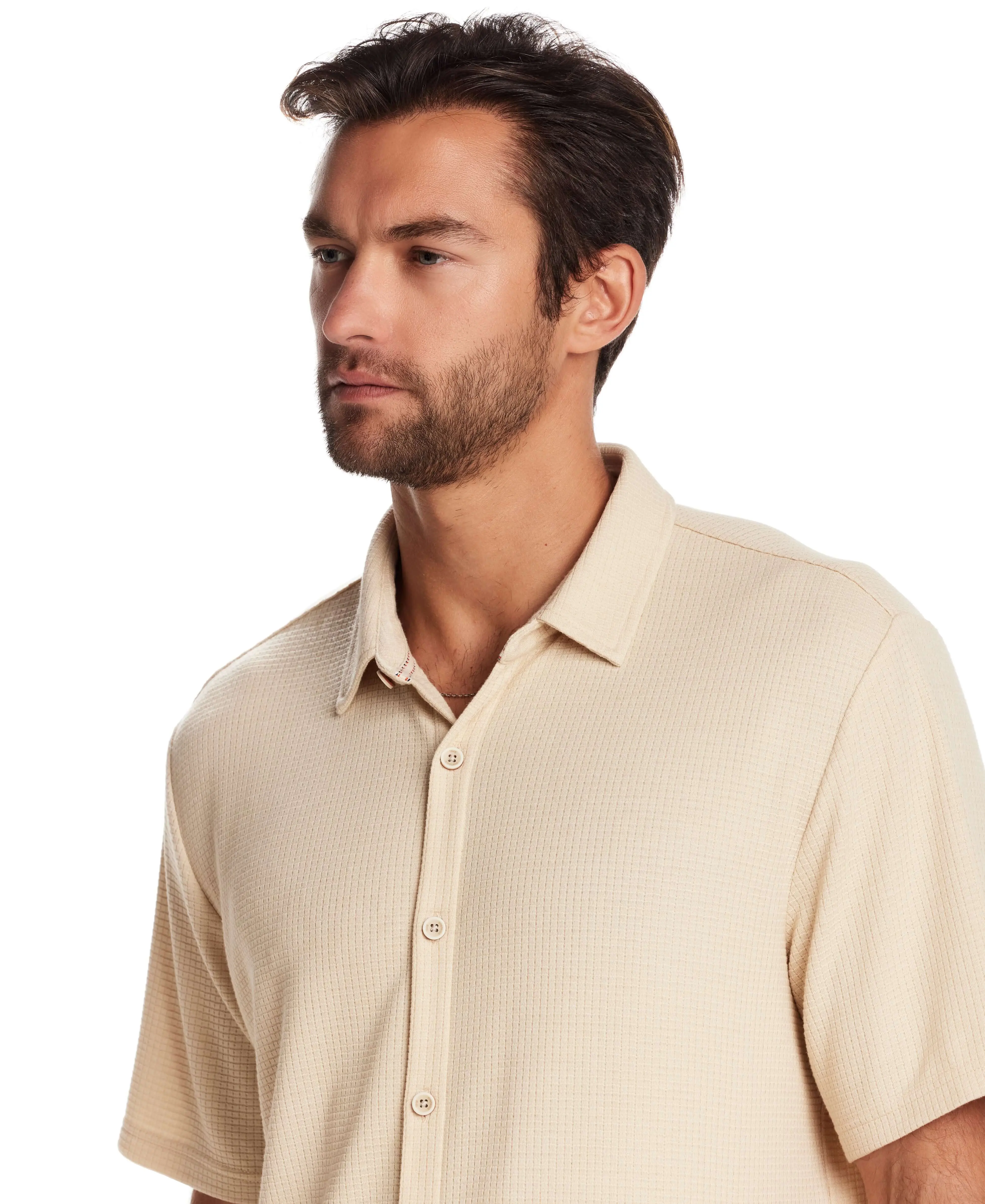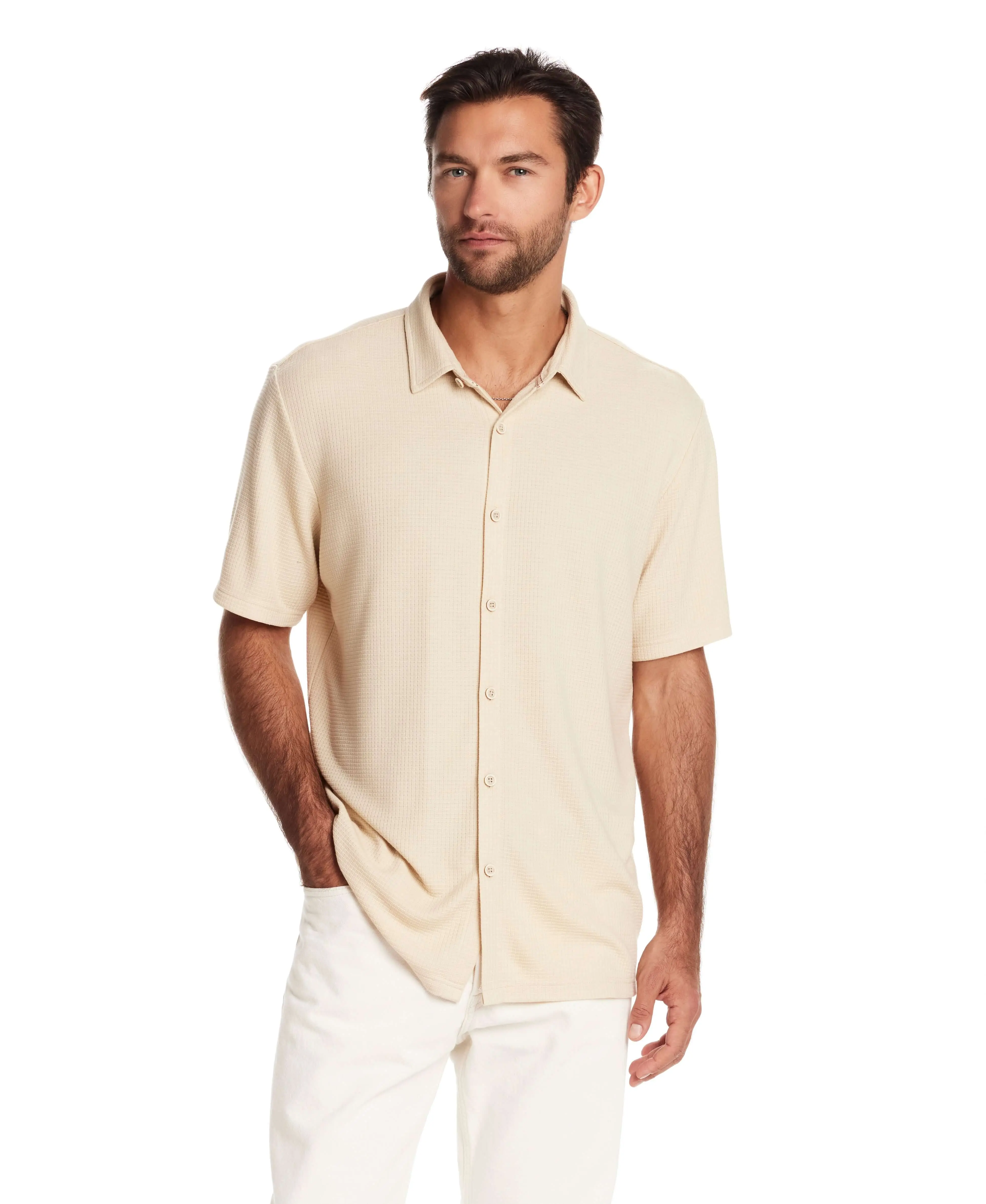 A soft stretch waffle knit brings comfort and subtle texture to this short sleeve shirt, designed with a relaxed fit and modern ease. A versatile piece for casual or layered looks.
