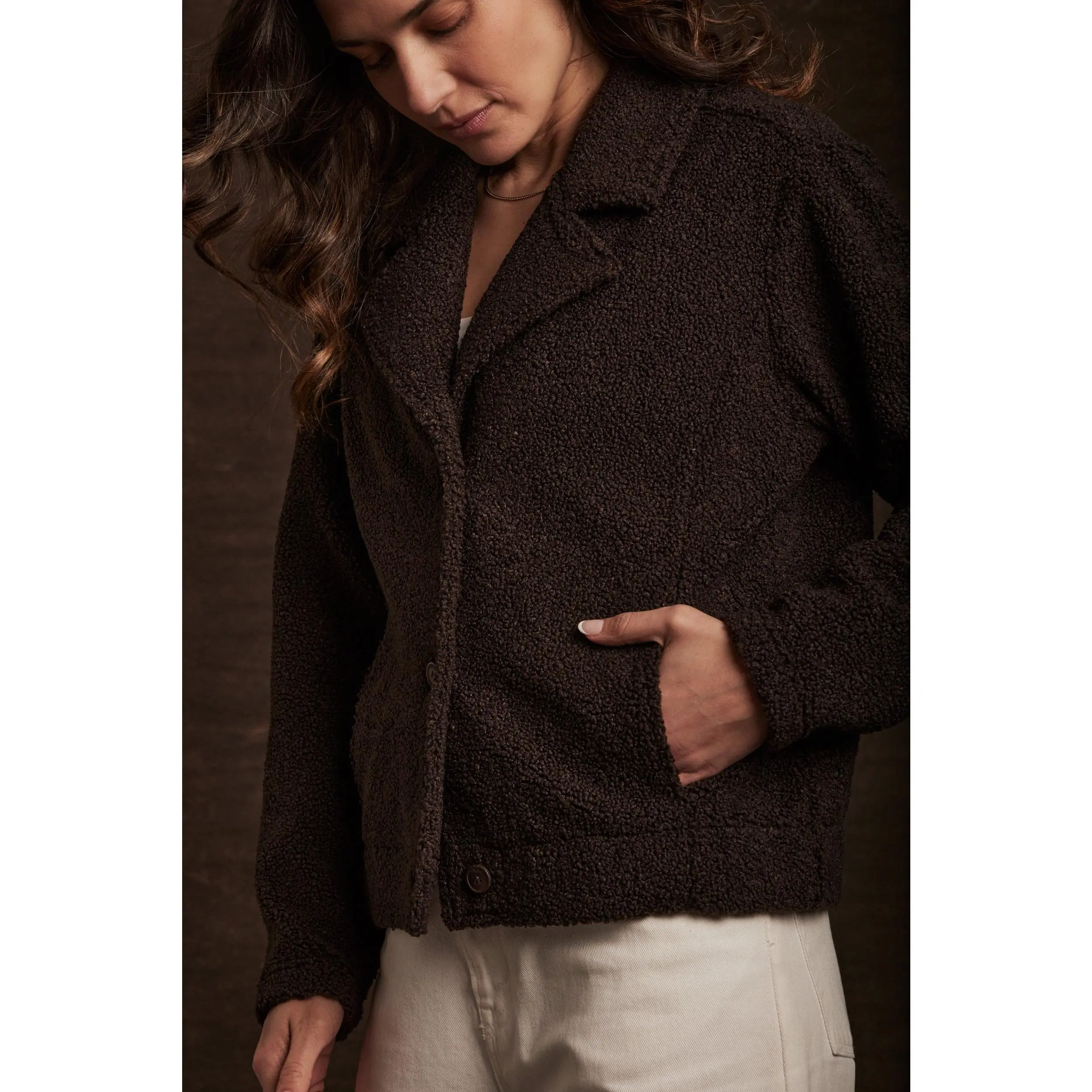 Detail: Soft sherpa fleece texture, notched lapel collar, button-front closure, side-entry hand pockets, elastic waistband for a flexible fit.