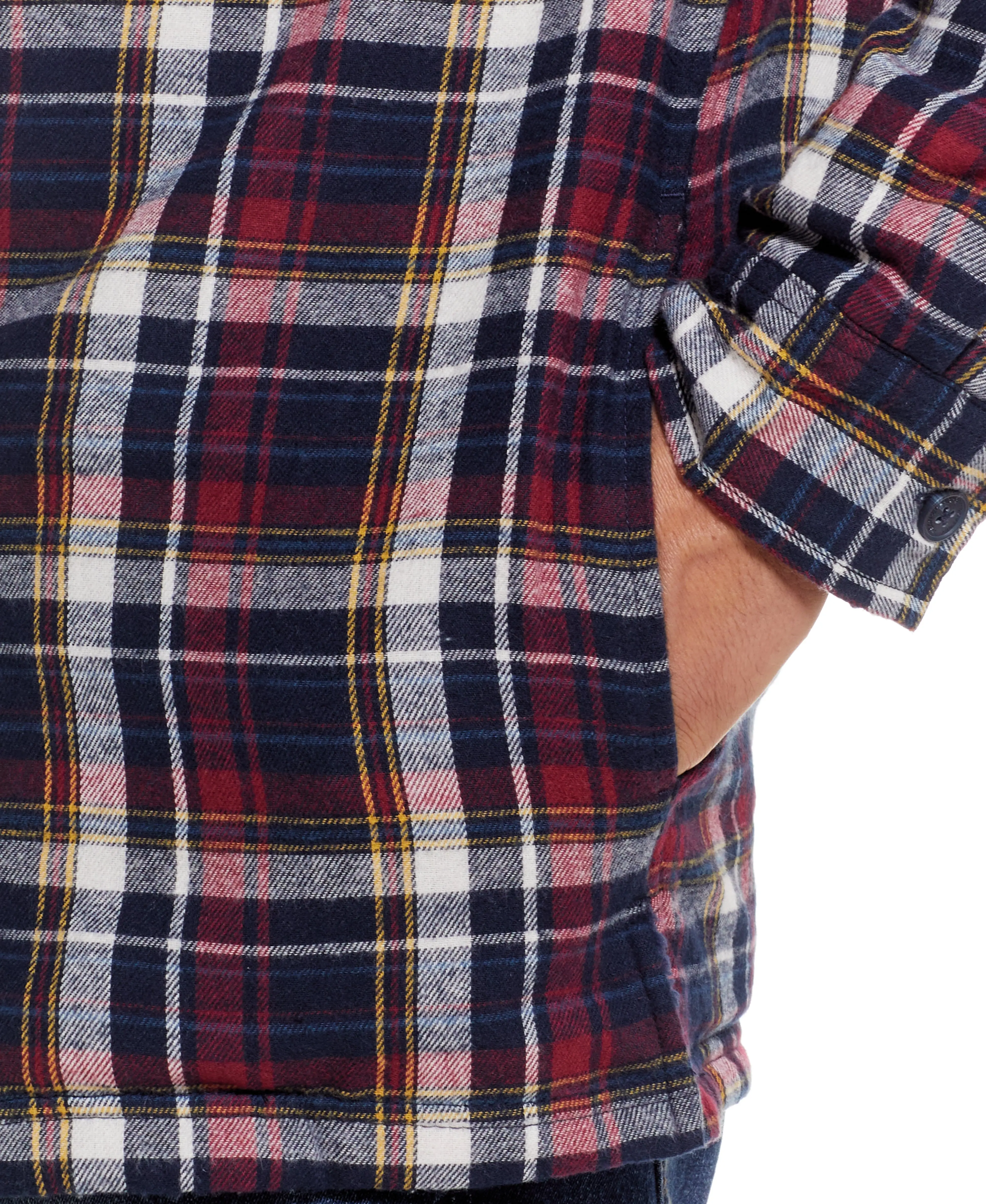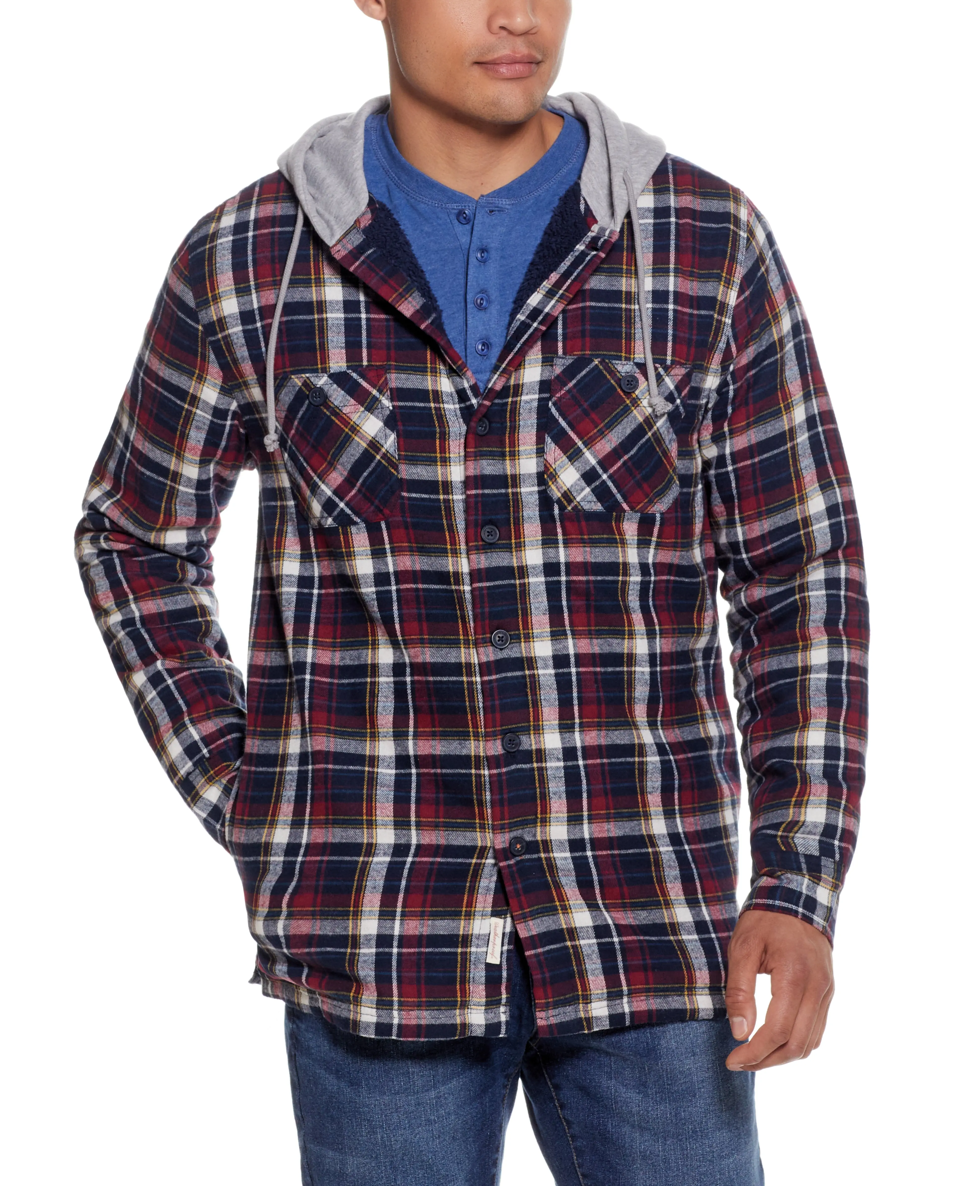 Crafted from rugged twill fabric, the Weatherproof® Vintage Hooded Sherpa Lined Flannel, offers unparalleled comfort while keeping you warm. The regular fit, combined with the hooded neck and button-up closure, embodies your sense of outdoor adventure. Also known as a shacket, this piece bridges the gap between a casual shirt and a structured jacket.
