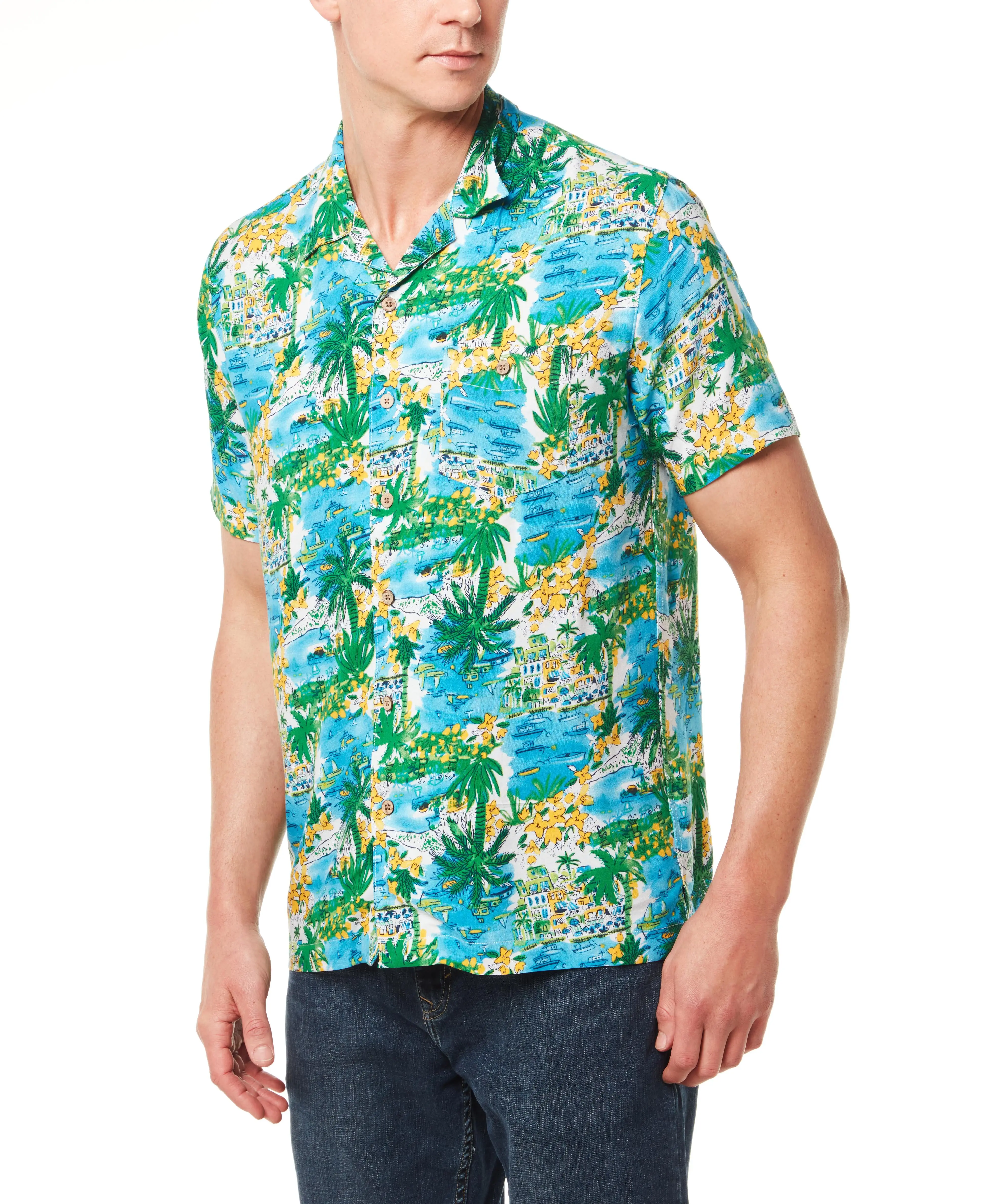 Short Sleeve Rayon Printed Camp Shirt In Blue Tropics