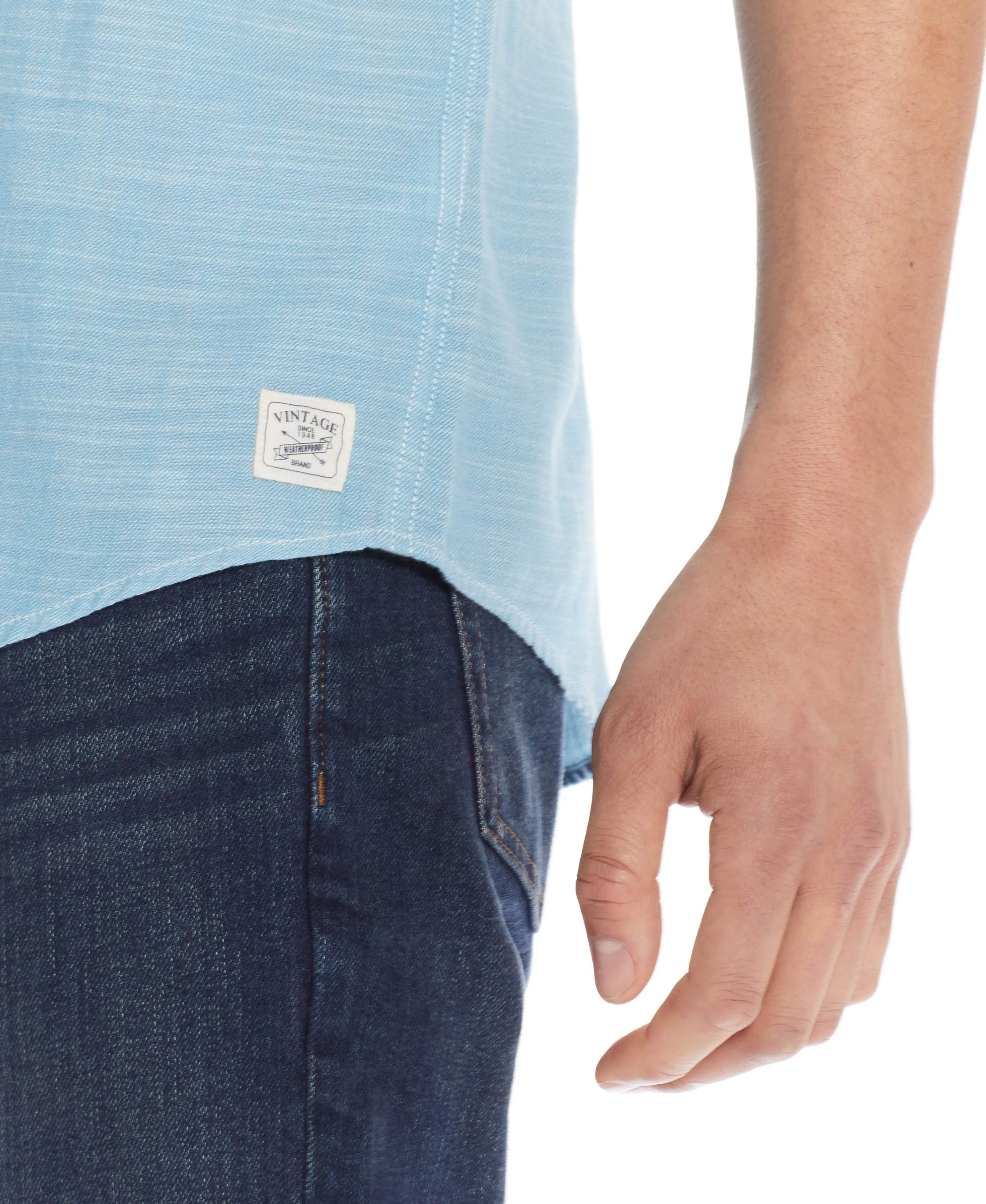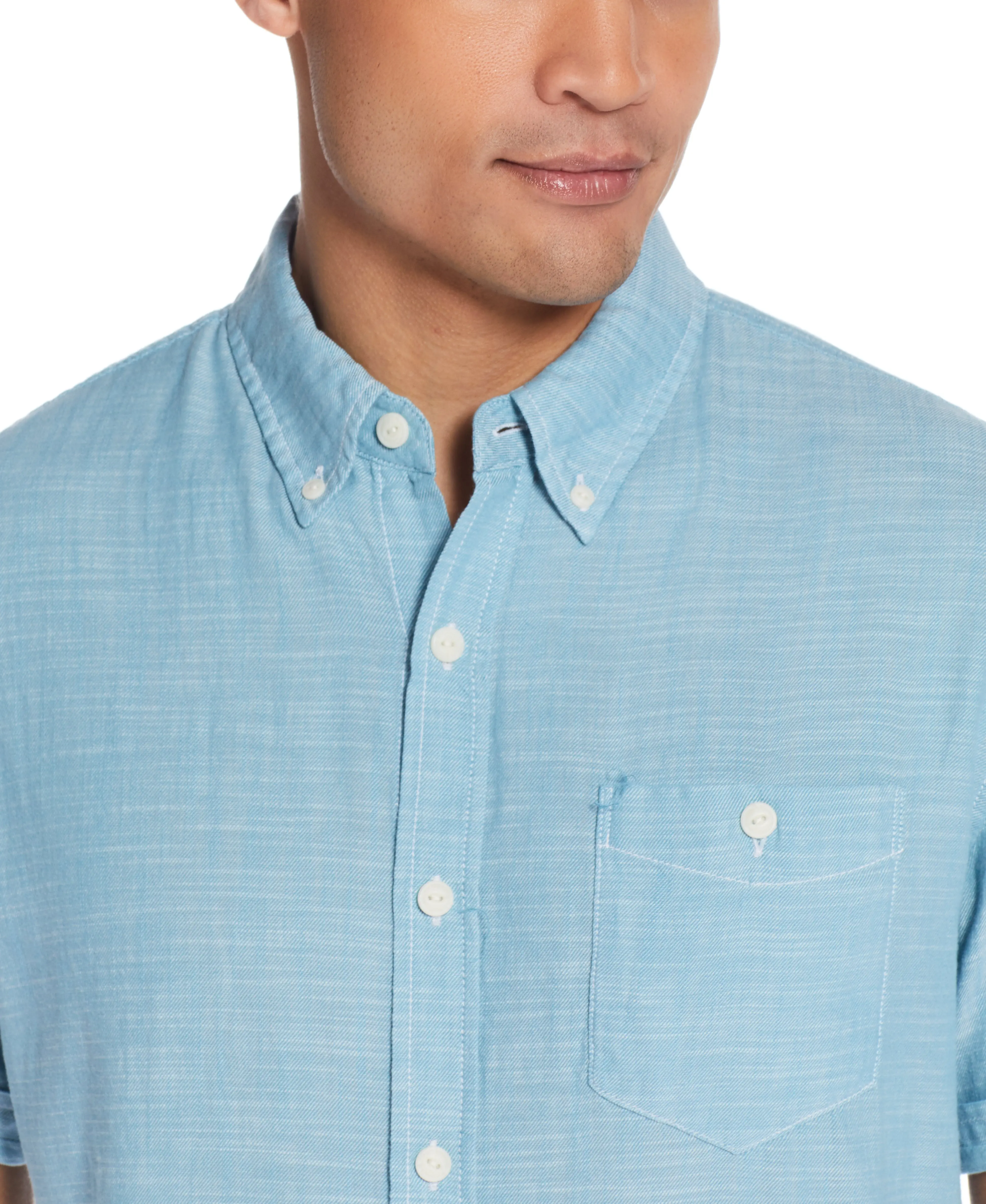 Super Soft Short Sleeve button down with front left chest button pocket, with contrast logo patch at bottom left.