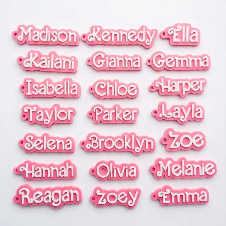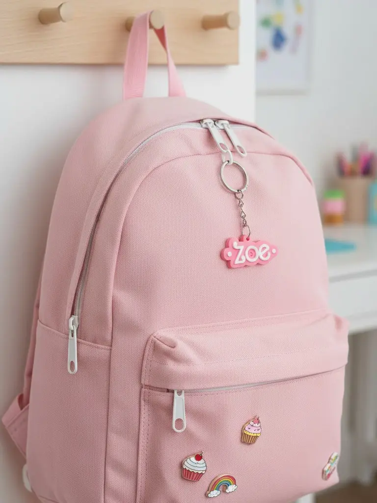 Our Barbie Style Custom Name Keychain features a soft pink background with a clean white name design, giving that iconic, trendy look kids absolutely love. Perfect for school, daycare, or travel, this personalized tag makes every backpack stand out in style.